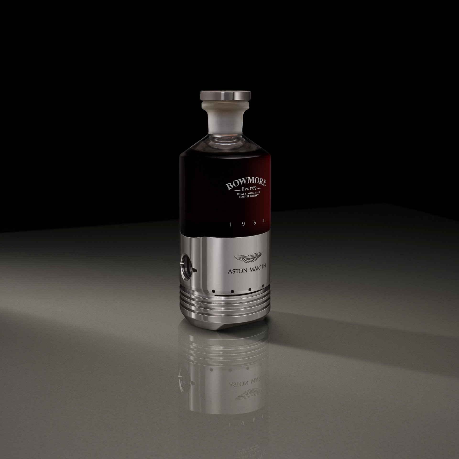 Bowmore® Islay Single Malt Scotch Whisky and Aston Martin have unveiled their first collaborative creation: Black Bowmore DB5 1964. A striking concept which brings together an iconic whisky and a legendary car in a bottle of equal parts, featuring exceptional single malt and a genuine Aston Martin DB5 piston.