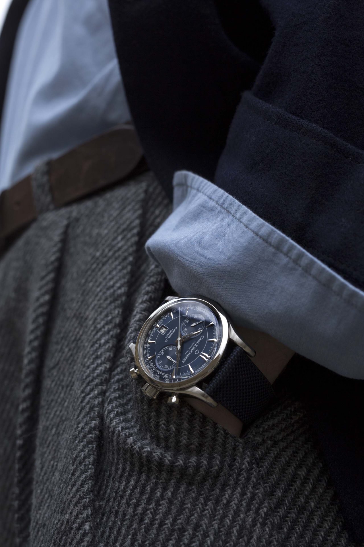The Manero Flyback is powered by the masterfully crafted CFB 1970 automatic movement – the 42-hour power reserve will keep it running even on the longest of journeys. The flyback mechanism allows the timer to be reset and restarted with just a single push – a practical feature that today’s multitasking cosmopolitans truly value in their busy everyday lives, and they will never have to worry about whether their timepiece is keeping time accurately.