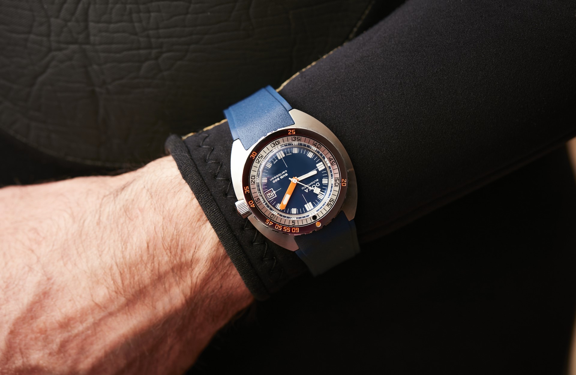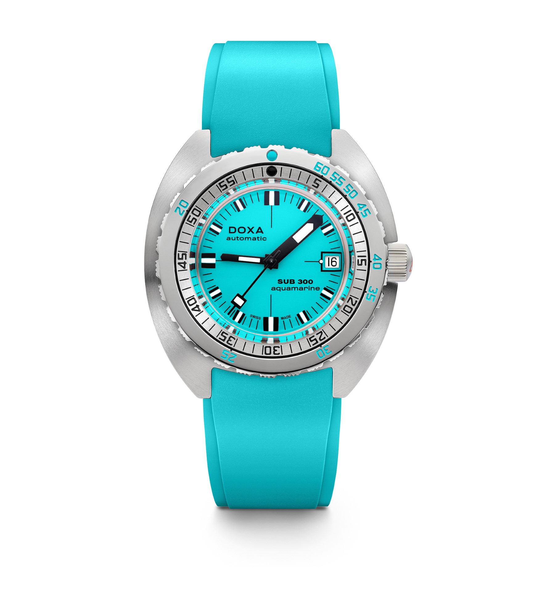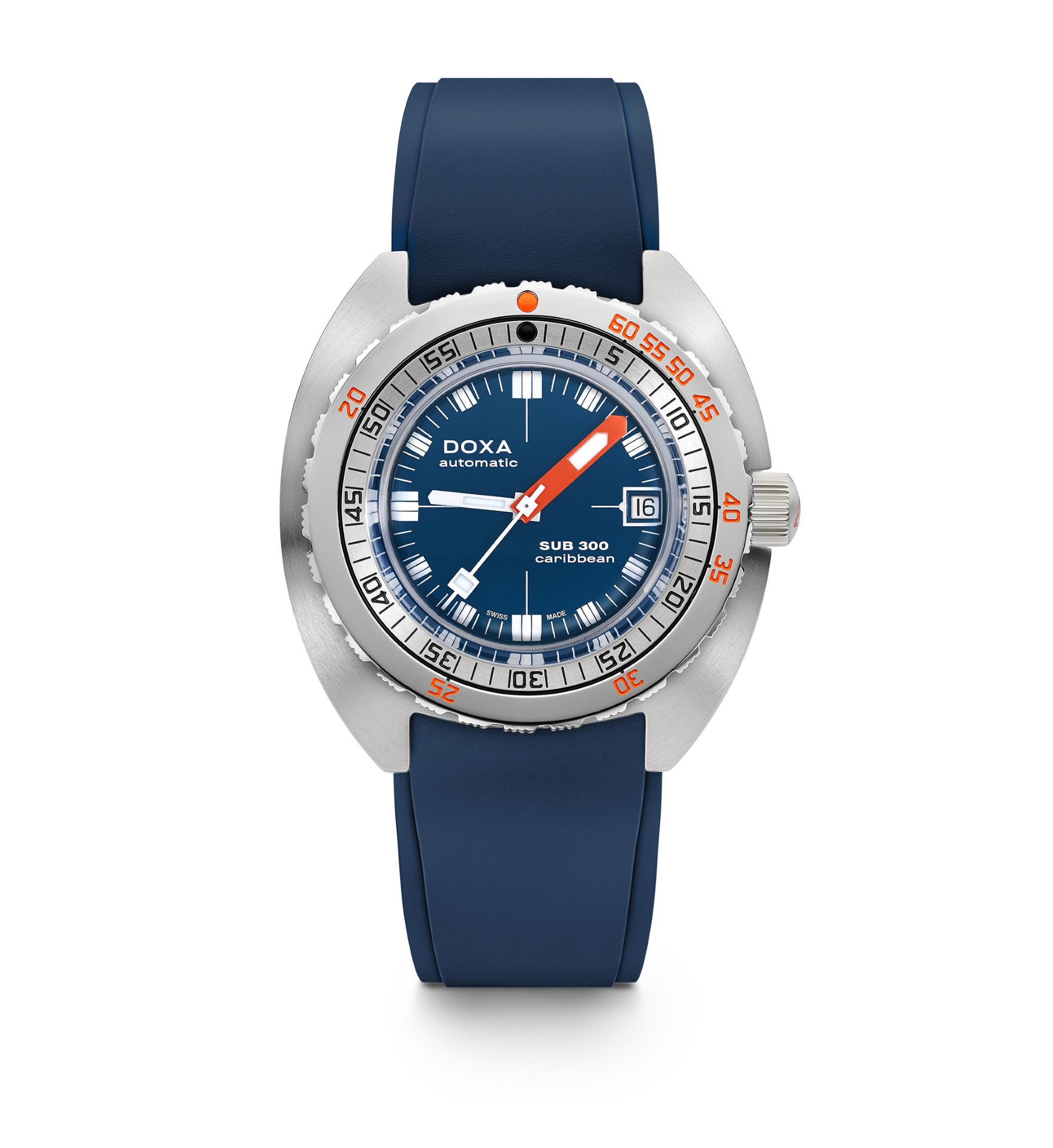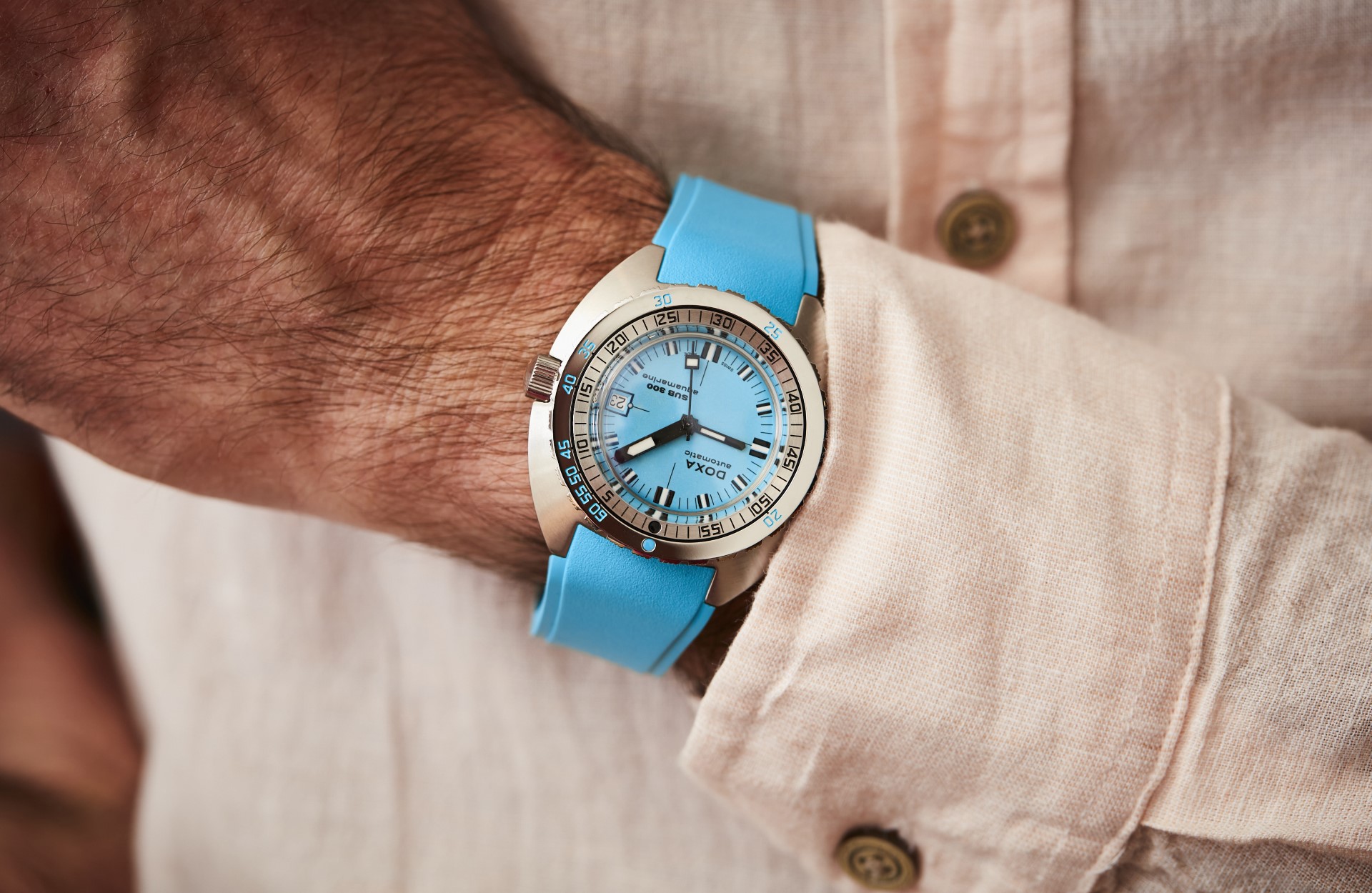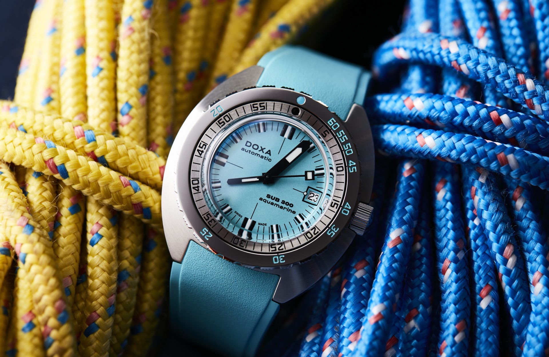 - With shorts and short sleeves or a full-body wetsuit, it’s full colour all the way: The dial is not the only thing to come in different colours; the brand is also introducing matching rubber straps – a DOXA Watches first.