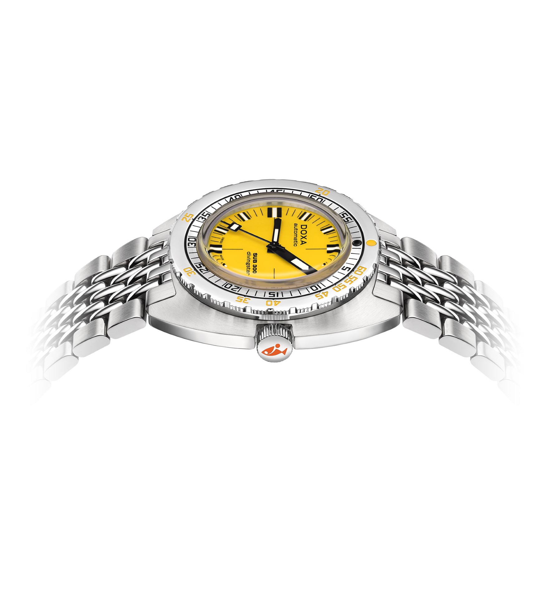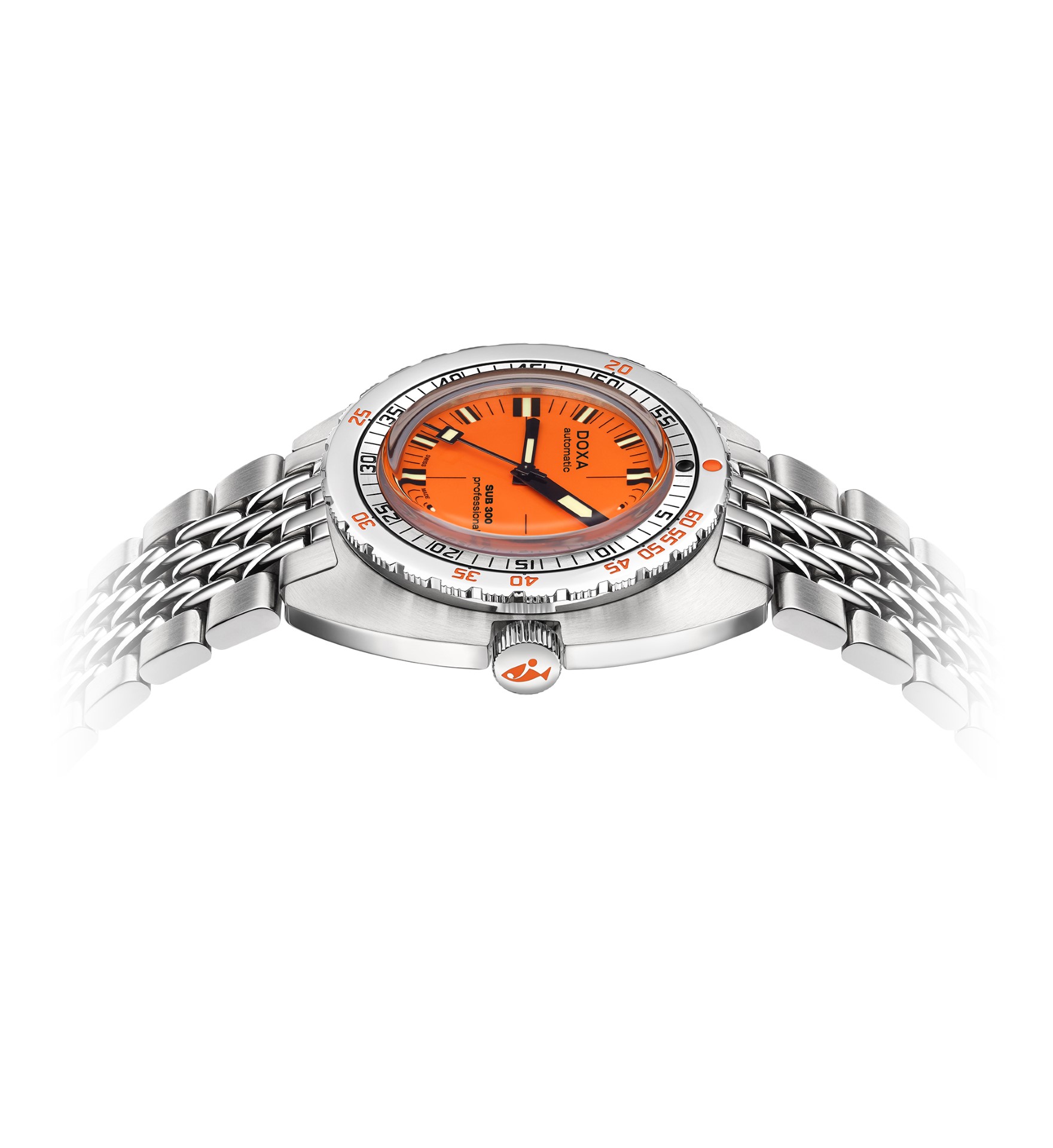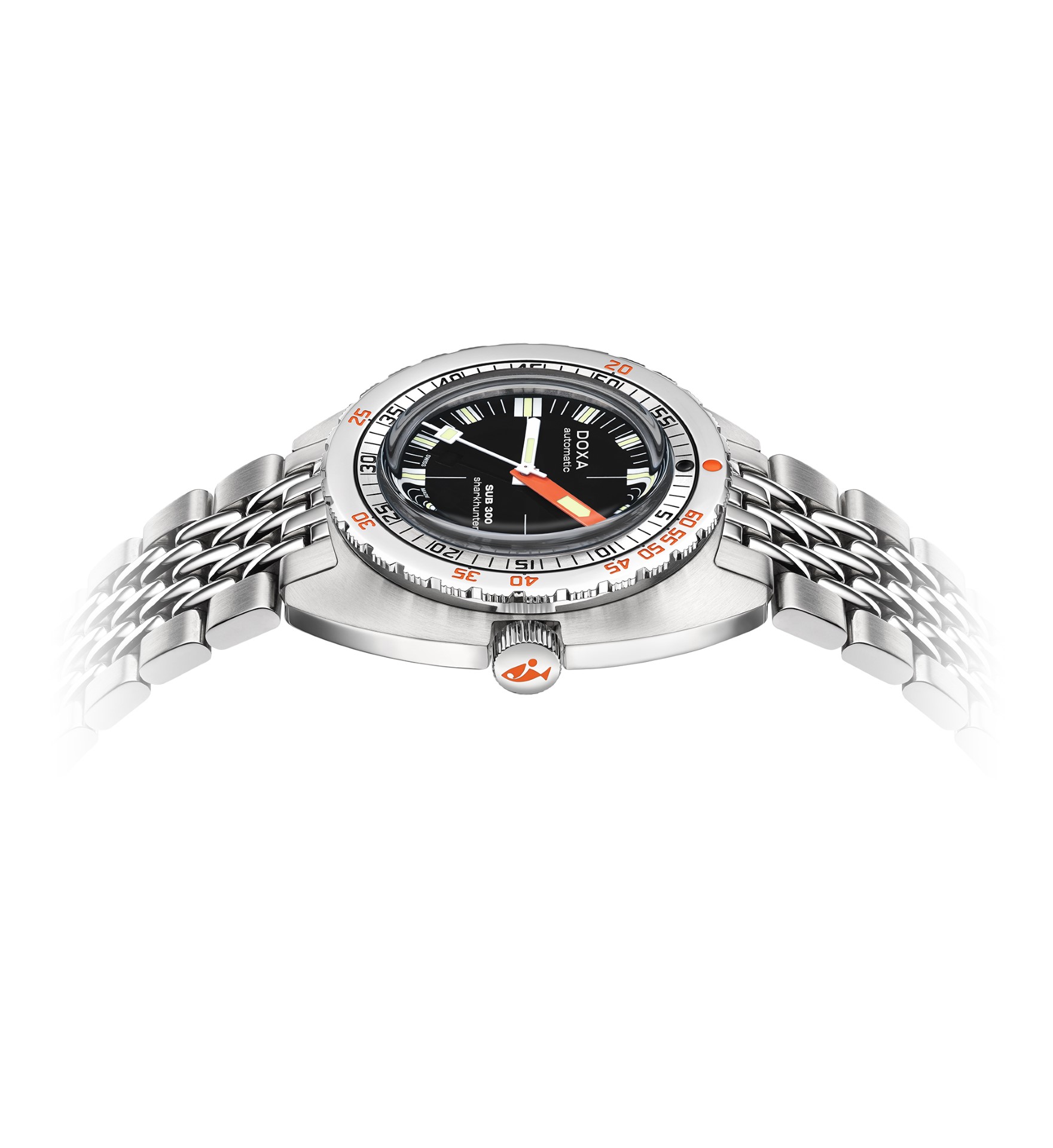- Choice of stainless steel “rice bead” bracelet with folding clasp, exclusive “DOXA fish”, symbol with diver’s extension for quick adjustment to wetsuit