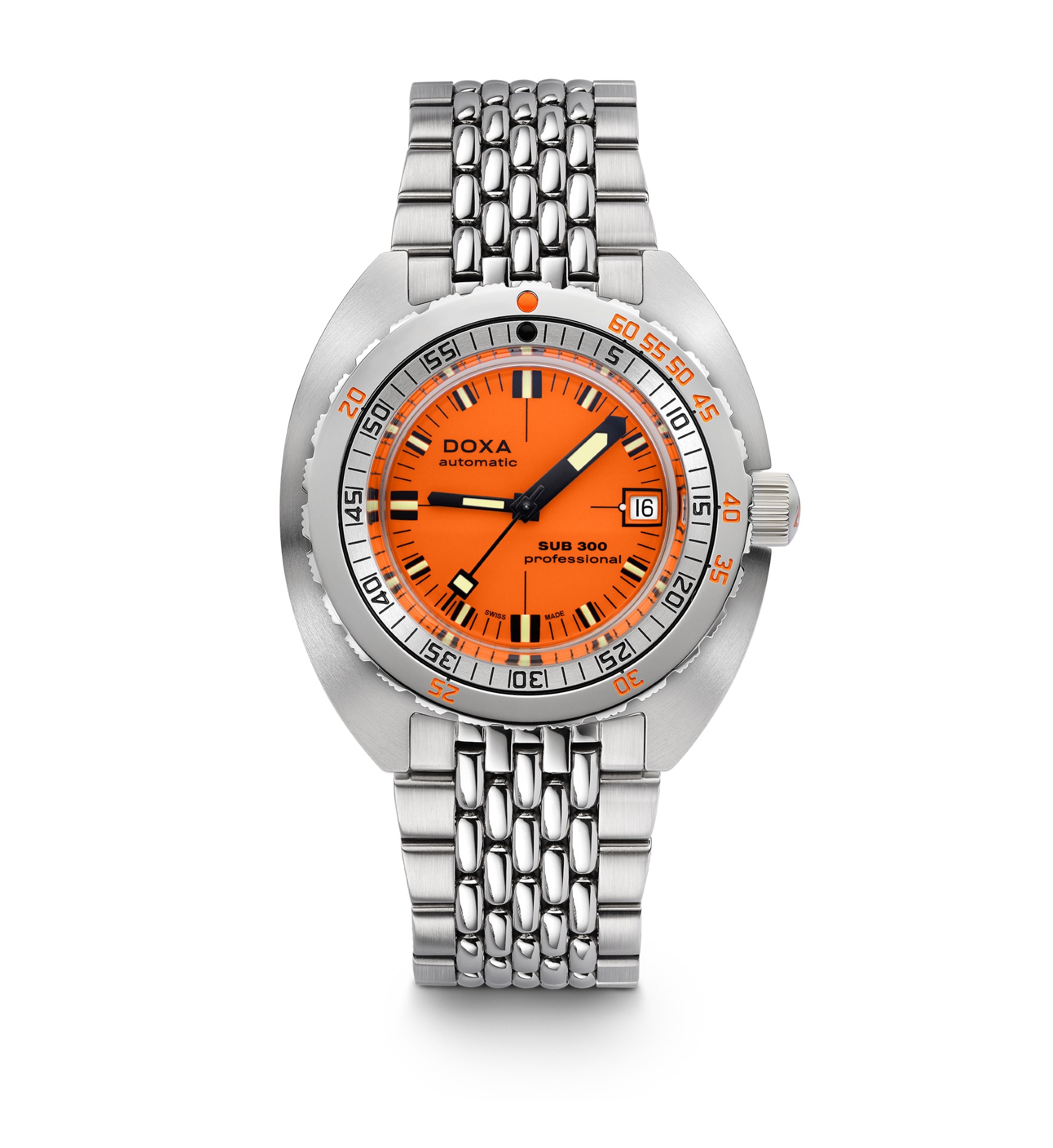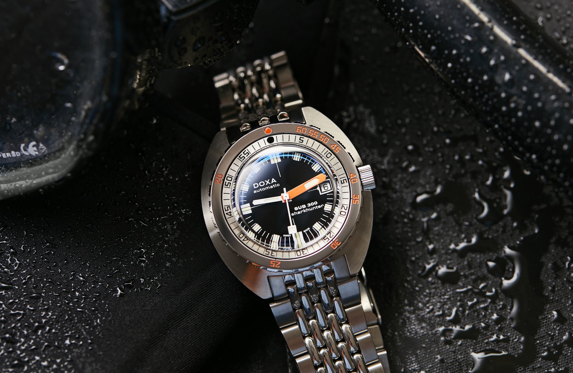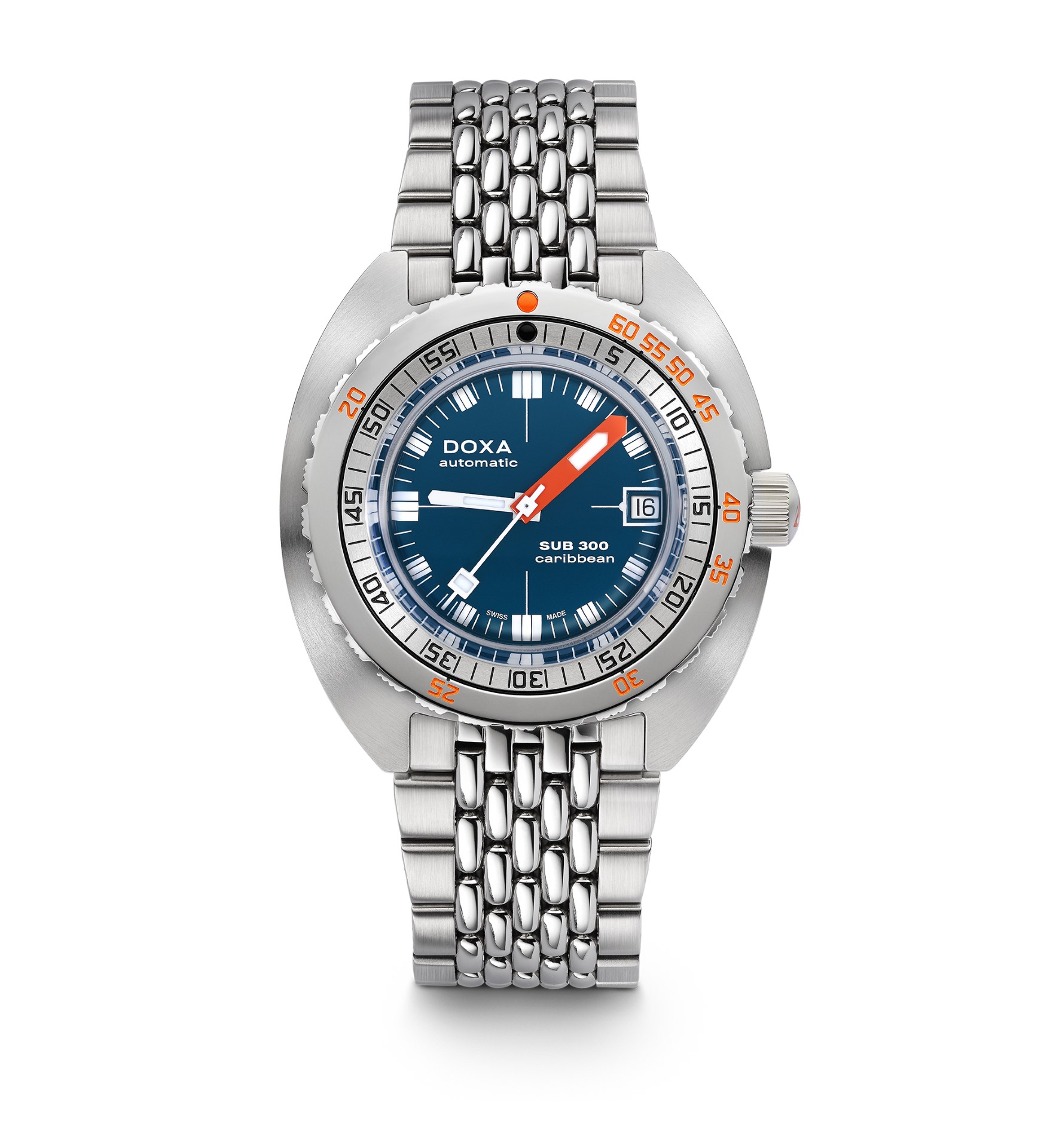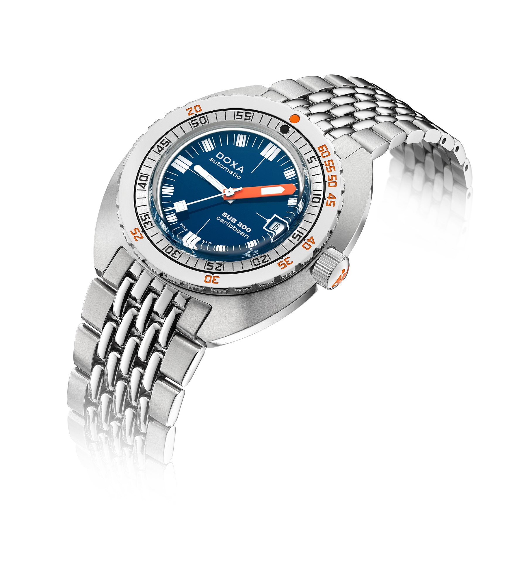 - Choice of stainless steel “rice bead” bracelet with folding clasp, exclusive “DOXA fish”, symbol with diver’s extension for quick adjustment to wetsuit