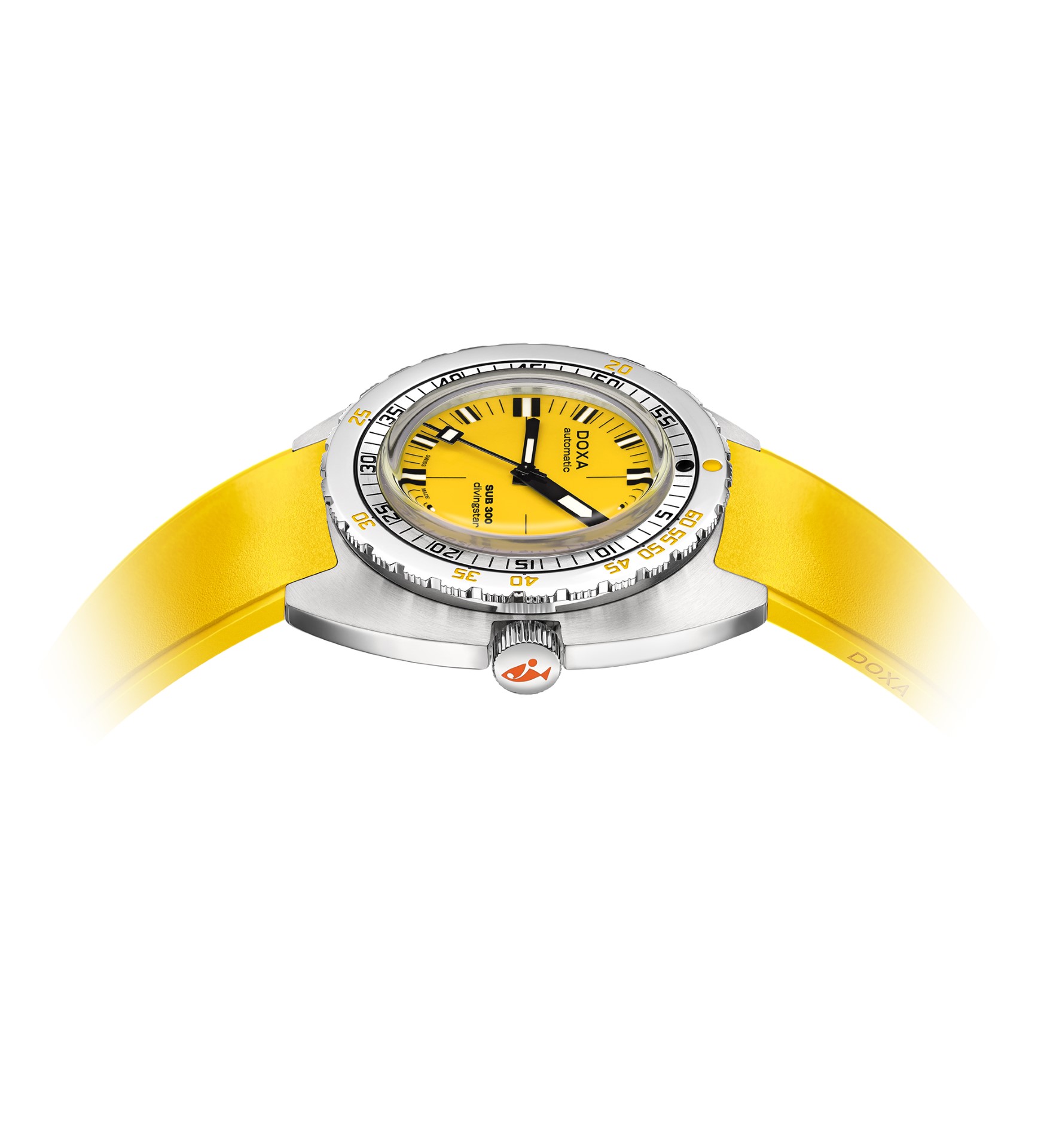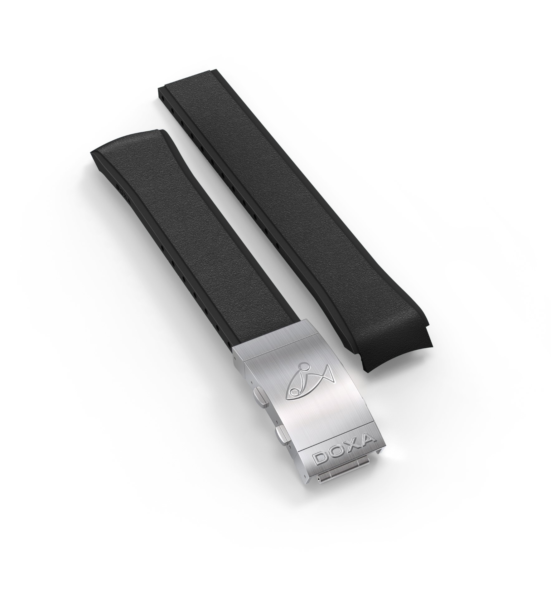 - and black rubber strap or tone-on-tone strap (to match dial color) with folding clasp, exclusive “DOXA fish” symbol, with diver’s extension for quick adjustment to wetsuit