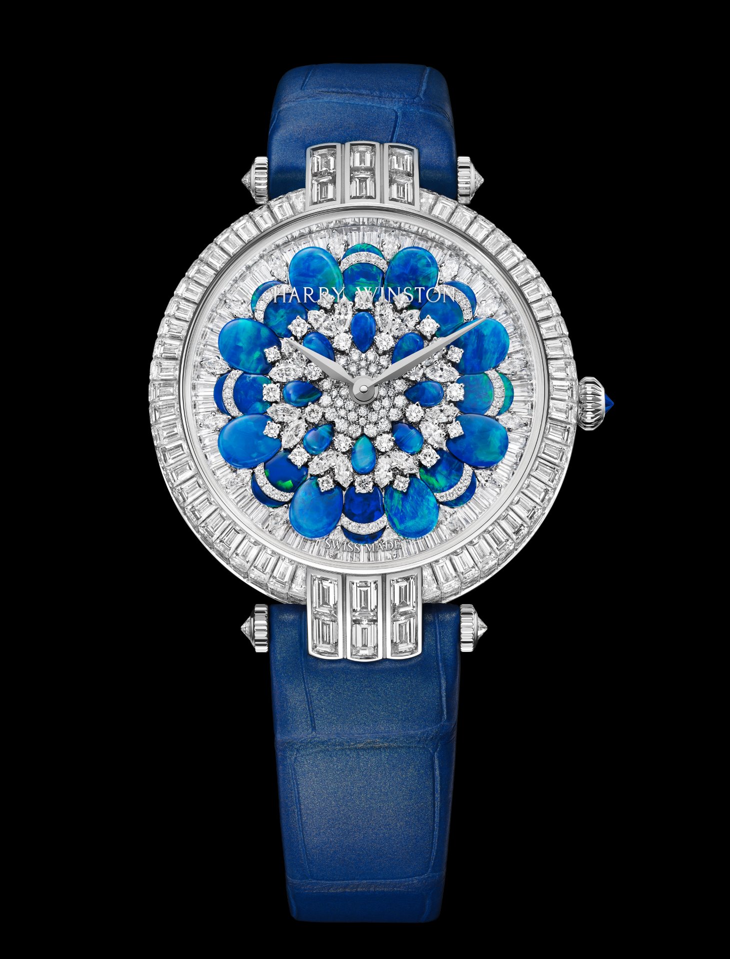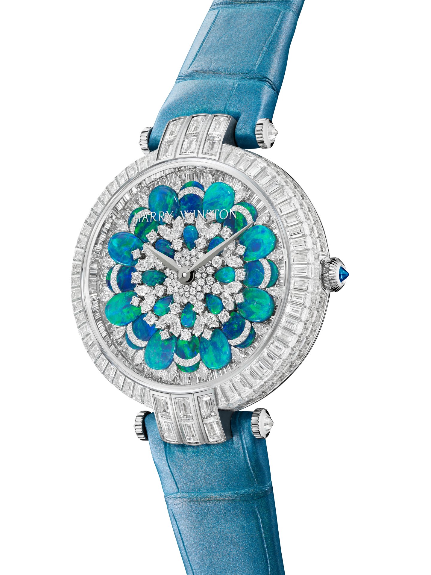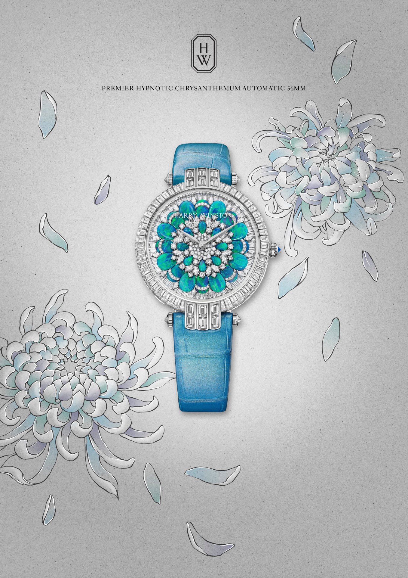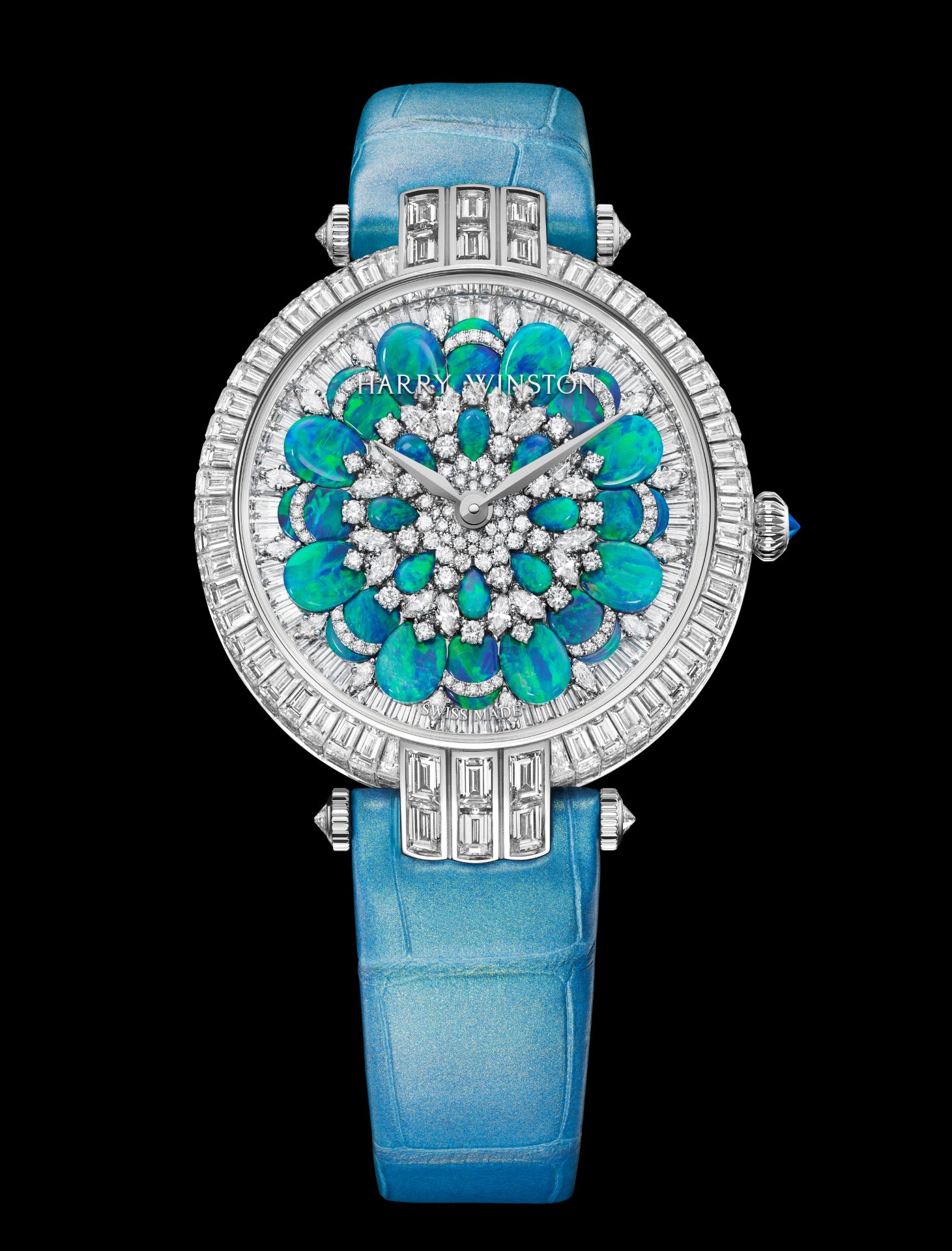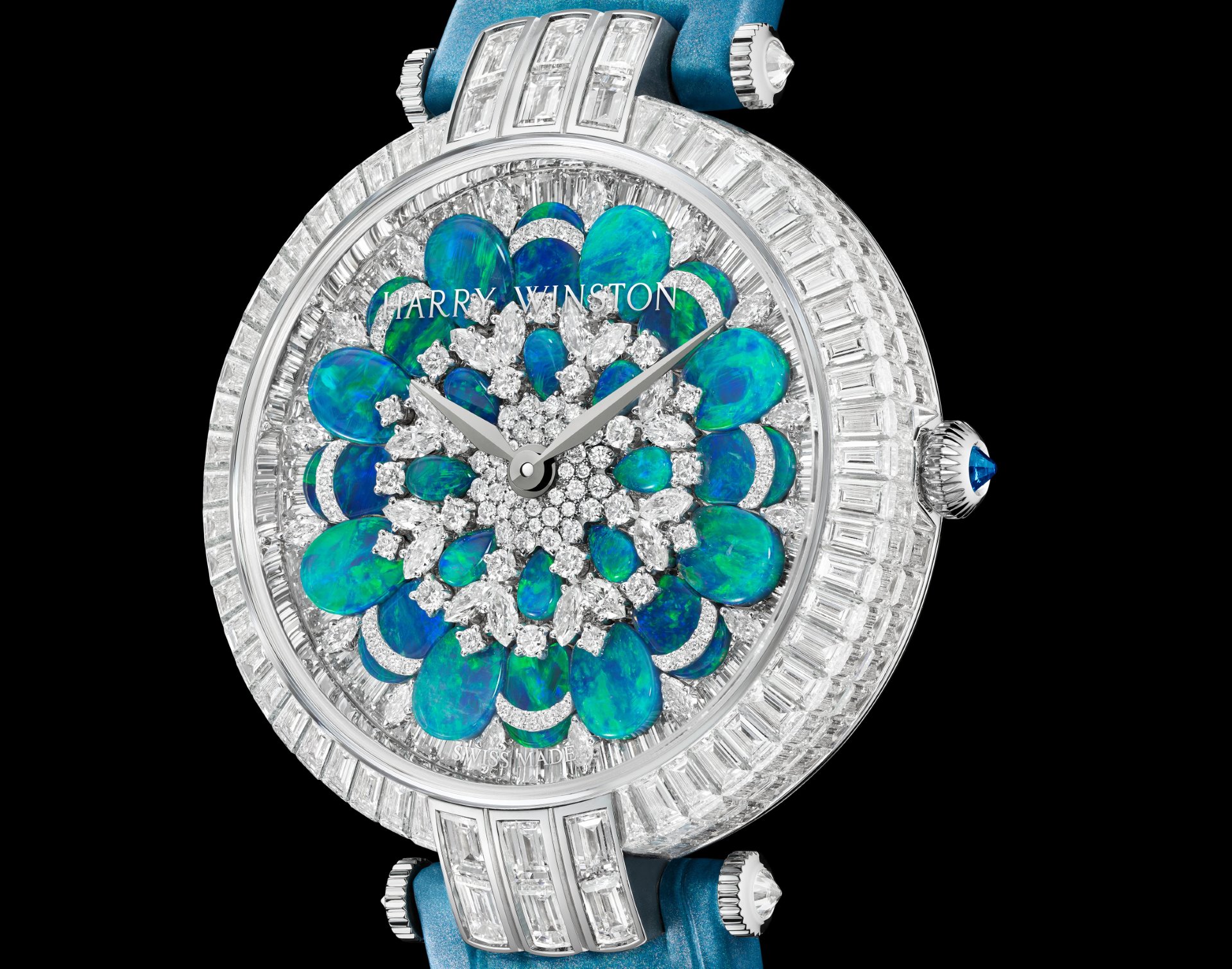 Rising from this majestic diamond platform, 32 marquise-cut and 160 brilliant-cut diamonds are interspersed between the magical opals. Once again, by layering stones of different cuts and sizes, Harry Winston’s talented gem-setters have achieved an incredible sensation of volume. Both models feature ‘peacock’ opals, a name that refers to the multiple tonalities of blue and green. Here, the colour blue – a reference to the House’s brand colour – plays a dynamic, ever-changing game, alternating from deep midnight blue to neon turquoise and from shimmering aqua to luminous green, depending on the light.Harry Winston Premier Hypnotic Chrysanthemum Automatic 36mm