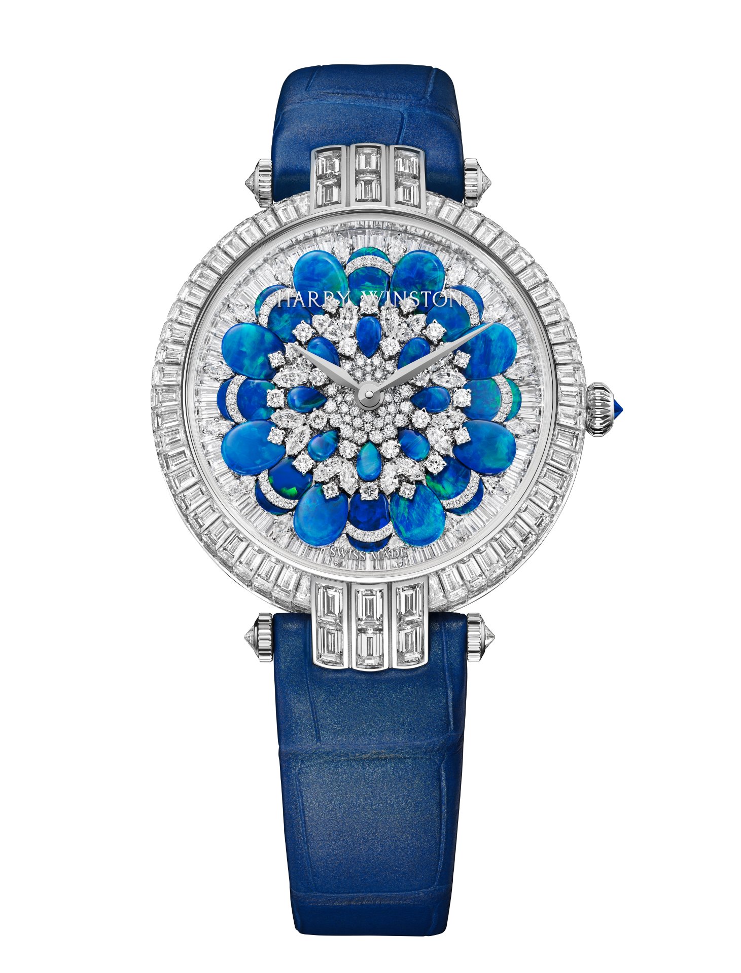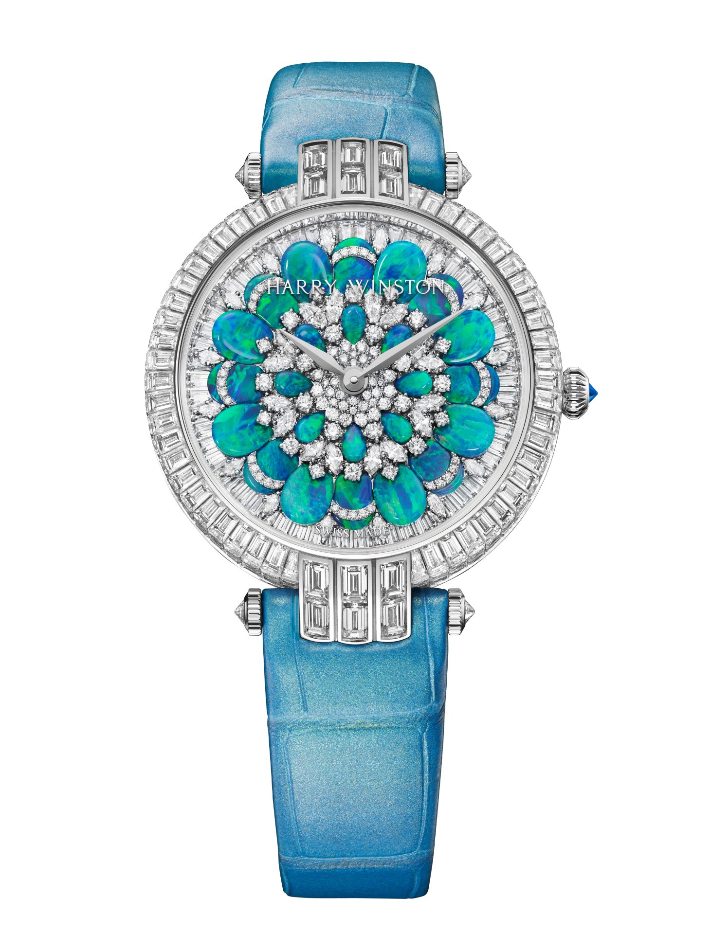 Bursting with intense blue and green colour, the spectacular opals are enhanced by the neighbouring, carefully set white diamonds. To create great depth on the dial, Winston designers worked with unique layers and gem-setting techniques. The first layer is composed of 60 baguette-cut diamonds set on an 18-karat gold base.