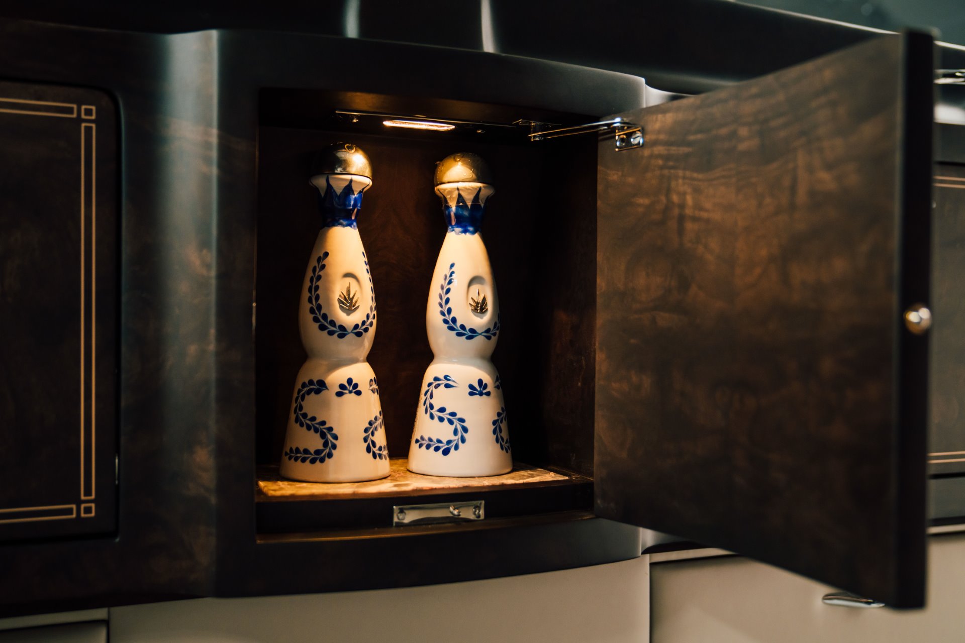 Two screens are integrated behind the privacy division’s picnic tables allowing rear occupants to watch films and mirror screens from mobile devices. A bar service occupies the centre of the unit and has been custom built to perfectly fit the owner’s favourite brand of tequila. Every Lunaz client will be invited to specify dimensions for their beverage of choice.