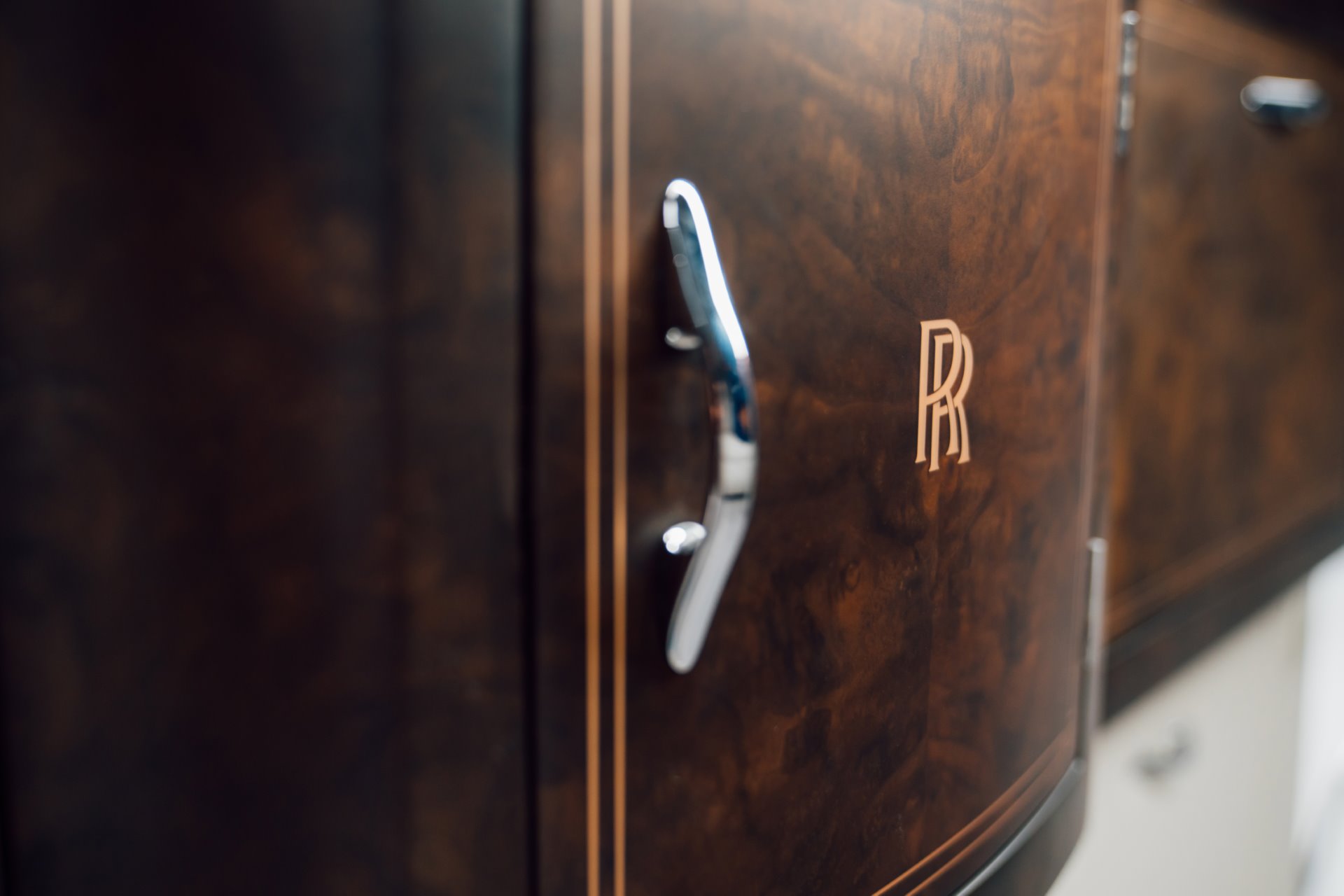 The original woodwork has been painstakingly restored and finished with a contemporary satin treatment. This sympathetic update is offset with rose gold inlays. This approach extends to the door cappings, front fascia and the picnic table backs affixed to the privacy division that separates the driver and rear passenger compartment.