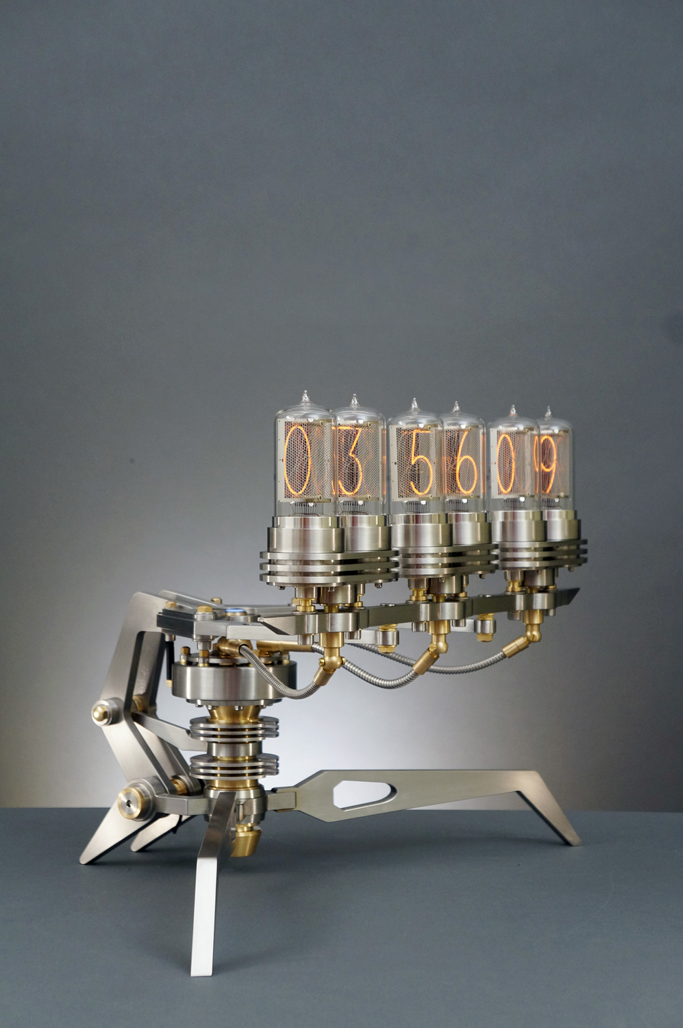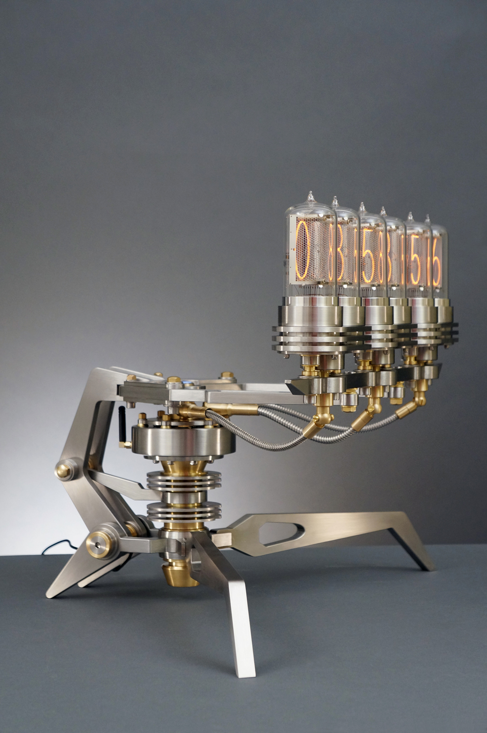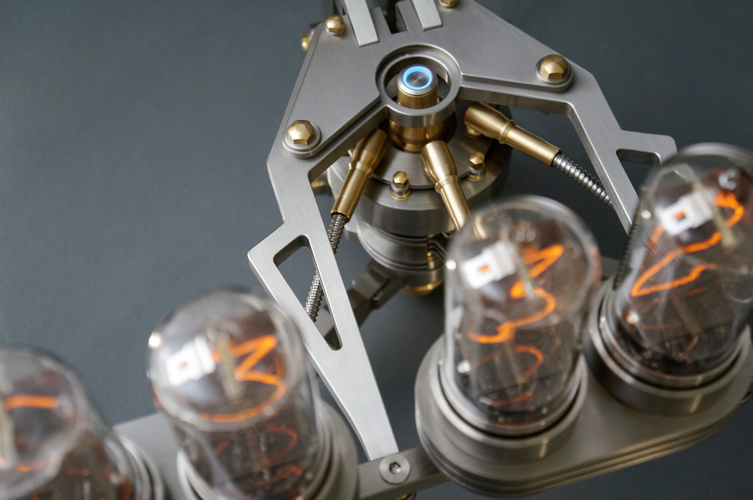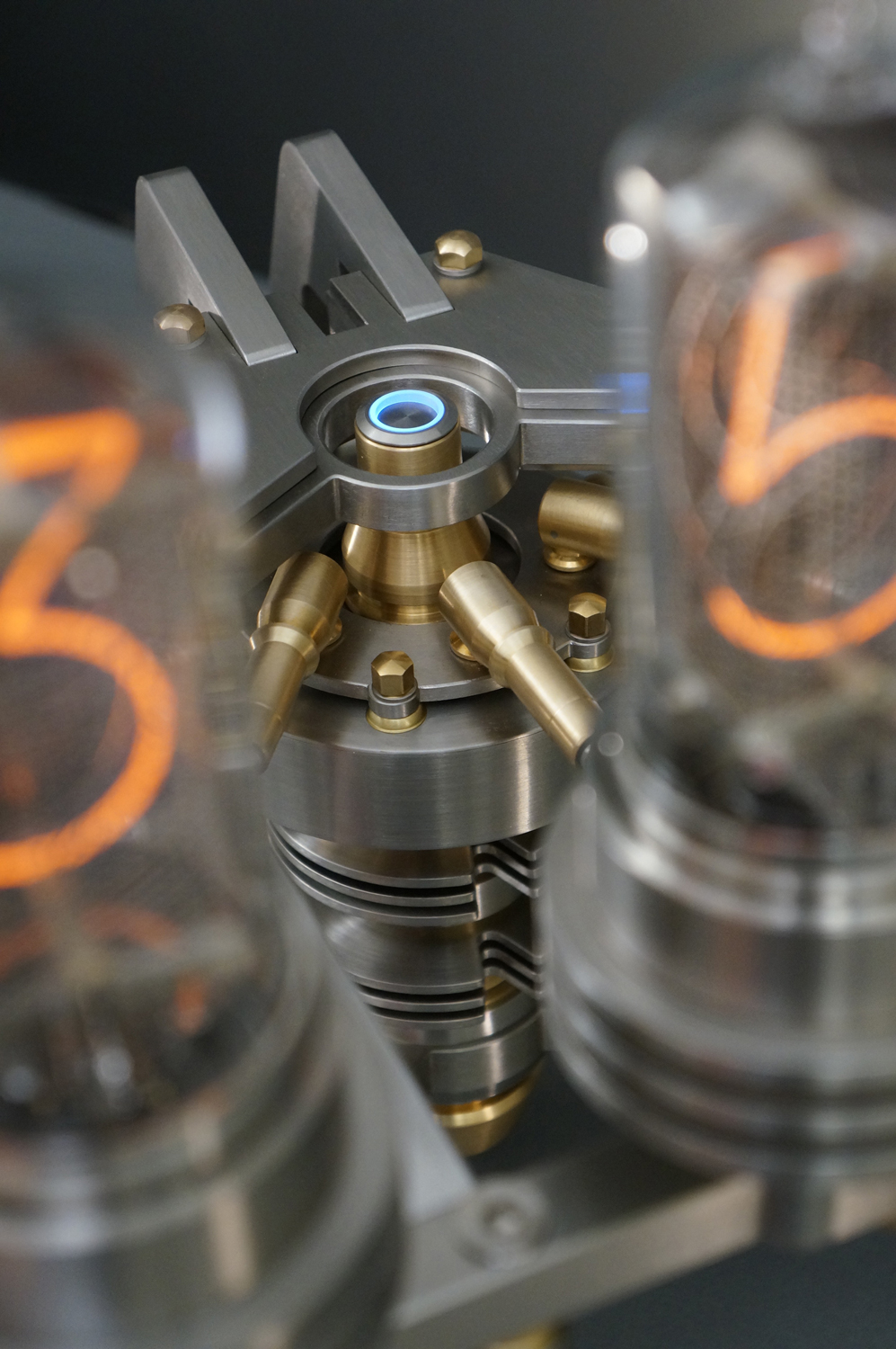 At first glance, the succession of six Nixie tubes seem to hover above the substructure, pulling the eye instinctively inwards to the numeric information floating within the confines of each glass bulb. Closer scrutiny reveals piece by piece the intrinsic principles comprising the quintessential structure of the machine: a duo-support bracket riveted with massive steel bolts, steel and brass discs to the solid base construction and a central cylindrical tower. Extending from the duo-support bracket is the additional structural support, holding the row of tubes like arms, which ‘hand over’ time to the viewer.