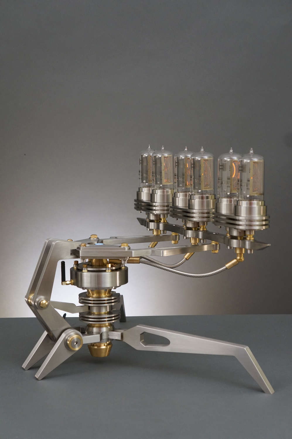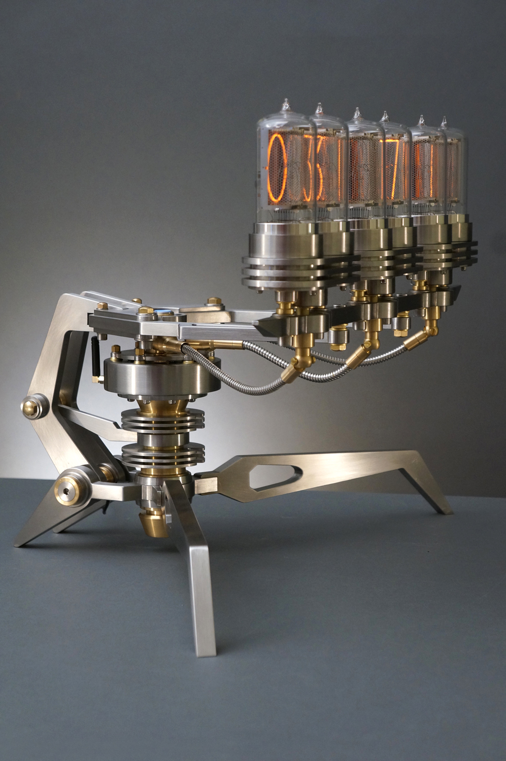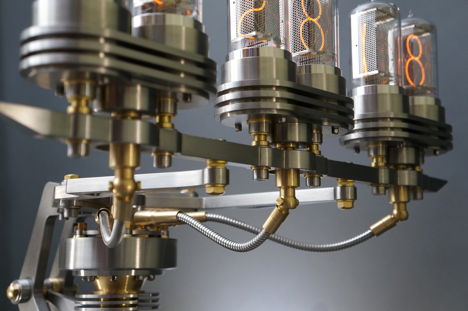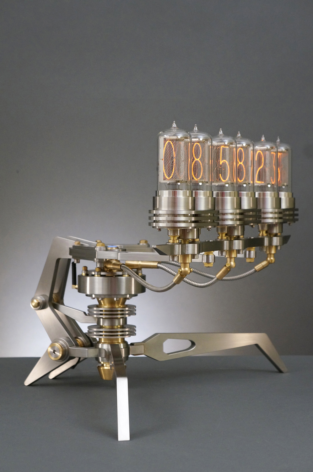 At first glance, the succession of six Nixie tubes seem to hover above the substructure, pulling the eye instinctively inwards to the numeric information floating within the confines of each glass bulb. Closer scrutiny reveals piece by piece the intrinsic principles comprising the quintessential structure of the machine: a duo-support bracket riveted with massive steel bolts, steel and brass discs to the solid base construction and a central cylindrical tower. Extending from the duo-support bracket is the additional structural support, holding the row of tubes like arms, which ‘hand over’ time to the viewer.