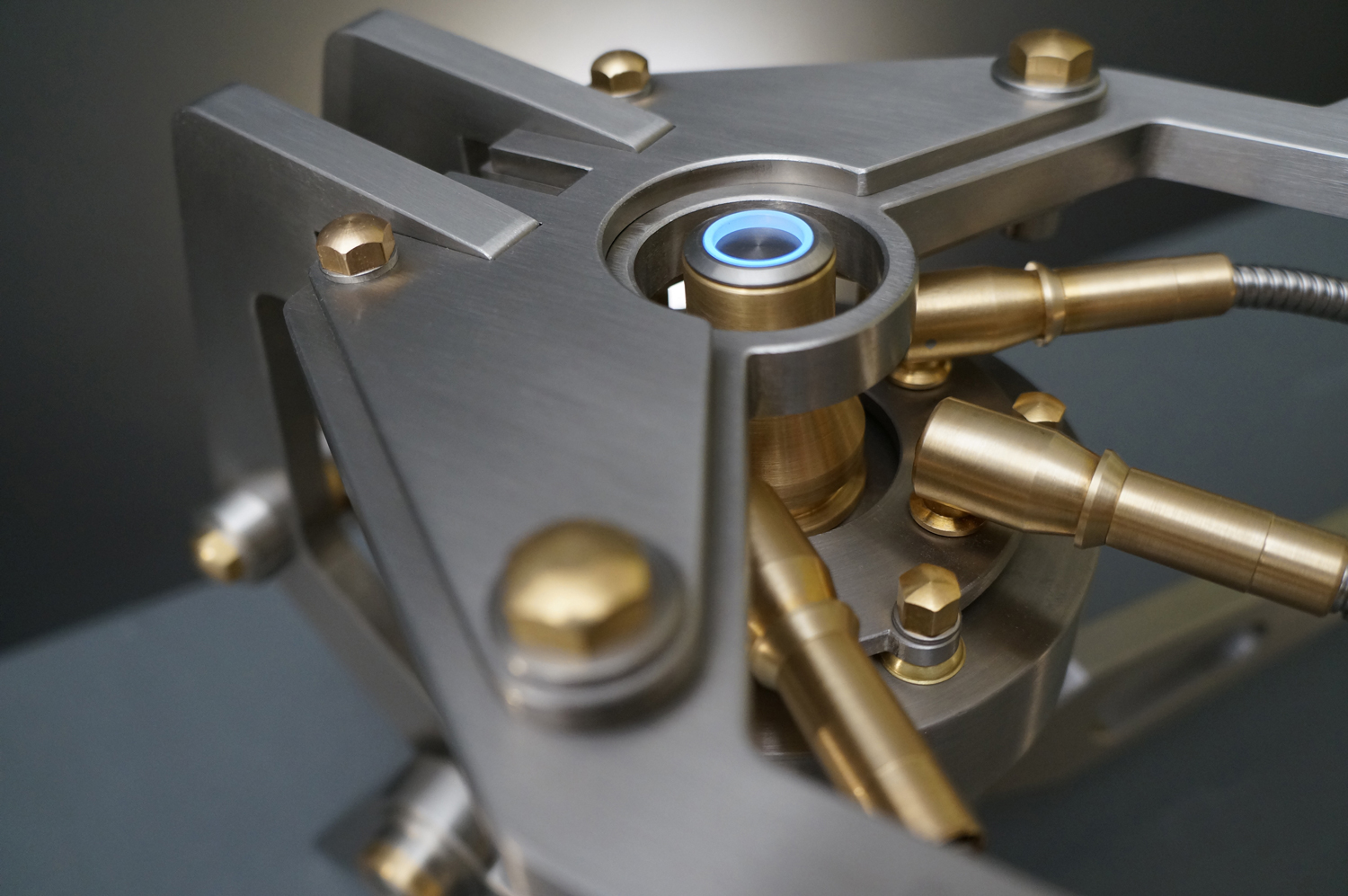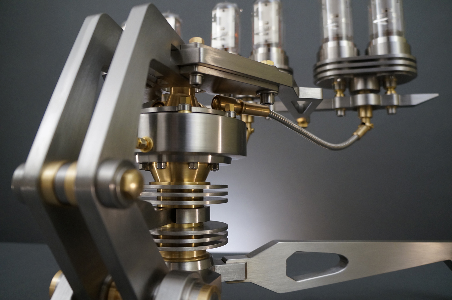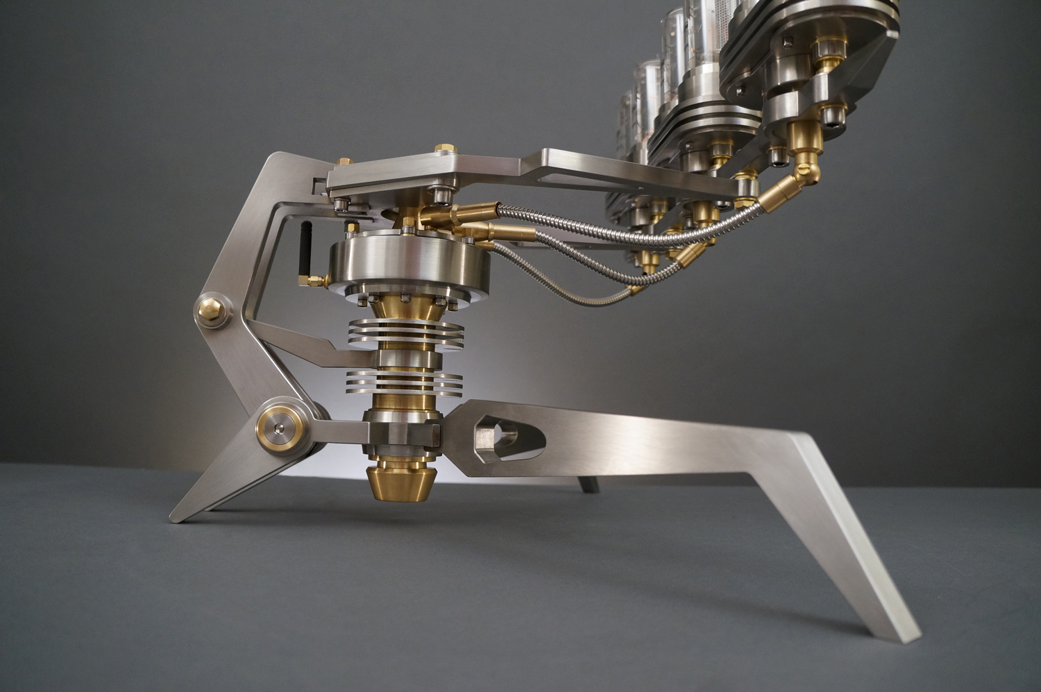 Flexible metal hoses feed the Nixie tubes energy and information from the electronic core of the machine, which houses also the main central switch, illuminated like a blueish preternatural ‘eye’. The special design of this third edition of the Nixie Machine necessitated the development of a new electronic circuit board with circuit components and 66 contact pins compressed onto a small round surface corresponding to the size of the machine’s central body. This innovation was no small feat for Dalibor Farny, creator and engineer of the repurposed Nixie tubes and collaborator with Frank Buchwald on Nixie Machines II and III.