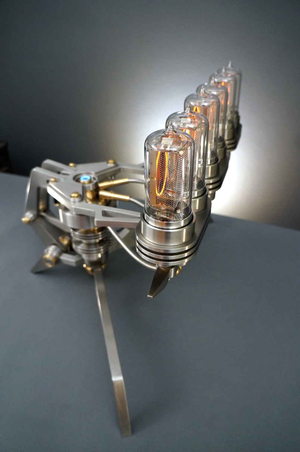 Frank Buchwald’s “Machine Lights”, an impressive collection of hand-crafted lamps, were part of the initial line-up of artists showcased at the inauguration of the first M.A.D.Gallery in Geneva. They have inspired the admiration of MB&F founder Maximilian Büsser from the start, landing Buchwald’s work a permanent exhibit at the M.A.D.Galleries. The first “Nixie Machine” followed a few years later: a clock created around vintage Nixie tubes, following the same alien-like, sci-fi aesthetic.
