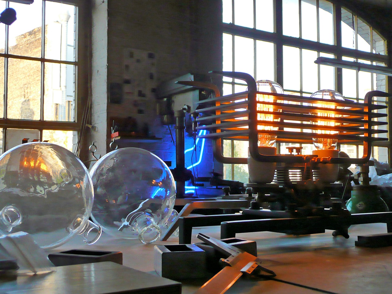 Farny handcrafts his Nixie tubes in a studio that looks like a cross between a laboratory and workshop located inside an old castle near Topolna in the Czech Republic. The rooms are loaded with numerous technical devices, including gas torches, neon gas bottles, spot welding machines, vacuum pumps, leak detectors, and many more instruments important for the precise and perfect production of vacuum Nixie tubes.
