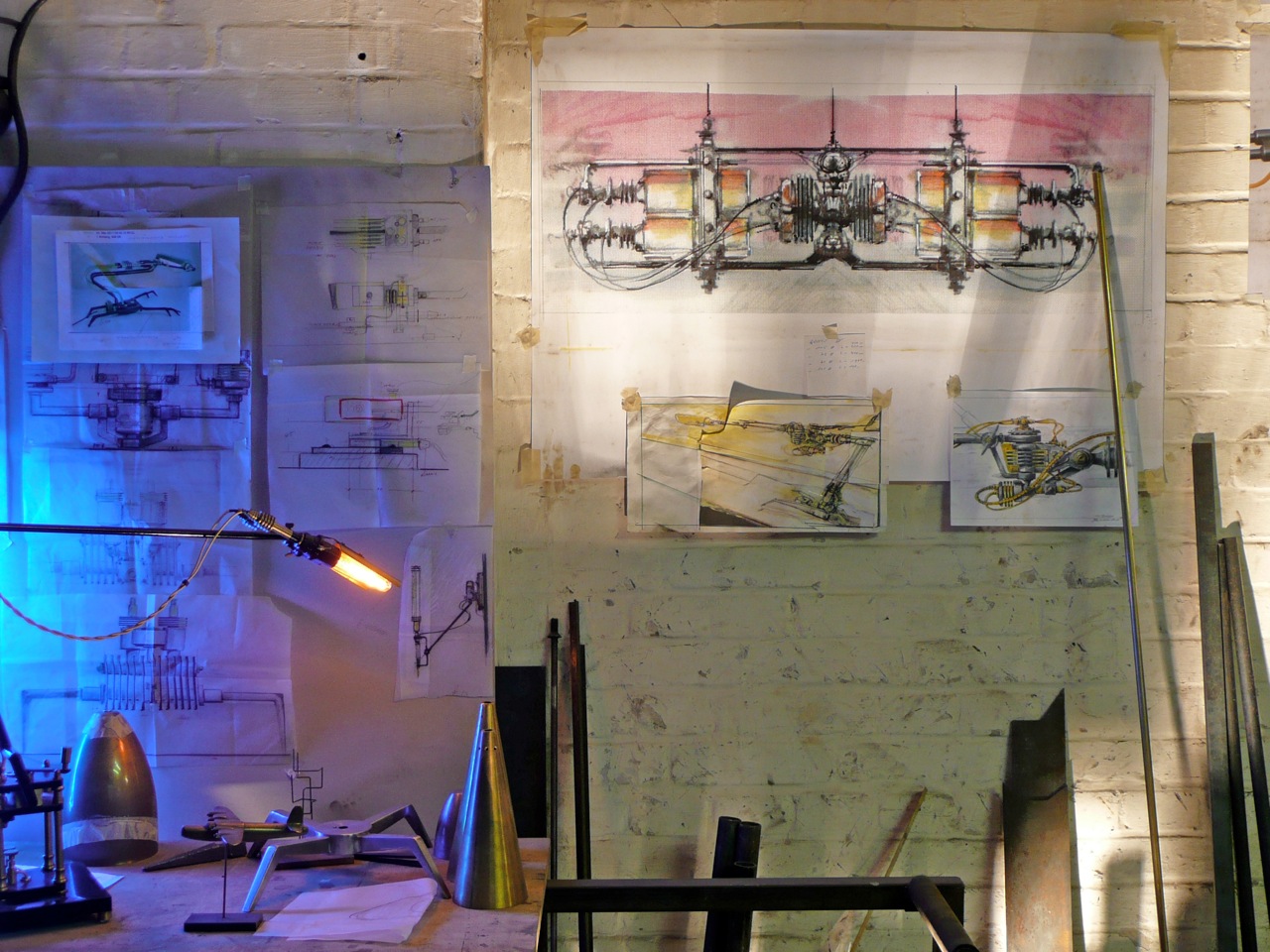 Buchwald’s studio, where he meticulously creates everlasting objects, is located in Berlin inside an old-time industrial building outfitted with bricks, large windows, dark staircases, antique electric switches, and visible scars from World War II. The entrance is stuffed with steel bars and metal plates. In the heart of his studio, the walls are lined with comprehensive sketches and work tables covered with lathes, welders, and hand tools – all the skilled artist needs to imprint his characteristic look onto raw materials.