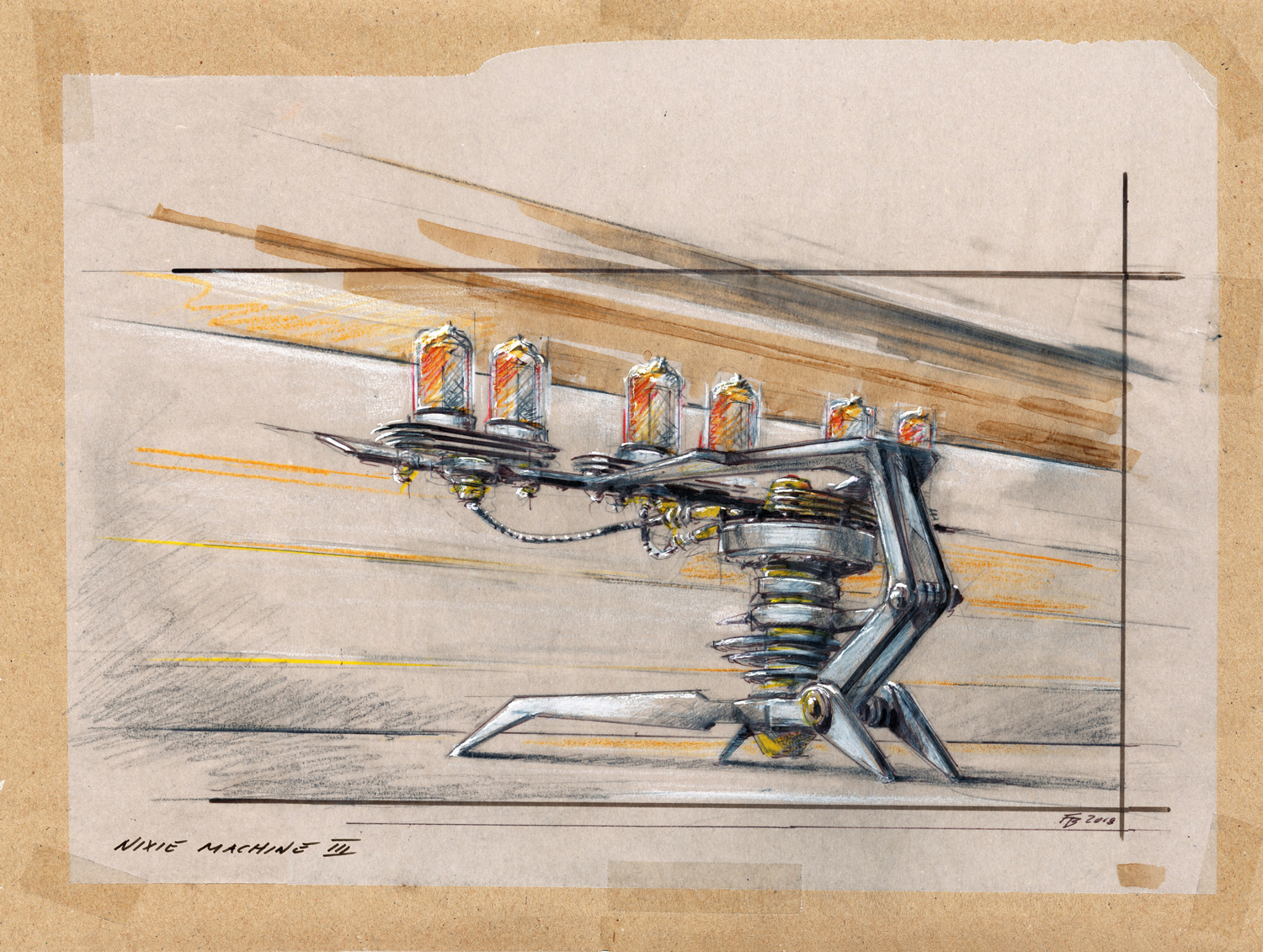 Forging onwards from the first and second editions of the Nixie Machine series, this third – and final – Nixie Machine consolidates Frank Buchwald’s design and structural principles into a futuristic work of art whose dynamic emphasis is dominated by the machine-like character of the design: the form is compact and vigorous and the proportions perfectly executed.