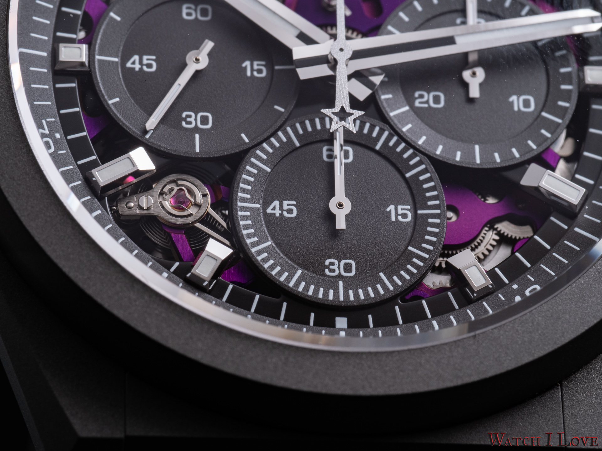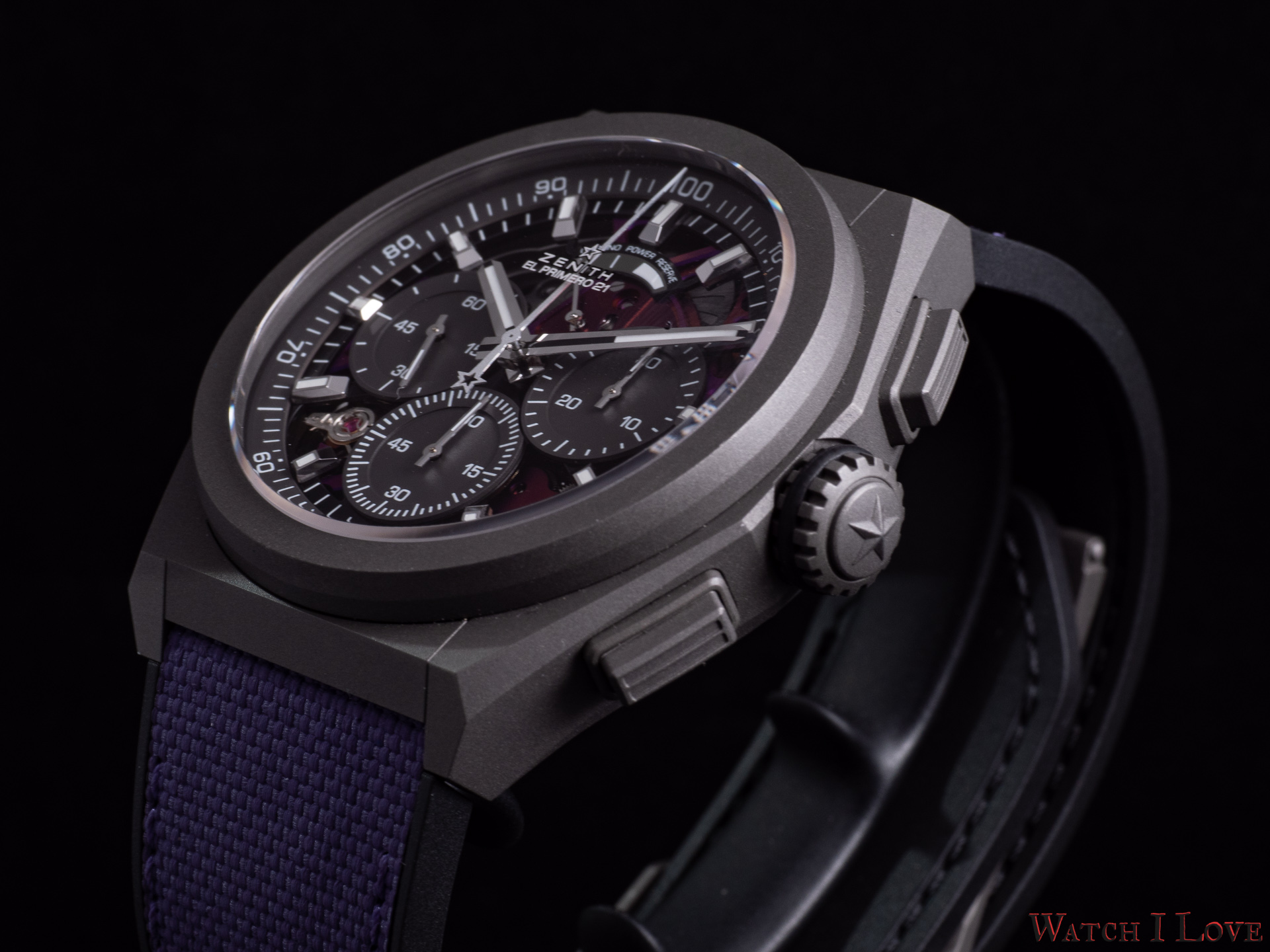 Defy 21 Ultraviolet comes with an open dial that reveals the beautiful colour of the movement. Zenith used grey for the dial’s elements, to match the case look.