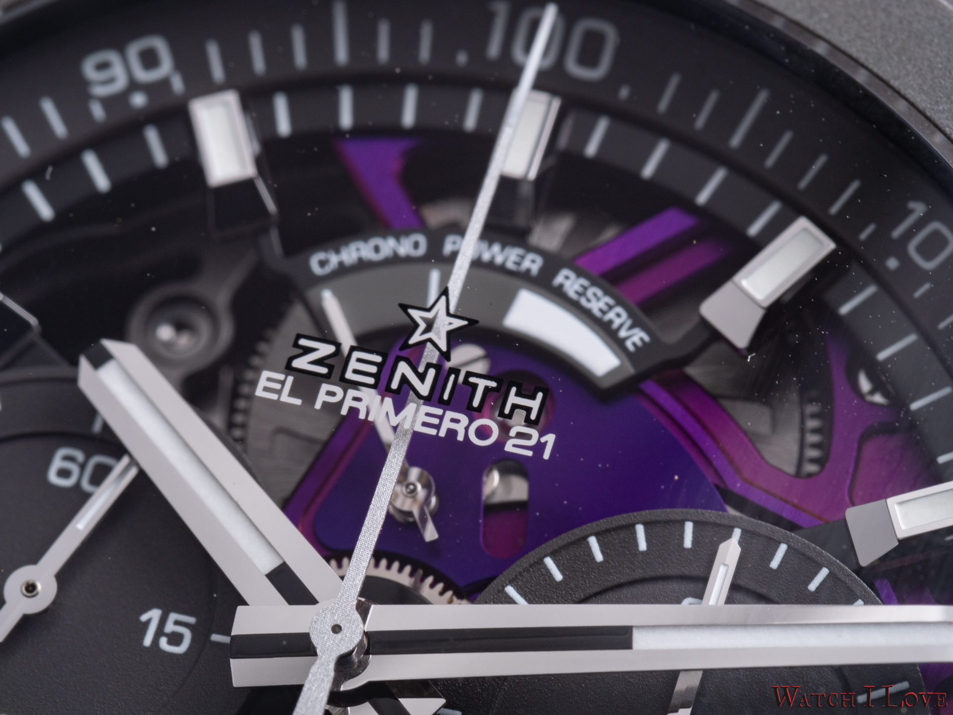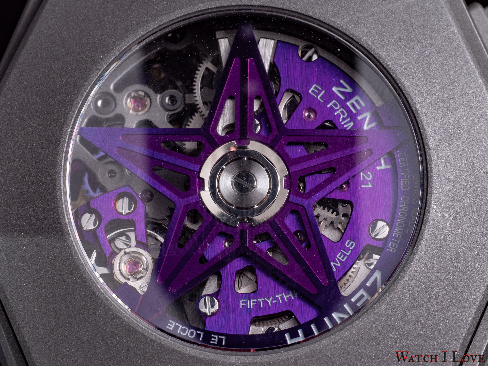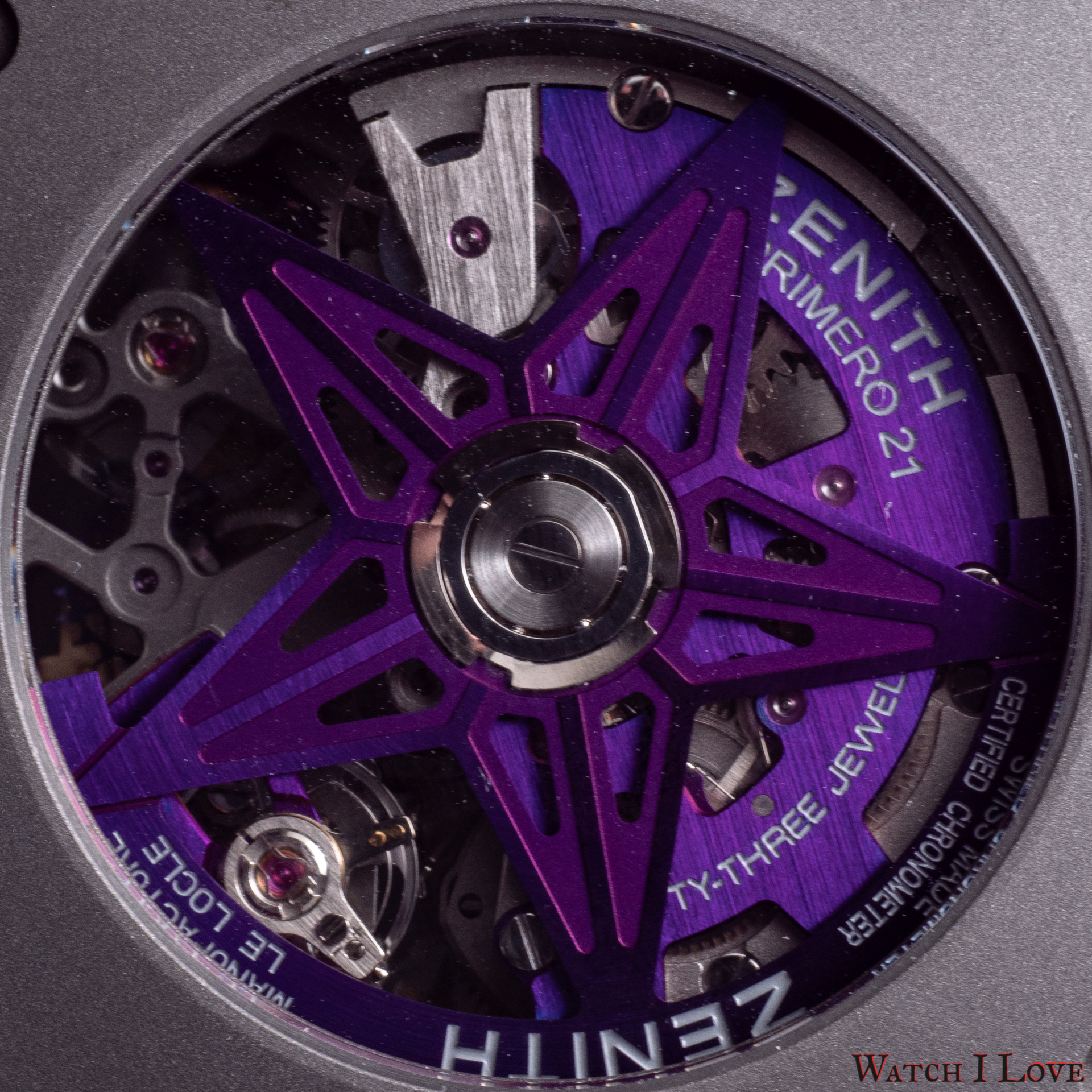 Zenith Defy 21 Ultraviolet is powered by the calibre El Primero 9004 automatic. This movement is spectacular visual and technic. The calibre 9004 has an open construction with a micro-blasted skeletonisation. Many elements, including the rotor weight, are anodised to obtain this violet finish.