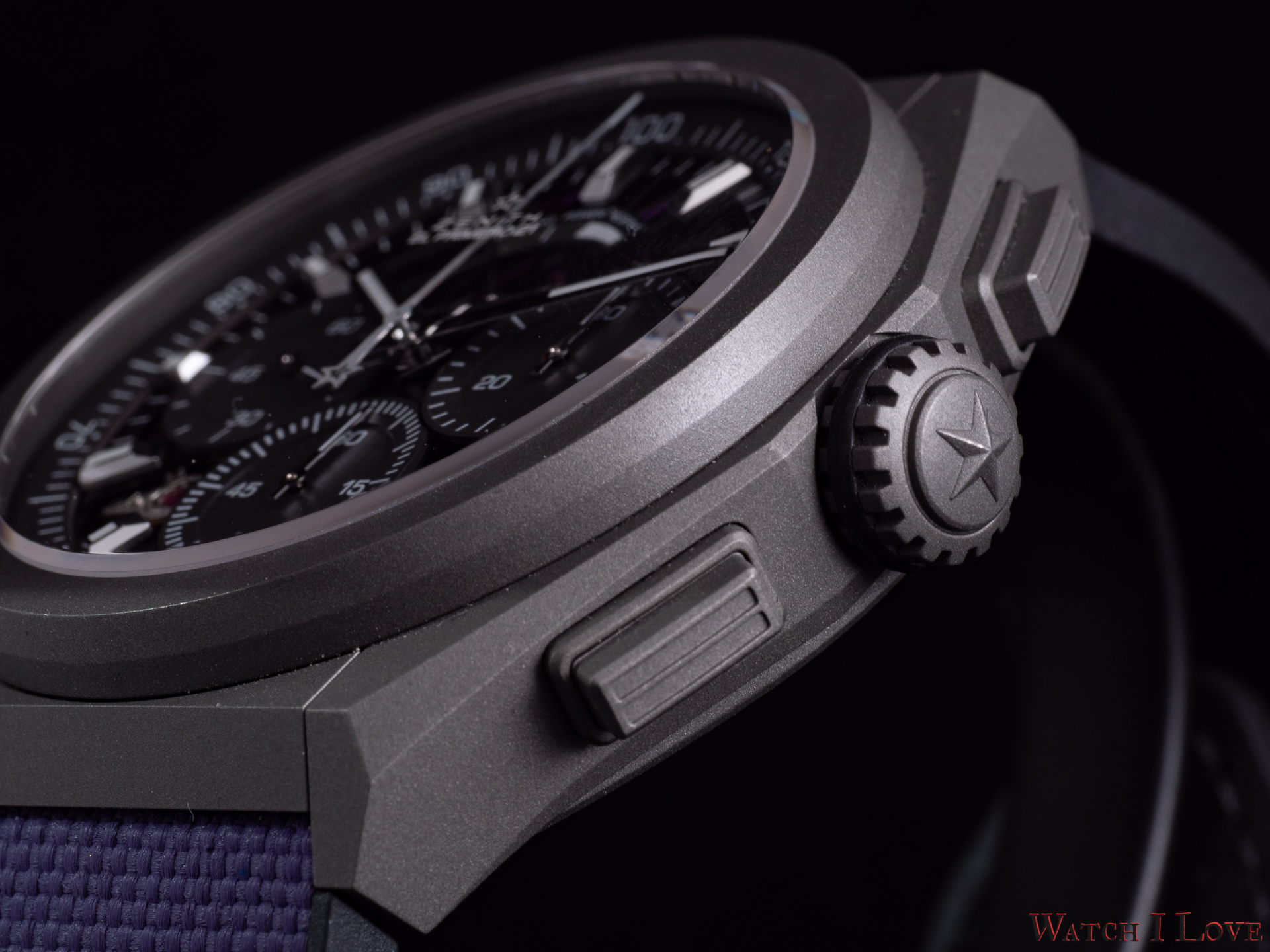 The crown and the pushers use the same material and finishes. Of course, the crown features an embossed Zenith star as decoration on a domed background. The handling is pleasant and familiar to those who have “molested” a Defy 21 chrono before.
