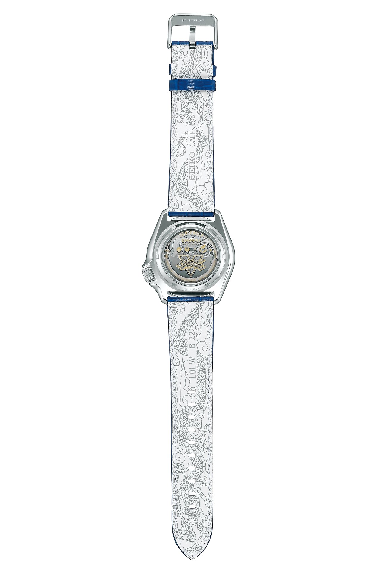 The combination of blue and gold brings to life Chun-Li’s China dress. The same design on her dress collar is at 12 o’clock, and her spike bracelet inspires the indexes at six and nine o’clock. The beautiful dragon pattern on her waist belt is printed on the strap back, and her special move “Spinning Bird Kick” command is printed on the case back.