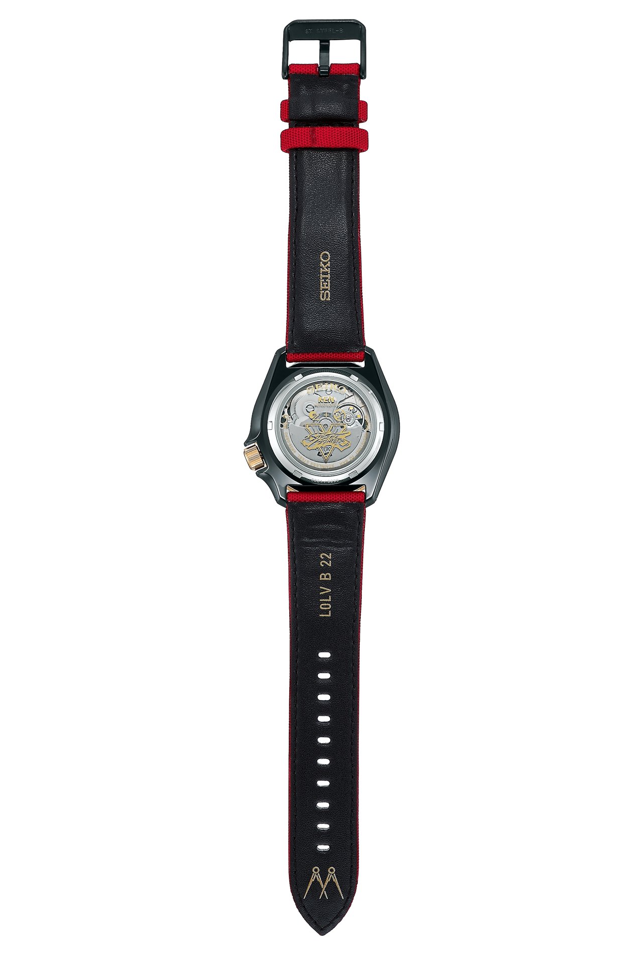 Ken’s costume and blond hair are captured in the watch’s red and yellow color scheme, and his costume design is also reflected in the dial. At the reverse side of the strap end is the logo of his company, the Masters Foundation, showing another side to his identity. The command for one of the most known moves of the game, “Shoryuken” is printed on the case back.