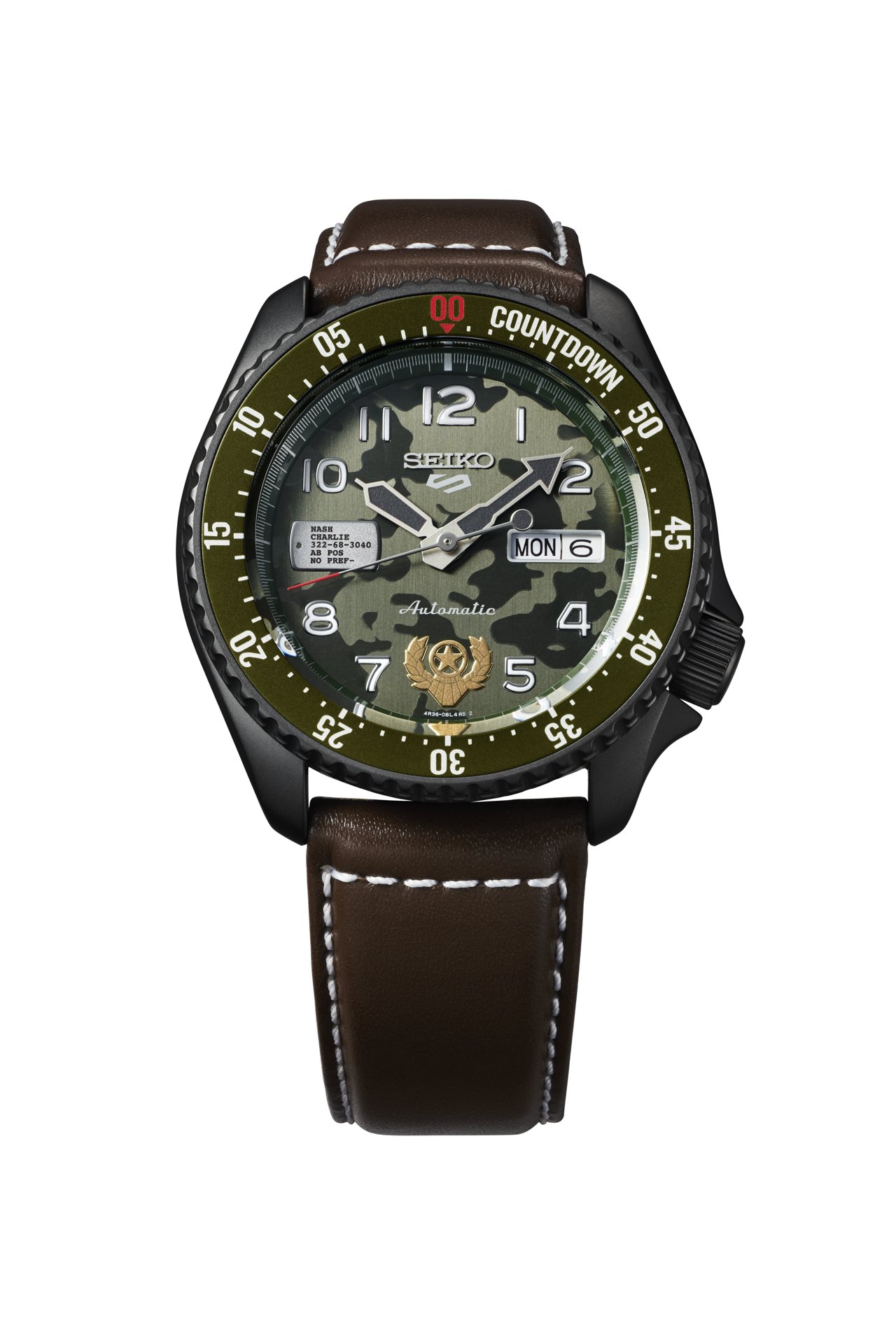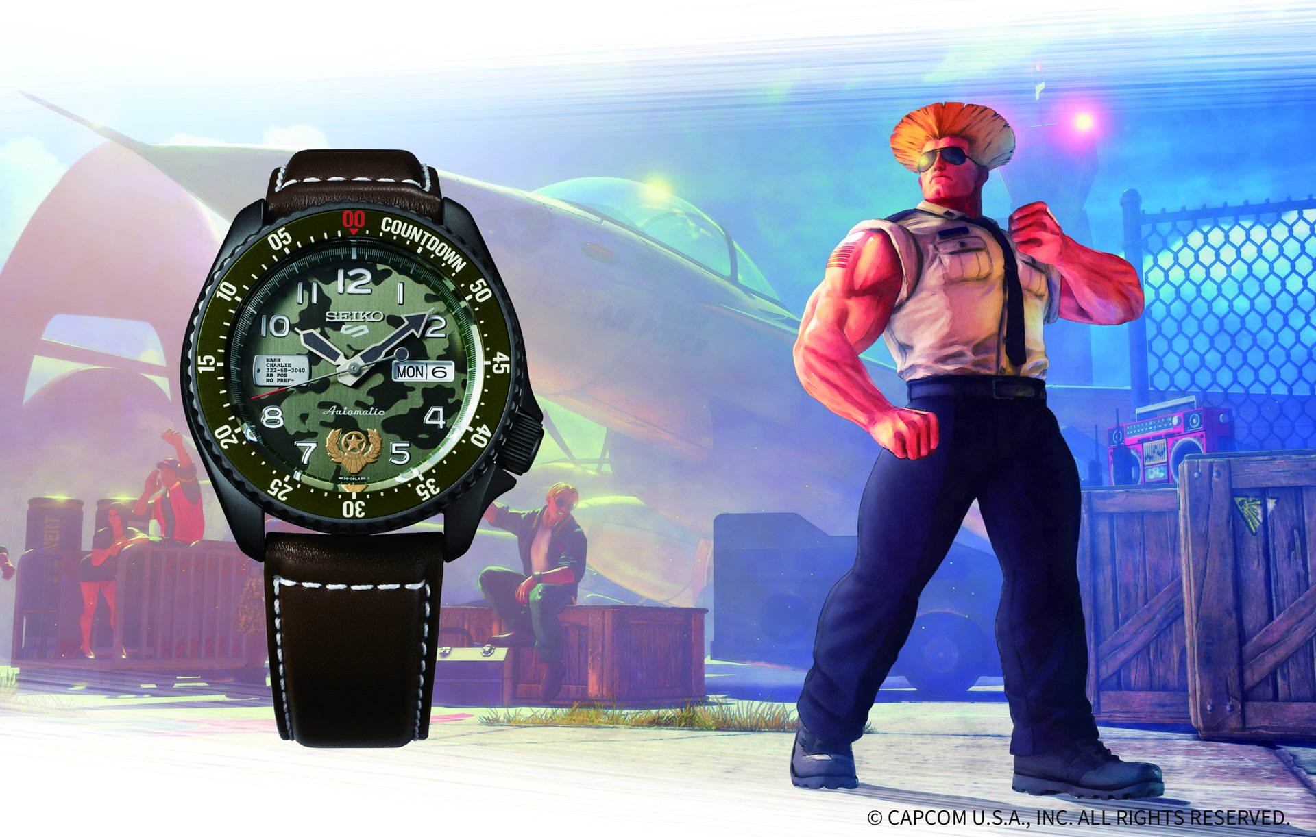 Guile’s uniform as Major of the US Air Force inspires the military camouflage-patterned dial and patch at the 6 o’clock position. At 9 o’clock is the “dog tag” of his best friend Charlie Nash that he keeps with him to cheer him up and stay sharp during fights. On the case back is printed the command for Guile’s special move, “Sonic boom”.
