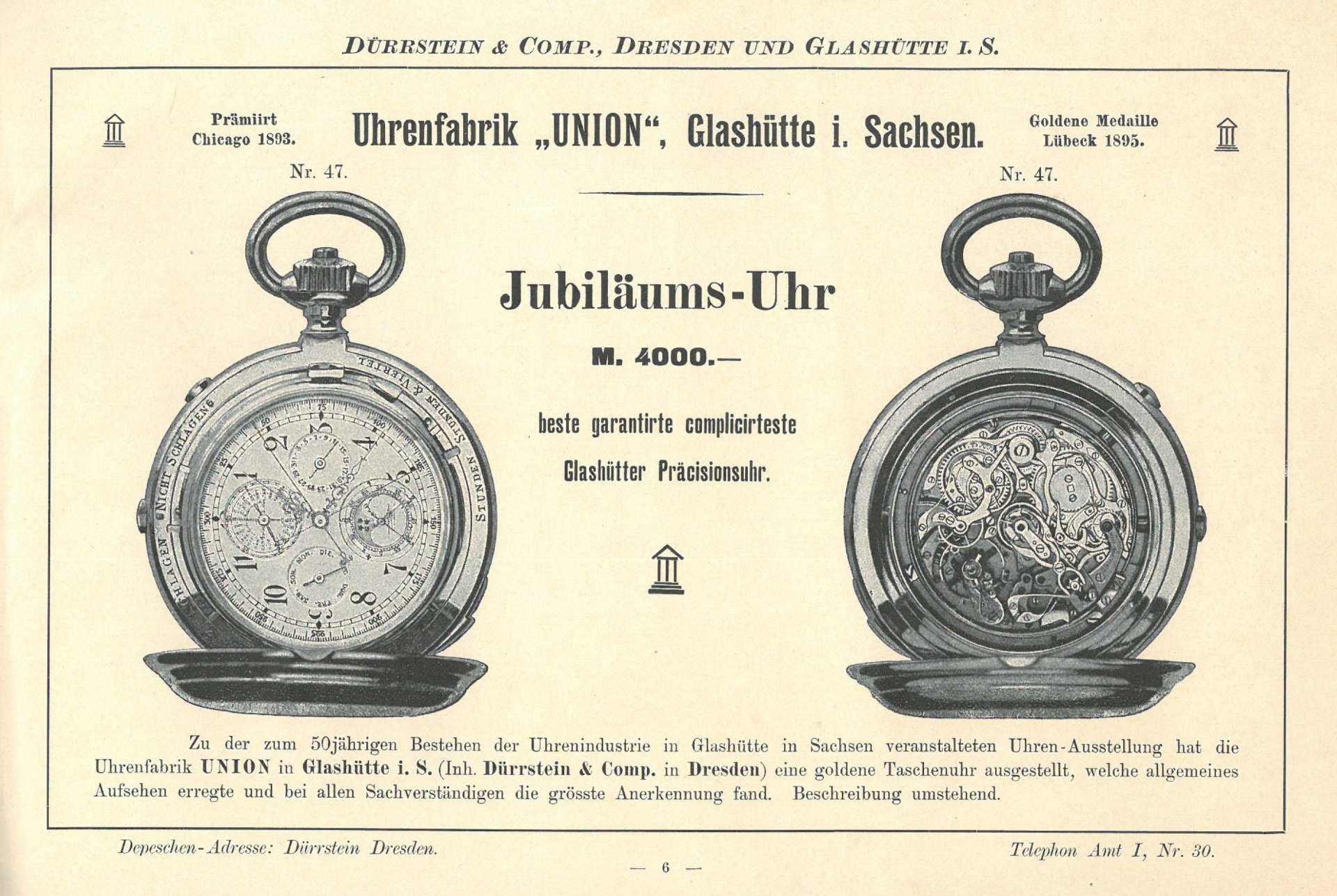 On 1st January 1893, alongside the watch wholesale business in Dresden, Johannes Dürrstein established the Uhrenfabrik Union in Glashütte.