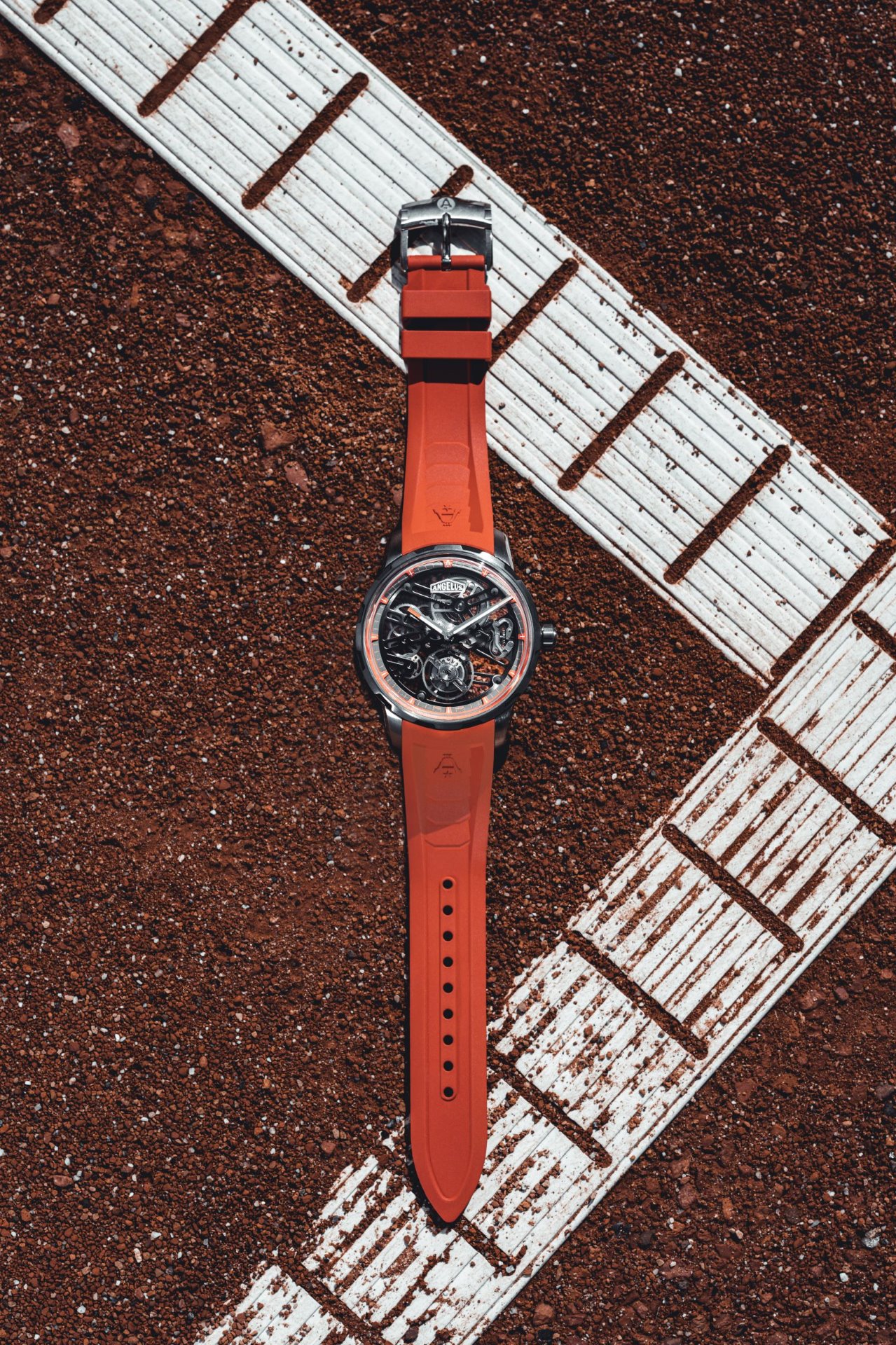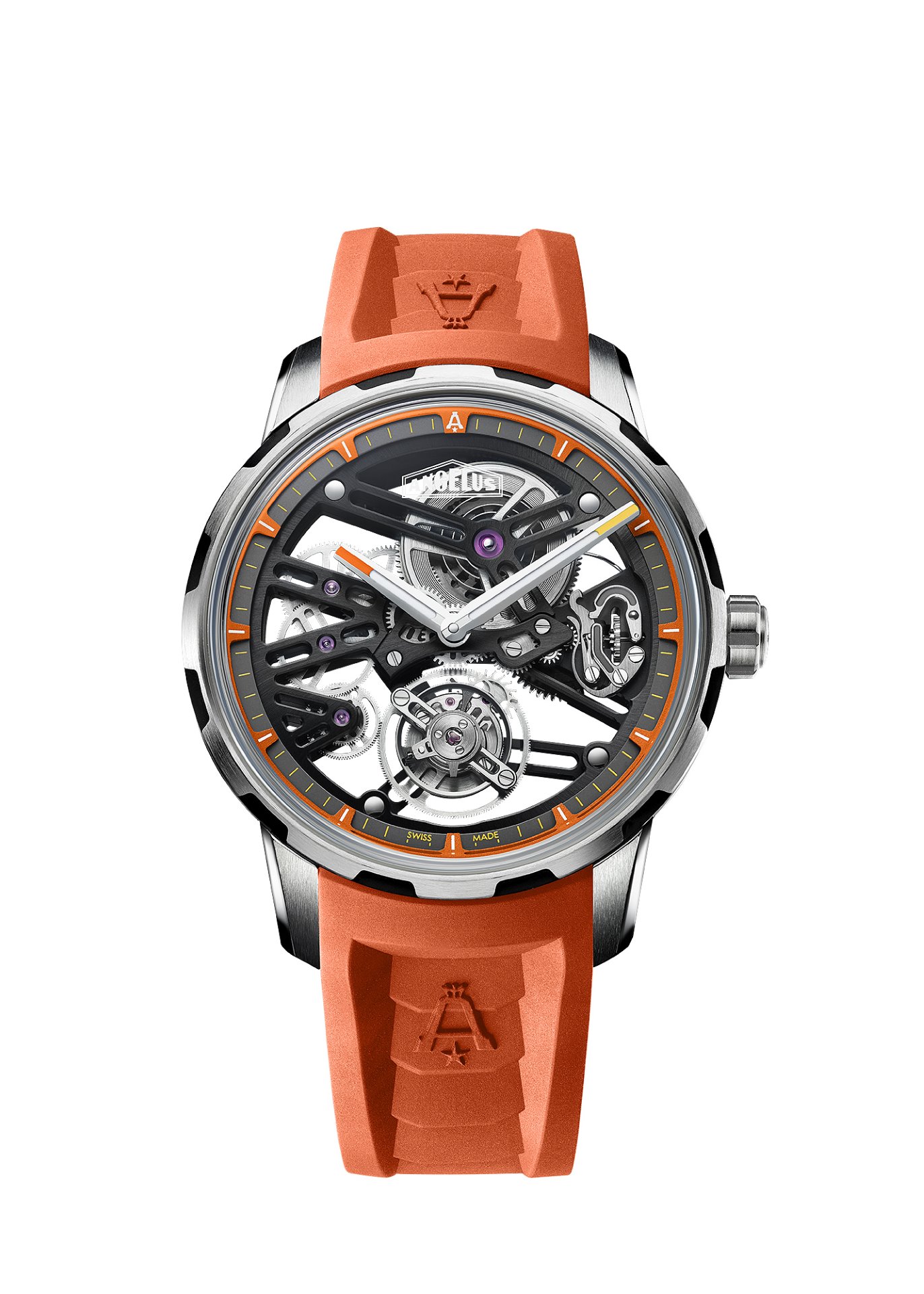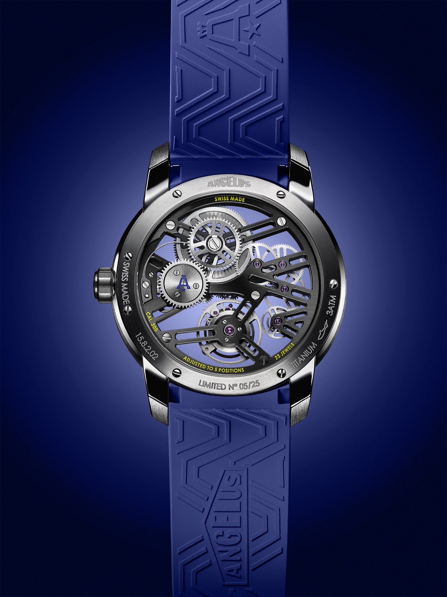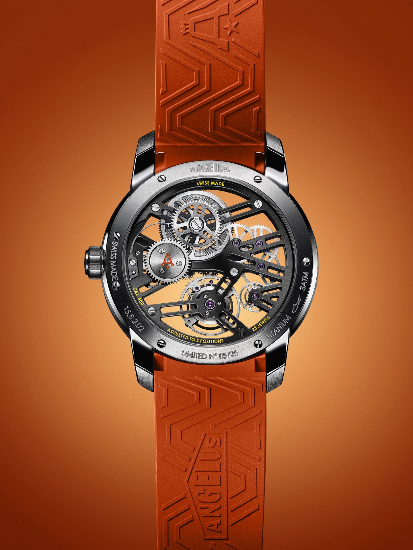 On the one hand, we have Angelus’ in-depth knowledge in designing and developing complication and skeleton calibres. On the other, the search for a committed style, accompanied by a comfortable and proportionate wearing experience on the wrist. The Angelus U41 is a sporty watch, as exemplified by its sculpted rubber strap, notched bezel, titanium case and movement designed in a metallic ‘mesh’ format.