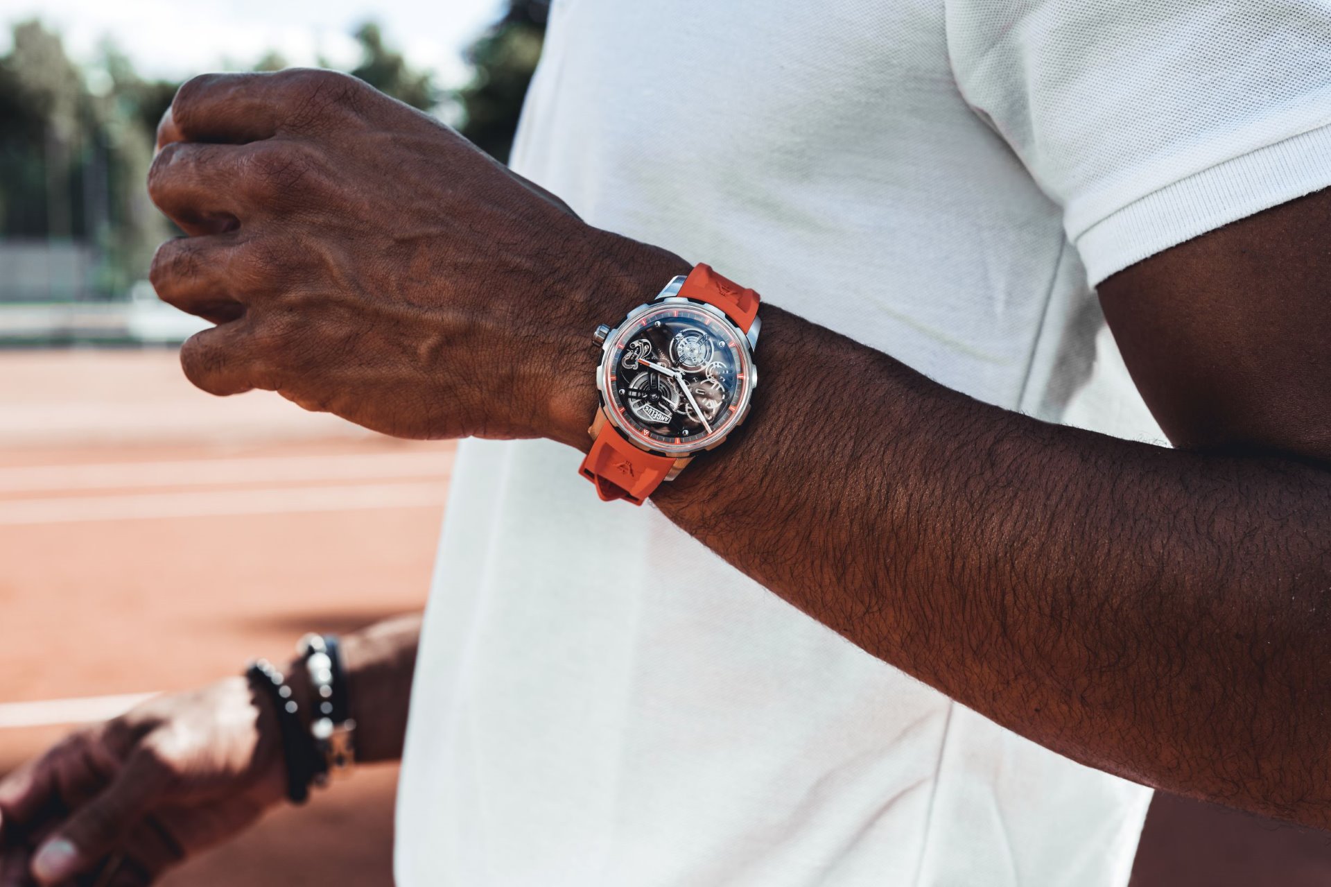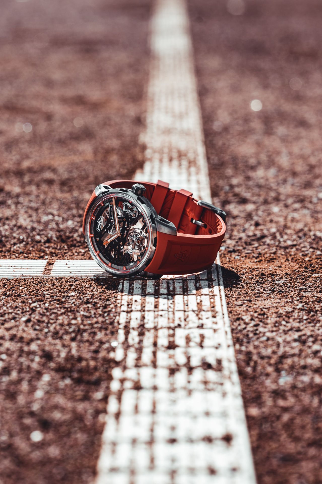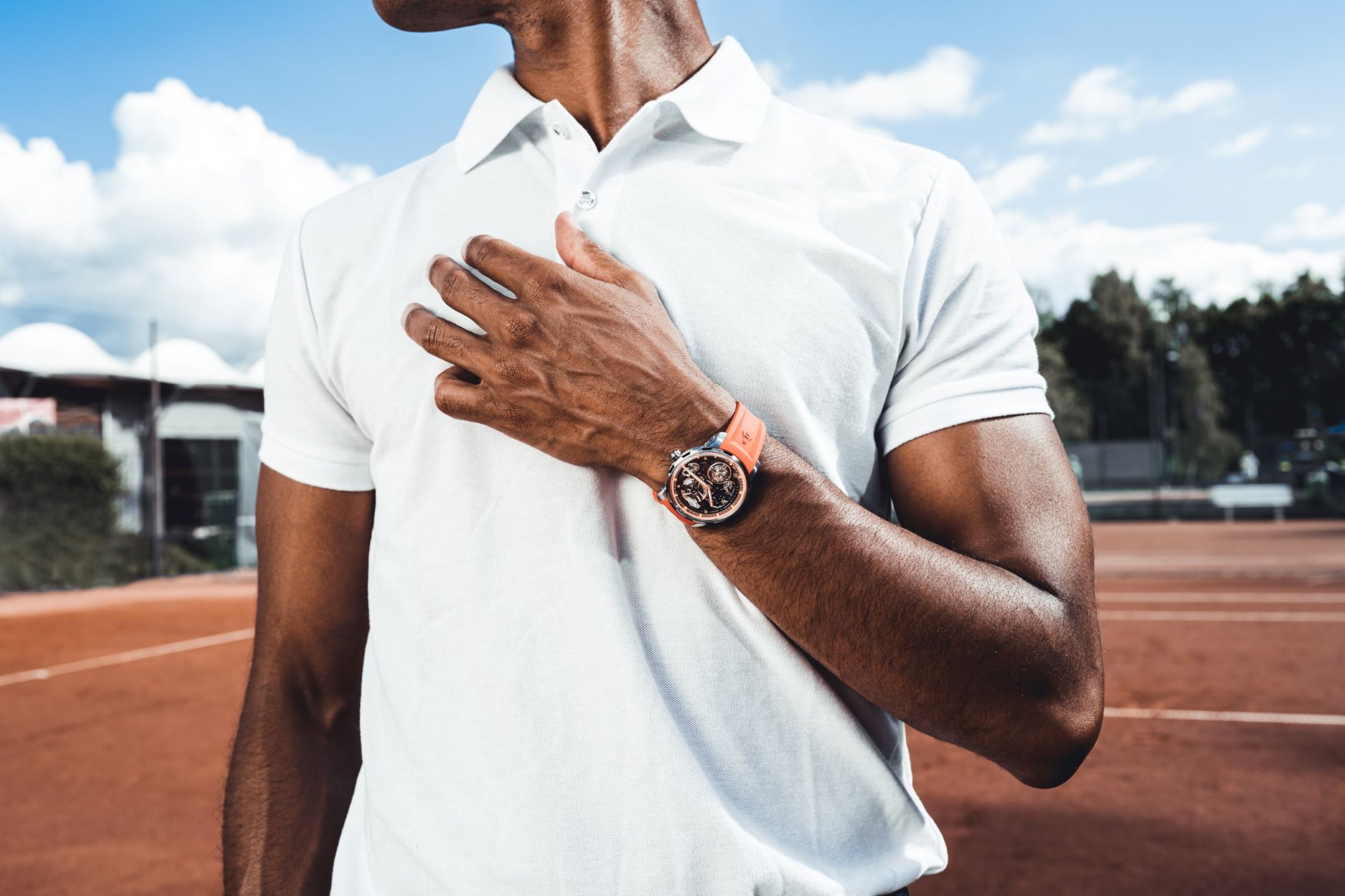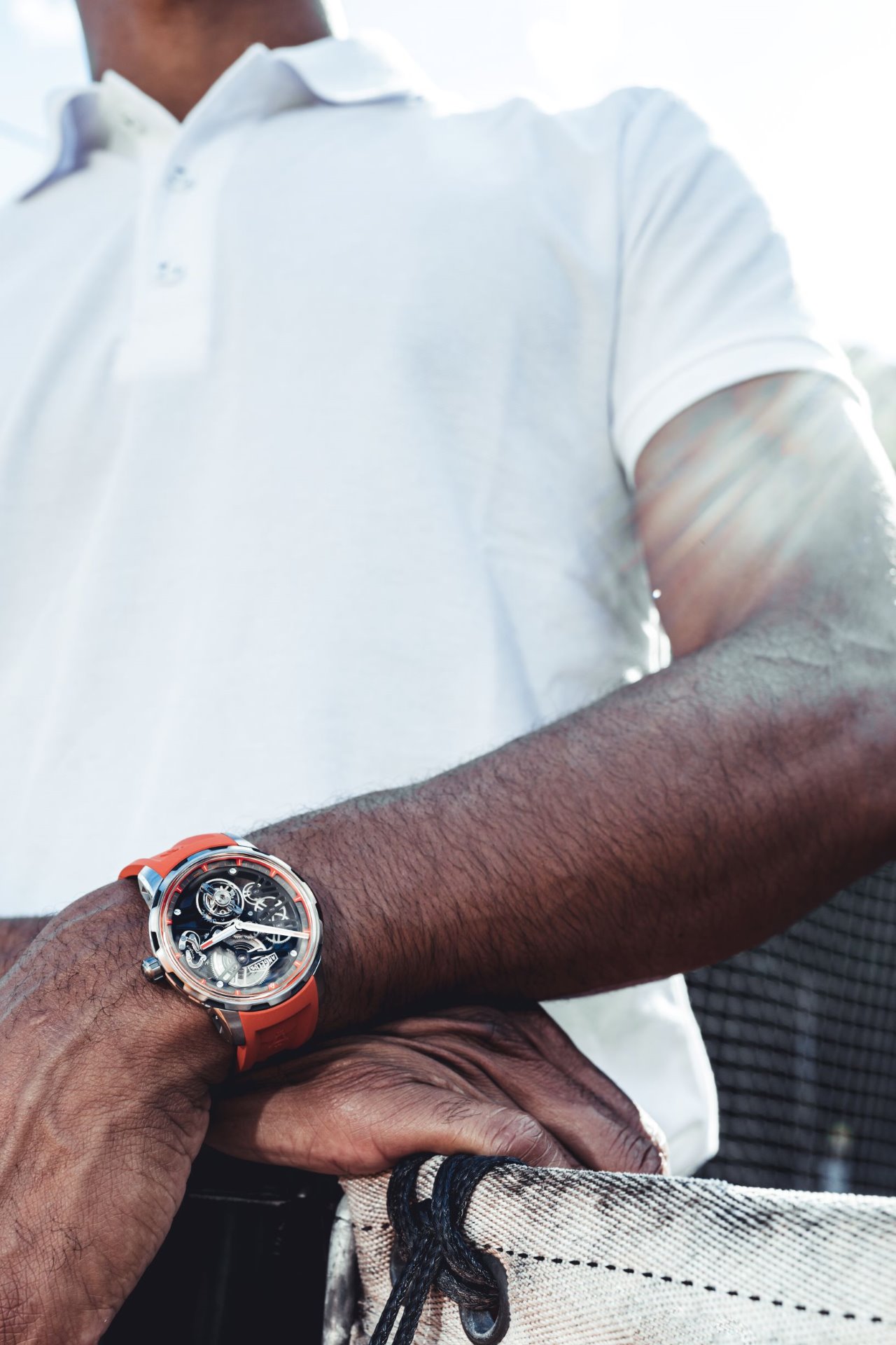 On the one hand, we have Angelus’ in-depth knowledge in designing and developing complication and skeleton calibres. On the other, the search for a committed style, accompanied by a comfortable and proportionate wearing experience on the wrist. The Angelus U41 is a sporty watch, as exemplified by its sculpted rubber strap, notched bezel, titanium case and movement designed in a metallic ‘mesh’ format.