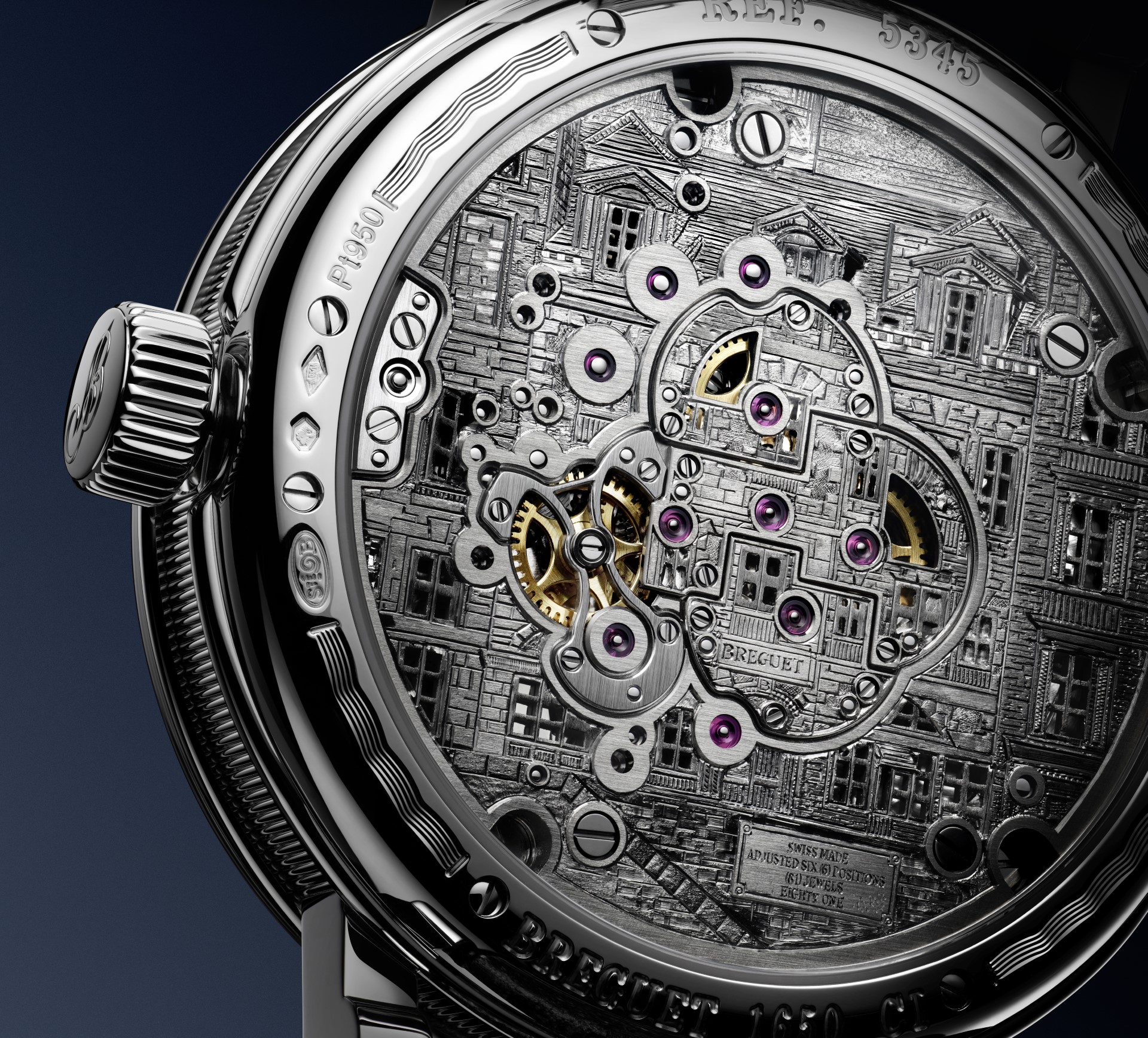 The new Classique Double Tourbillon Quai de l’Horloge model houses a monumental movement in the proportions of a watch. Working with very limited space, the Breguet Manufacture has built a complex and harmonious universe that seemingly defies the laws of physics. Like a delicately chased sculpture, the entire exposed mechanism pivots around its axis at the rate of one full turn every 12 hours. It is propelled by two independent tourbillons, which each complete a full rotation per minute. In this way, the interconnected regulating organs perform a double revolution, simultaneously driving the tourbillon bar: the signature hours hand. It is a remarkable display, featuring a number of components made of gold, as were those of grand complication movements back in their day – a tradition that has now been all but lost; one that the House of Breguet endeavors to perpetuate, as it does its specialist artisan techniques. This watch is a stunning display of Breguet’s expert craftsmanship – in particular the engraving on the back, which depicts the house that Abraham-Louis Breguet acquired on Quai de l’Horloge in Paris.