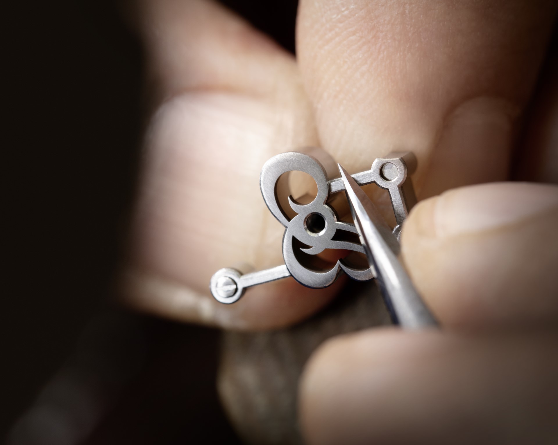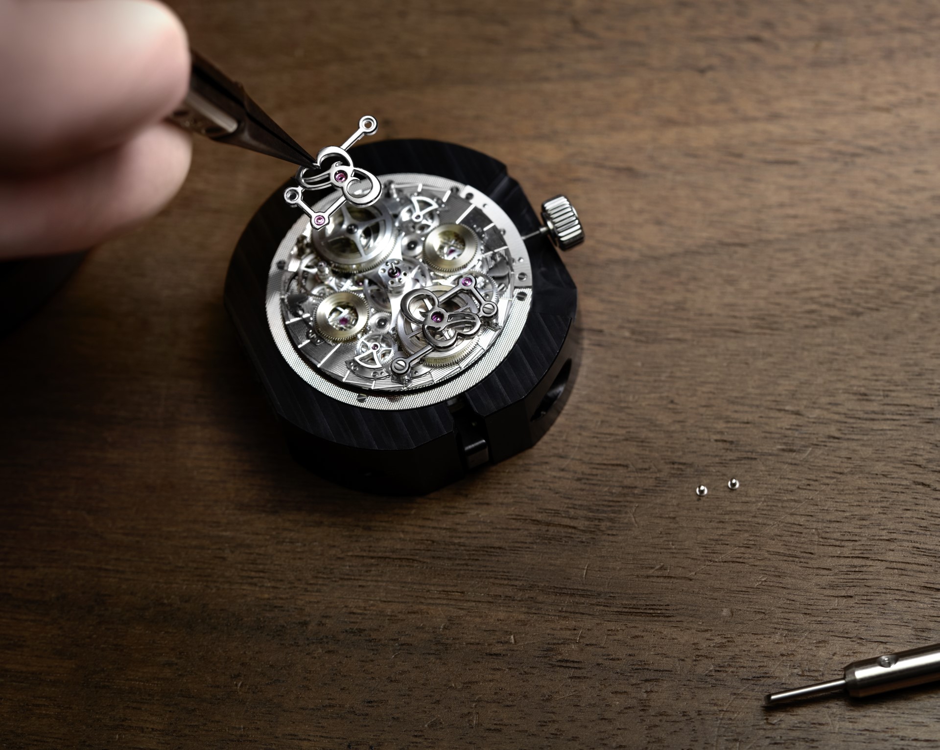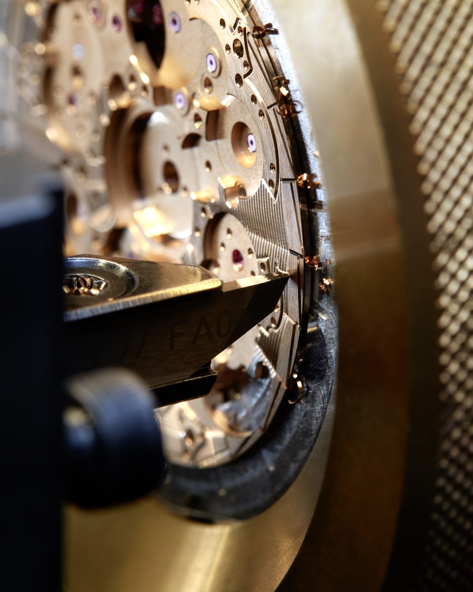 The two mechanical hearts beat independently from one another, each driven by their own barrel. However, the two oscillating organs are coupled with a second pair of wheels, revolving in the central differential. This double-entry mechanism is able to determine the average rate of the tourbillons, allowing for the oscillating plate to be set in motion at the rate of one full rotation every 12 hours. As for the minutes indication, it is a classic hand in the centre. The entire mechanism is equipped with a system to minimize play in the wheels, ensuring a perfectly precise display.