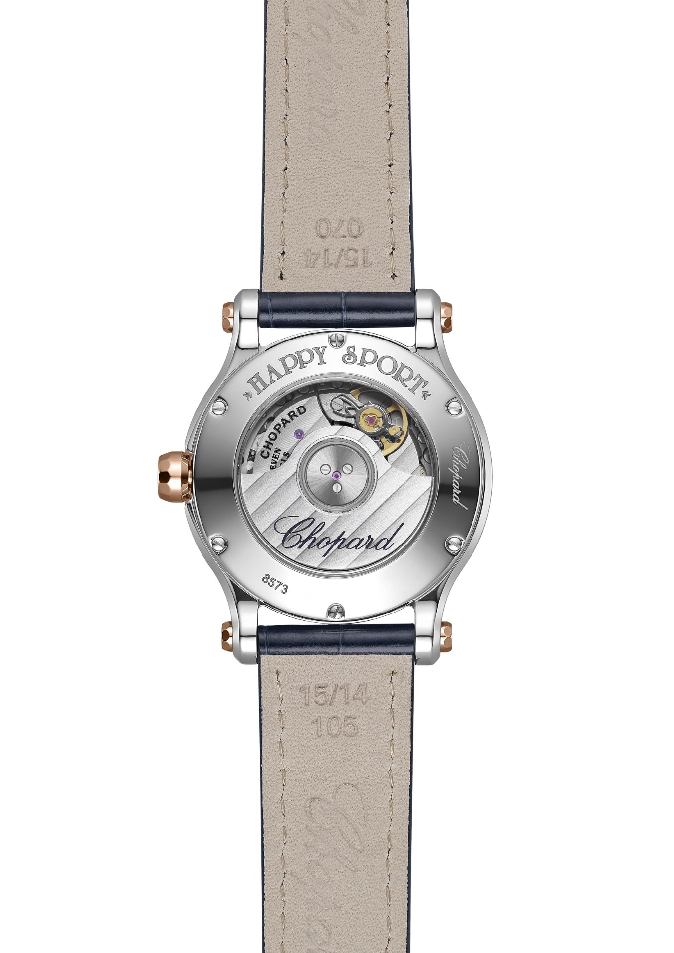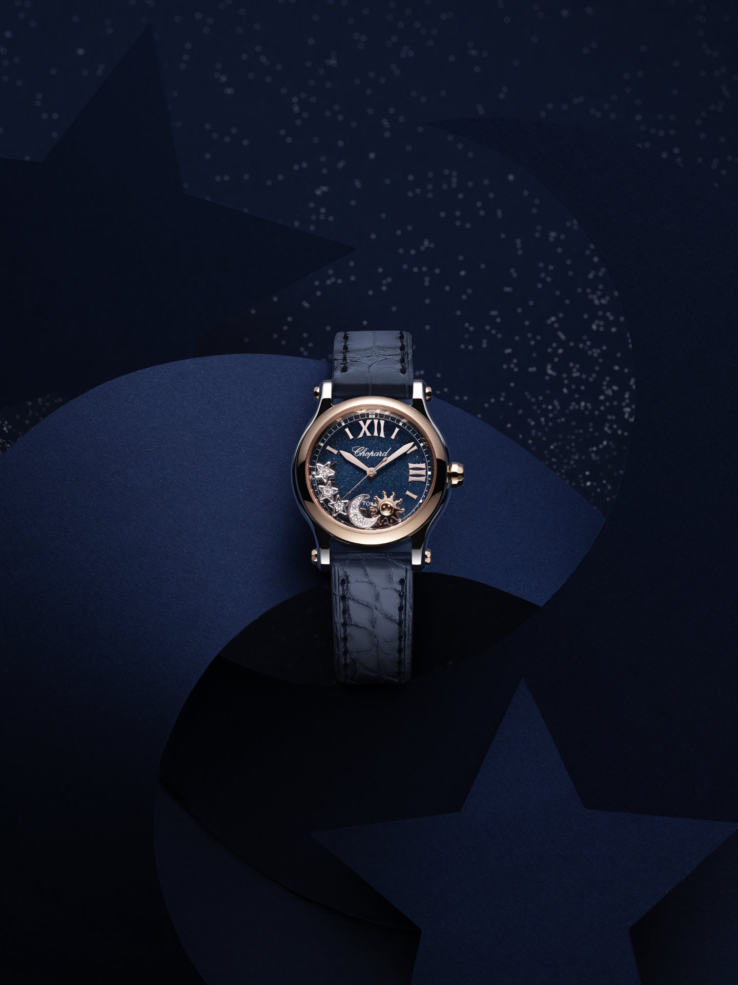 The ultimate romantic getaway, Venice is a powerful inspirational theme for Chopard. The Happy Sport Sun, Moon & Stars in stainless steel and ethical rose gold reveals a new facet of the Serenissima through an imaginative world pervaded by dreamy mystery. A tribute to Piazza San Marco, the vibrant heart of the city, this new interpretation of the Happy Sport collection evokes the famous clock tower that has dominated the square since the 15th century. From the midnight blue of the spangled lacquered dial to the leather strap and the five dancing emblems sliding across its dial, every detail of this watch recalls the emblematic decor of the monument. Caught between two sapphire crystals, the Happy Sport Sun, Moon & Stars stages an encounter between a dancing moon and three dancing stars in diamond-set ethical white gold and an equally freely whirling smiling sun in ethical rose gold. The fascinating celestial vault appears to be infinitely reflected in the inky waters of the Grand Canal.v