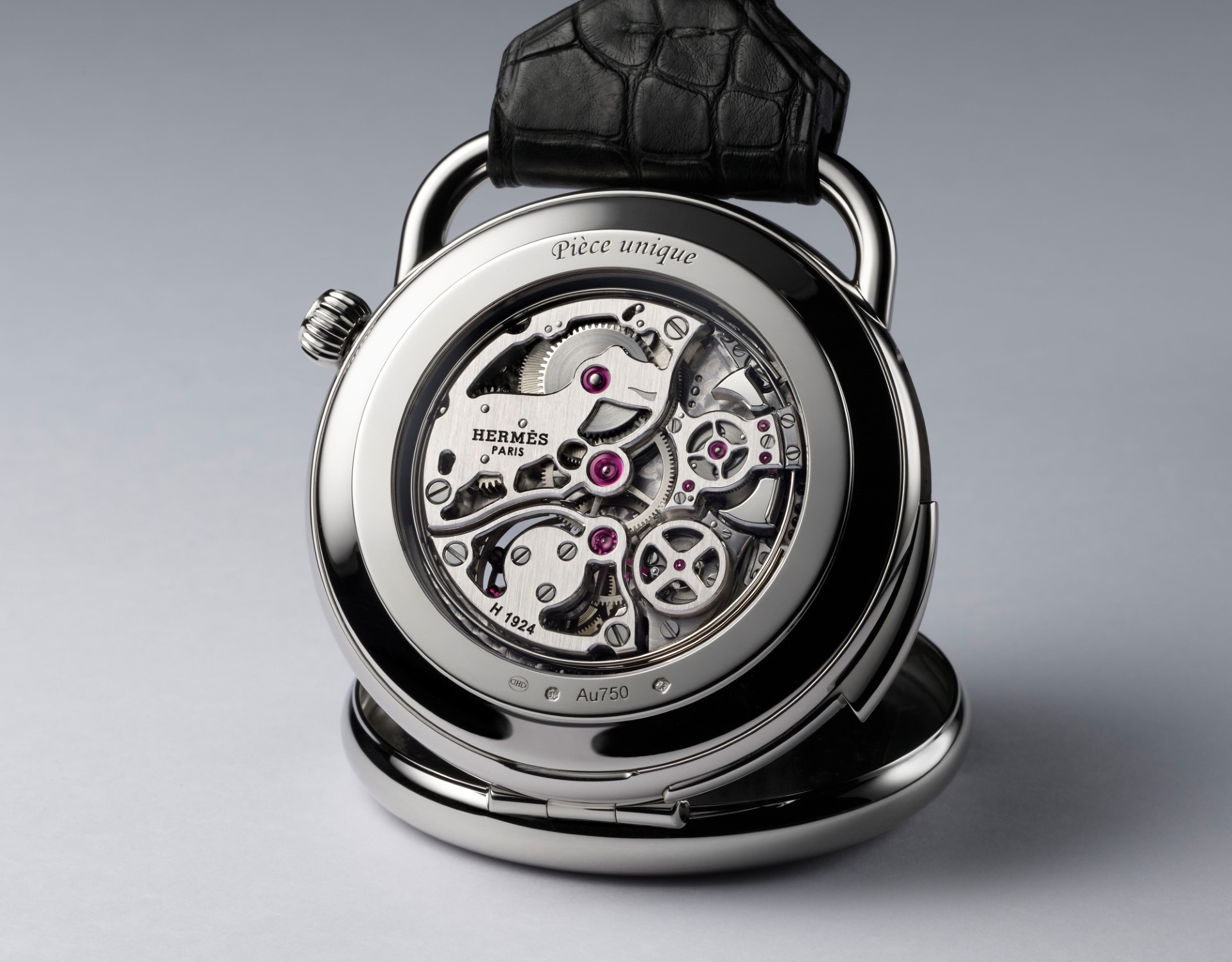 The Arceau watch, created by Henri d’Origny in 1978, lends its classic yet distinctive round shape – with its asymmetrical stirrup-inspired lugs – to infinite expressions of Hermès creativity, style and expertise. Its timeless white gold silhouette stages an alliance between leather craftsmanship and Haute Horloger ie in a one-of-a-kind pocket watch. Beating to the rhythm of the Manufacture H1924 minute-repeater and tourbillon movement, the Arceau Pocket Aaaaargh! frames a refined white enamel dial, protected by a cover adorned with a tyrannosaurus composed of marquetry and leather mosaic.