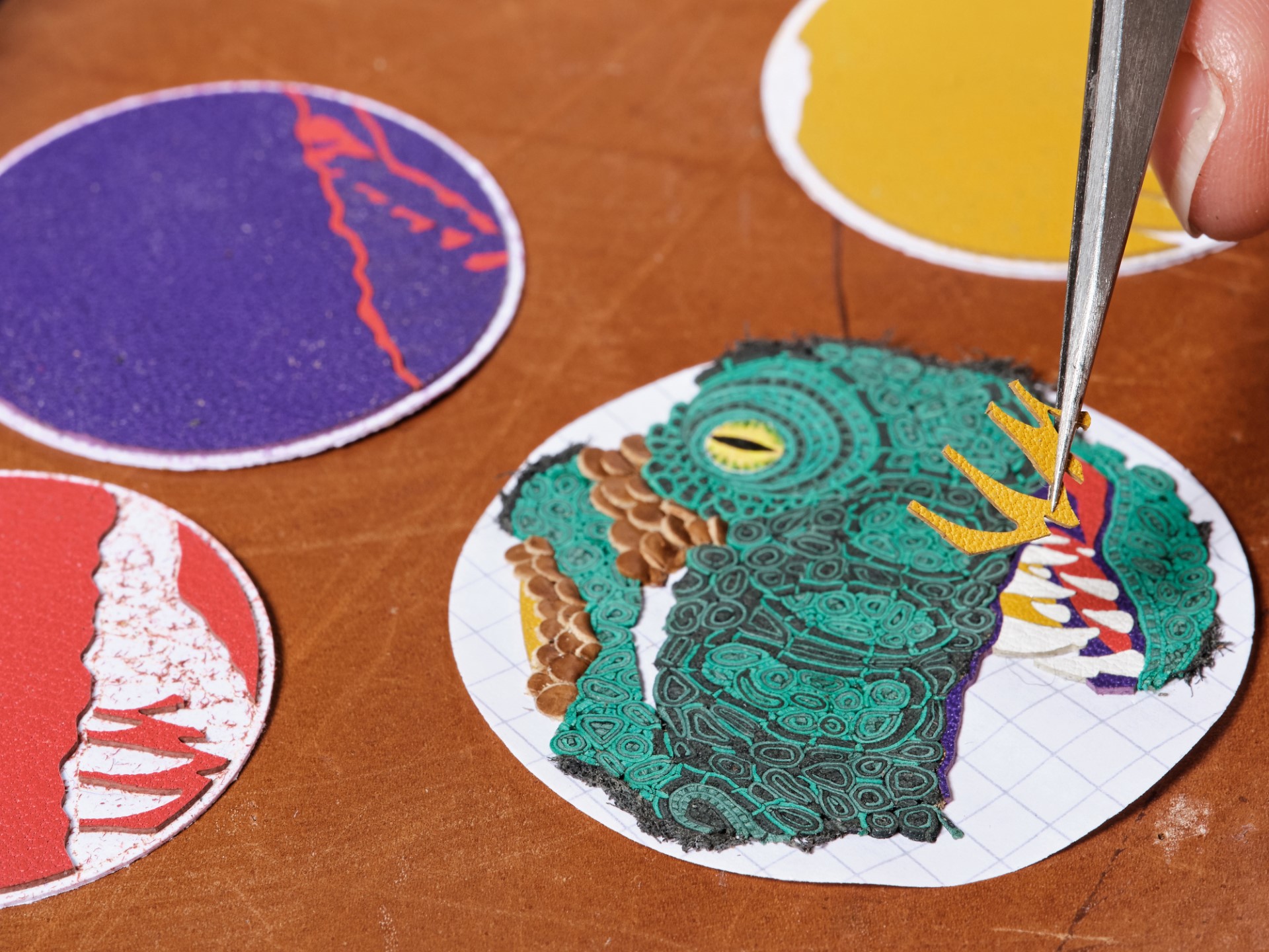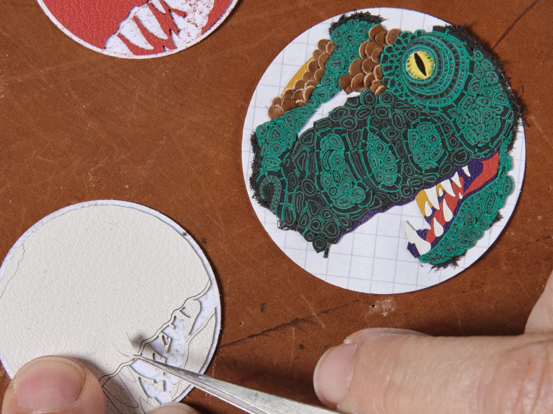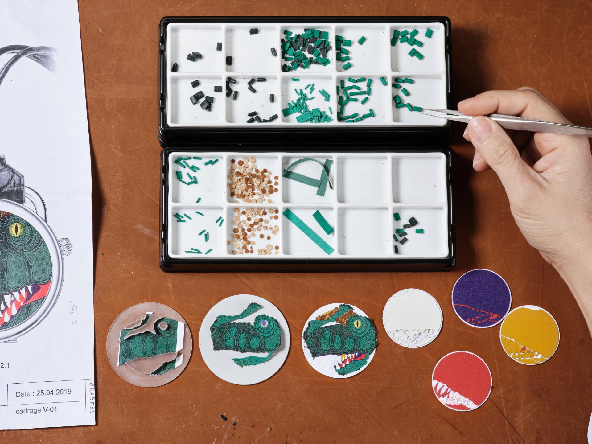 The domed eye of the dinosaur, visible on both sides of the cover, is made of cabochon-cut Grand Feu enamel. Finally, the jaw and tongue are crafted in leather marquetry: fine tesserae are cut from various coloured leathers, previously thinned to just 0.5 mm, before being juxtaposed on the enamel base.