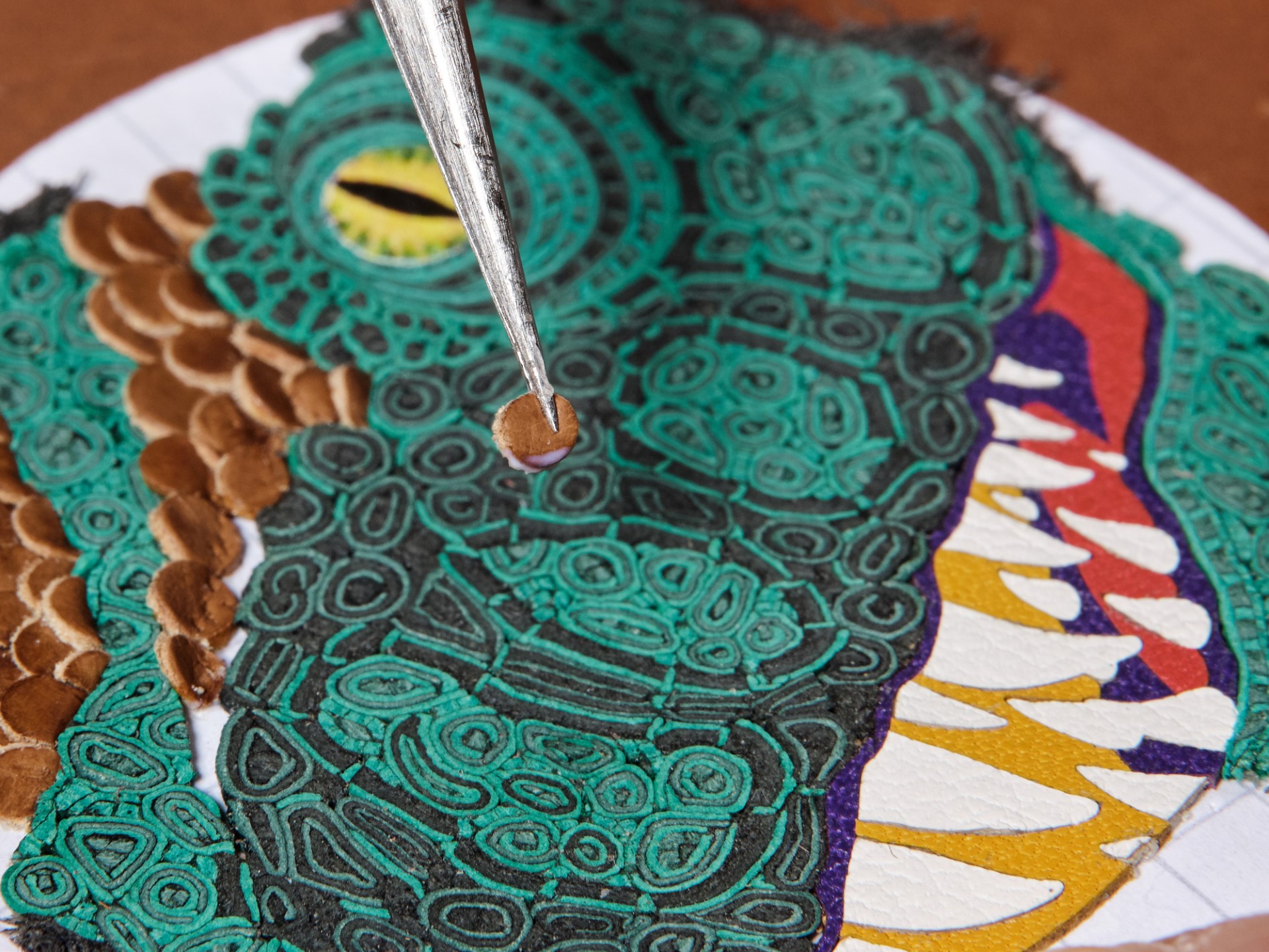 The head and scales are made in leather mosaic: thousands of finely hand-cut multicoloured leather fragments are applied one by one to faithfully reproduce the original pattern.