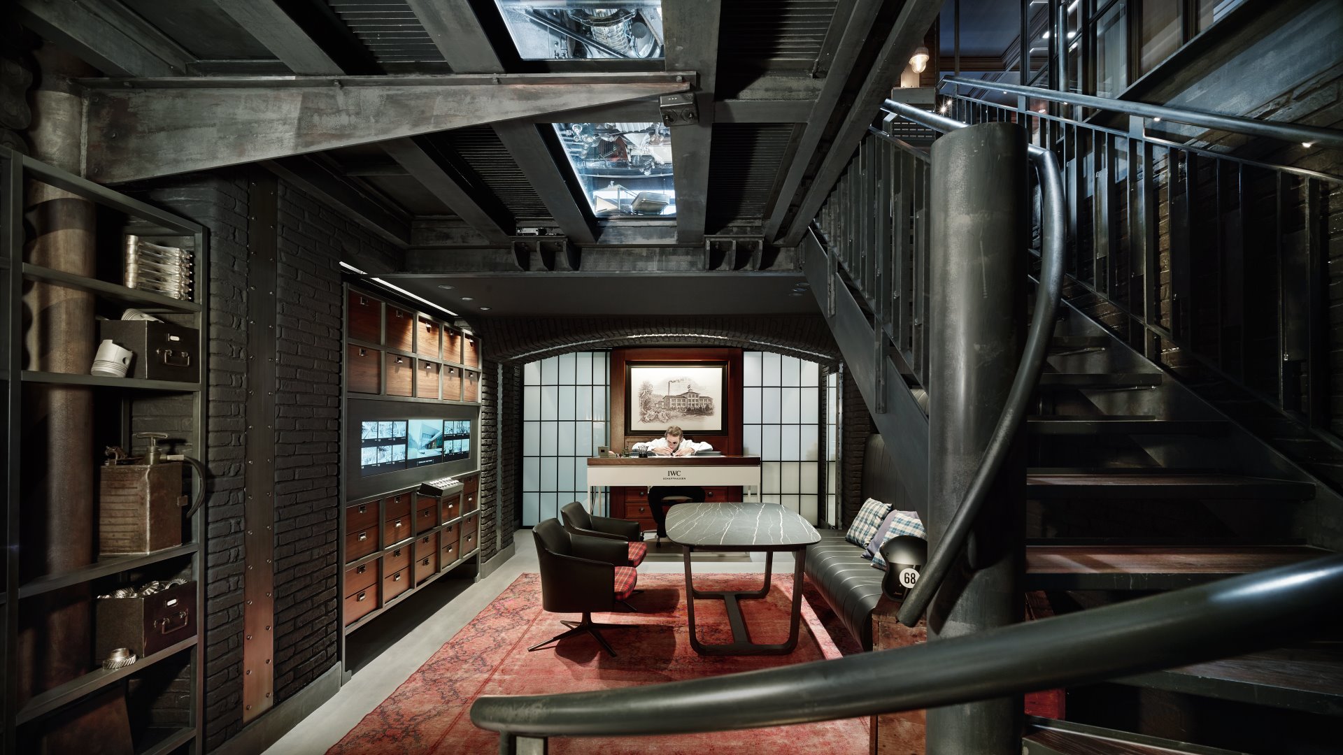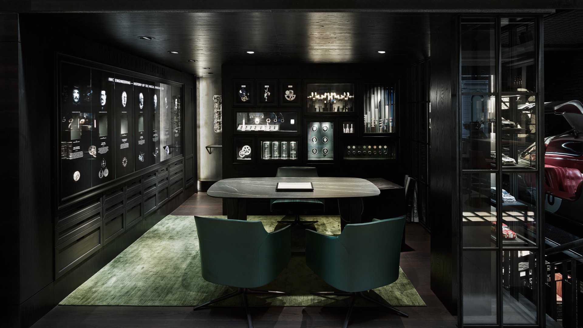 The ‘Workshop’ on the lower ground level features the on-site watchmaking studio with AR video functionality as well as a live link to the Manufacturing Center in Schaffhausen. Clients will also be able to browse some of IWC’s most famous ads, as well as a curated selection of motor racing, themed vintage watches available for sale.
