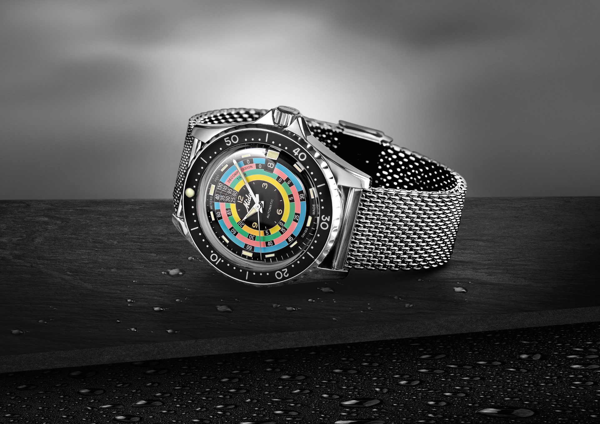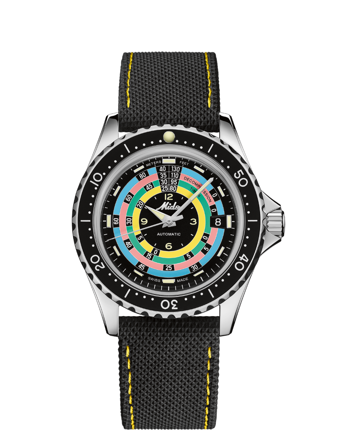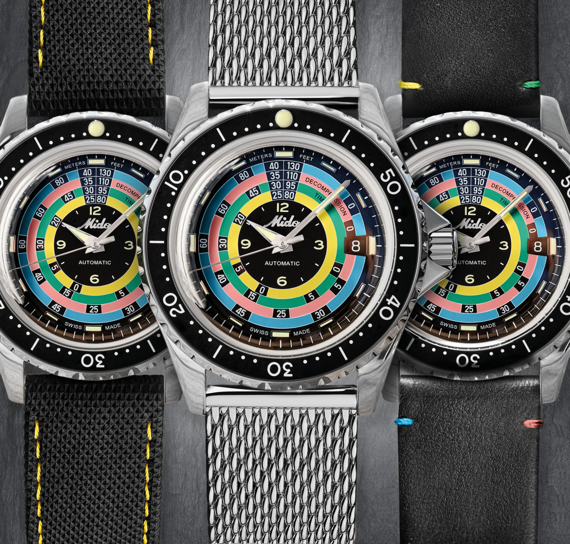 The new Ocean Star Decompression Timer 1961 pays tribute to the model created by Mido in 1961 and its innovative decompression scale function. Against the black background of the dial, Mido reproduces the bright colours of the original table – a subtle nod to the aesthetics of its predecessor that is by no means intended to replace modern diving rules and instruments. The depths are indicated at 12 o’clock: in metres (left) and feet (right). Super-LumiNova® adorns the diamond-cut hour and minute hands, as well as the polished indexes, for perfect visibility underwater. The Mido logo from the 1960s also features as a polished applique on the black dial, and as an engraving on the case back, crown and strap clasps.
