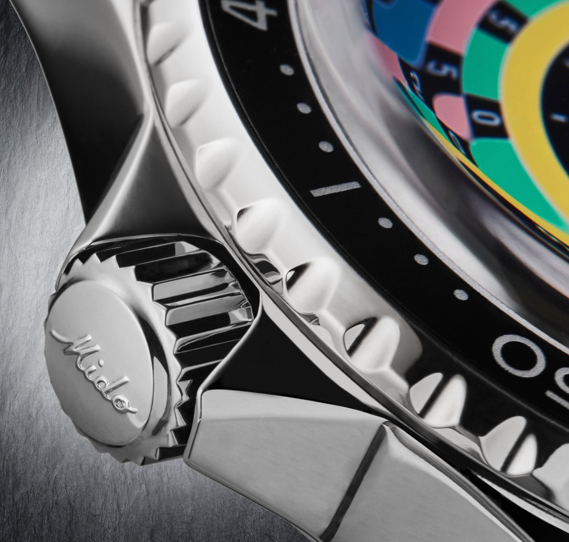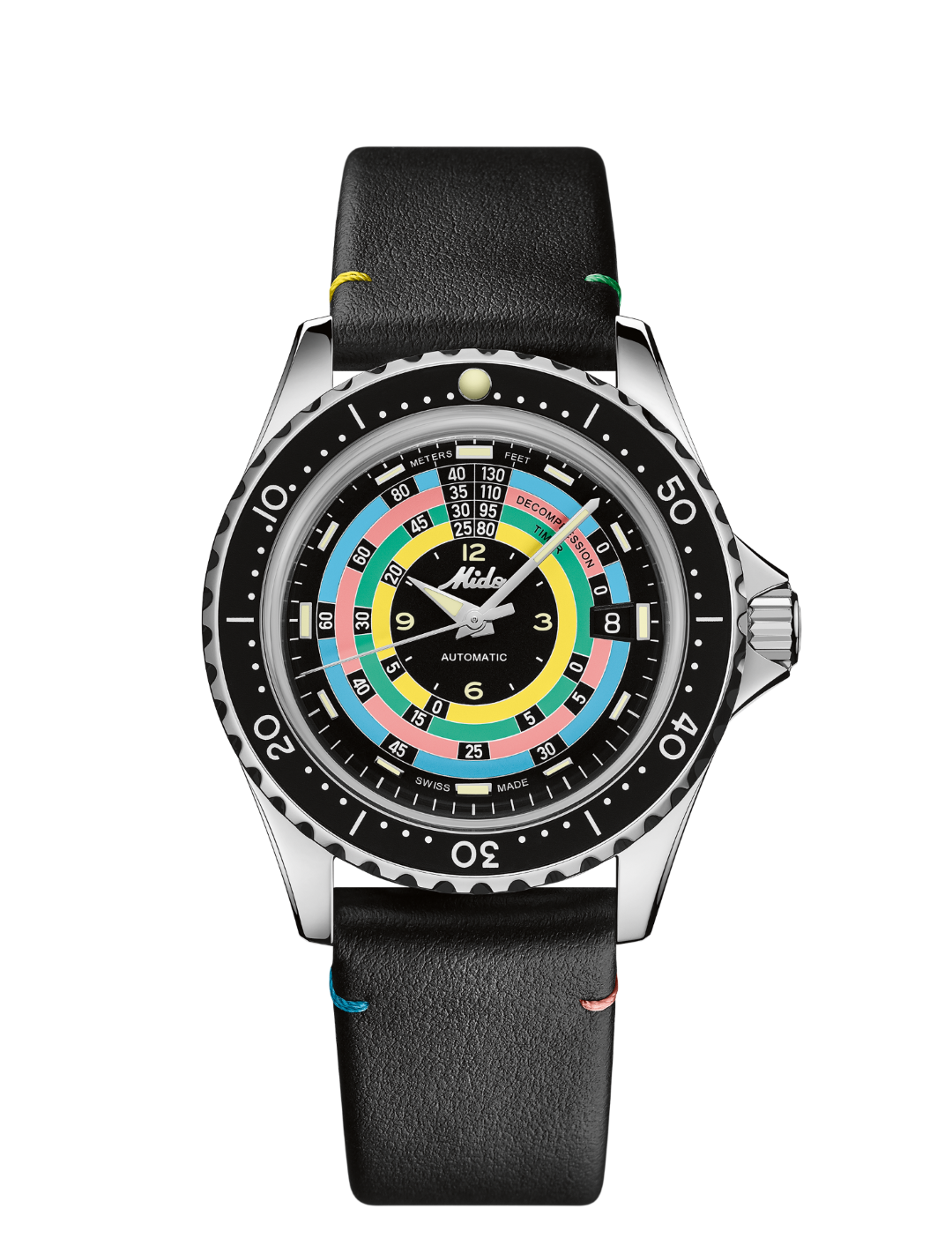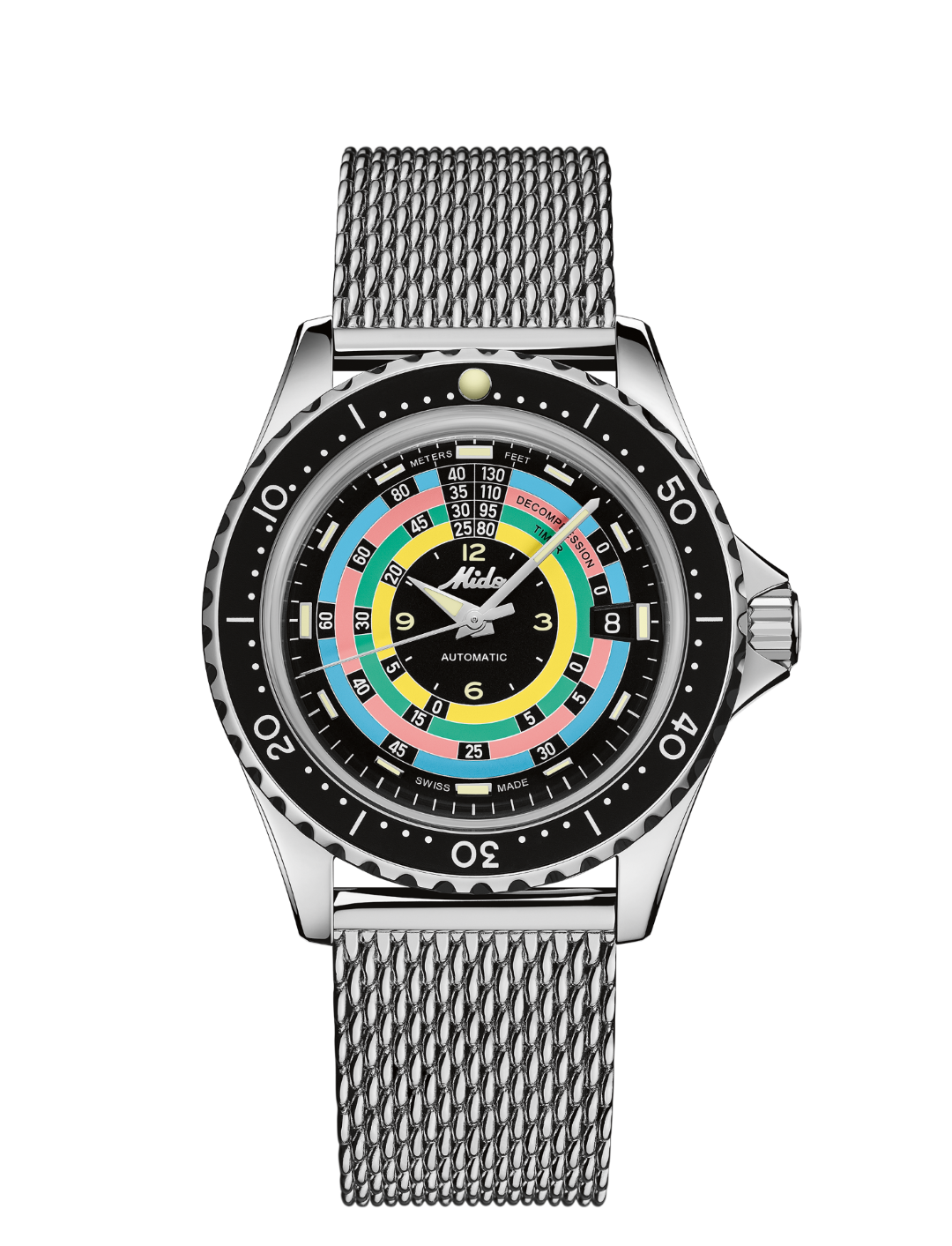 The new Ocean Star Decompression Timer 1961 pays tribute to the model created by Mido in 1961 and its innovative decompression scale function. Against the black background of the dial, Mido reproduces the bright colours of the original table – a subtle nod to the aesthetics of its predecessor that is by no means intended to replace modern diving rules and instruments. The depths are indicated at 12 o’clock: in metres (left) and feet (right). Super-LumiNova® adorns the diamond-cut hour and minute hands, as well as the polished indexes, for perfect visibility underwater. The Mido logo from the 1960s also features as a polished applique on the black dial, and as an engraving on the case back, crown and strap clasps.