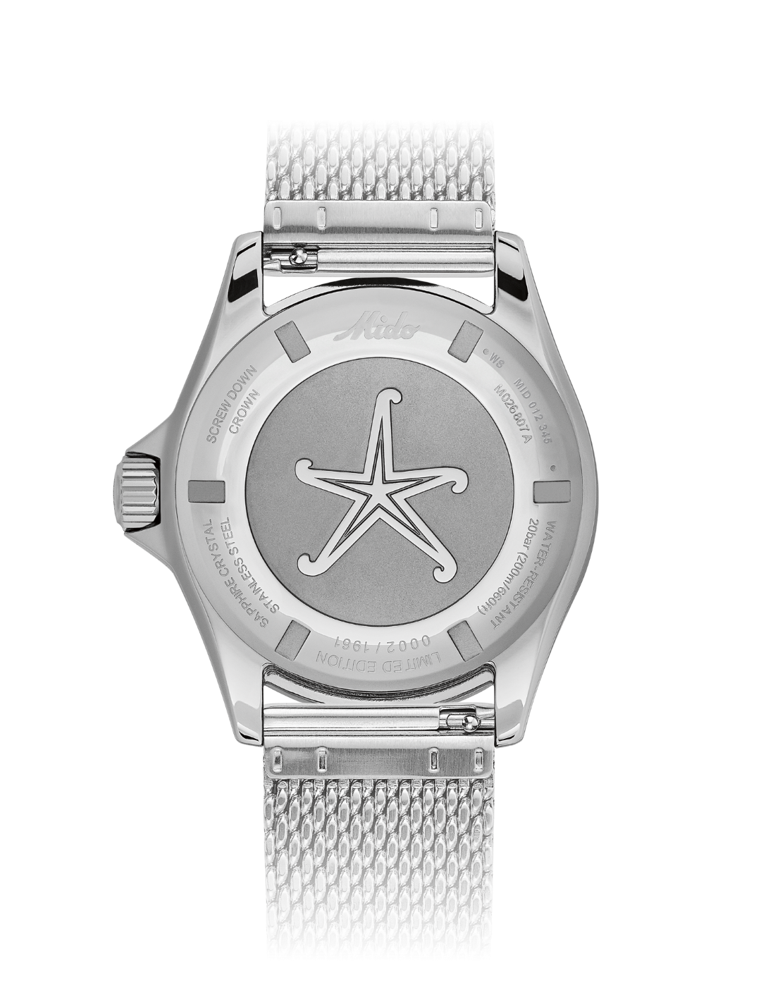 - polished screwed crown with original Mido logo and screwed case back with polished starfish in relief,