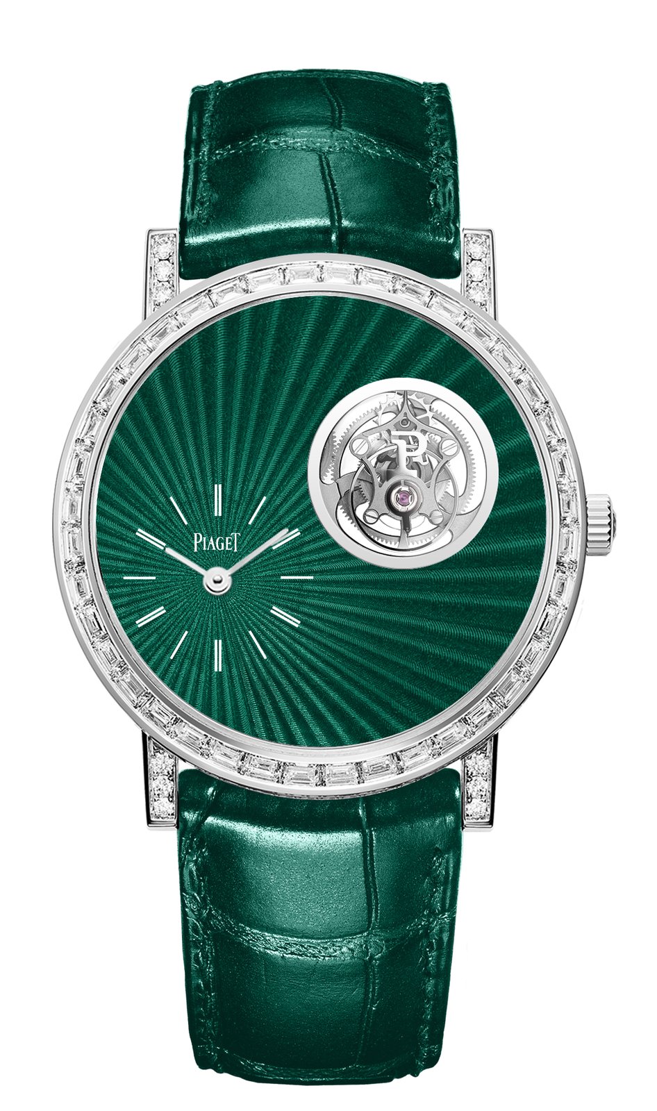 Last but not least, a 41mm white gold case and hand-guilloché gold dial with a sun-ray motif covered with a translucent green enamel. The bezel is framed by baguette-cut diamonds (5.07 carats) and paired with a matching green alligator strap.