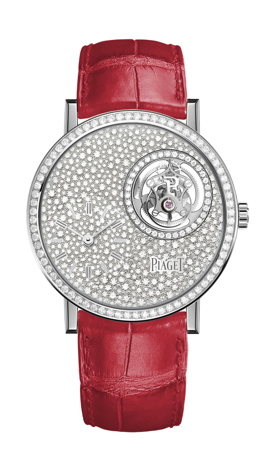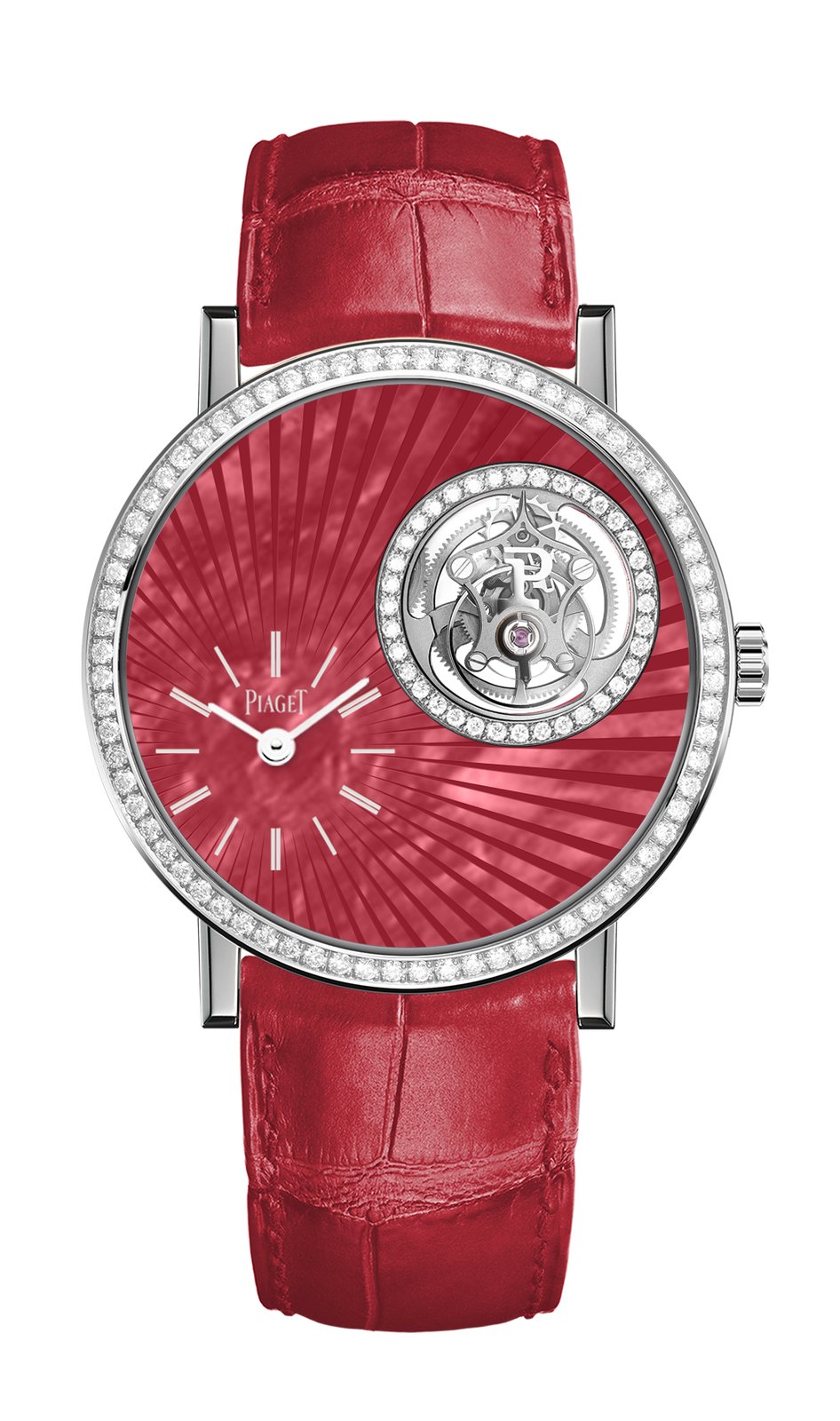This 38mm white gold case is adorned with brilliant-cut diamonds on the bezel and around the tourbillon’s aperture (1.26 carats). This particular timepiece comes with an exclusive guilloché dial in red mother-of-pearl that is complemented with white gold coloured hands and indexes. It is paired with a red alligator strap.