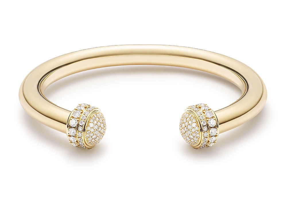 There are three anniversary-edition yellow gold bangles: the first comes in a large size with two turning rings that are paved with diamonds and adorned with a paved semi-sphere. The second comes in a medium size with one turning diamond band and diamonds on the bangle, and the third comes in a medium size with one diamond turning band.