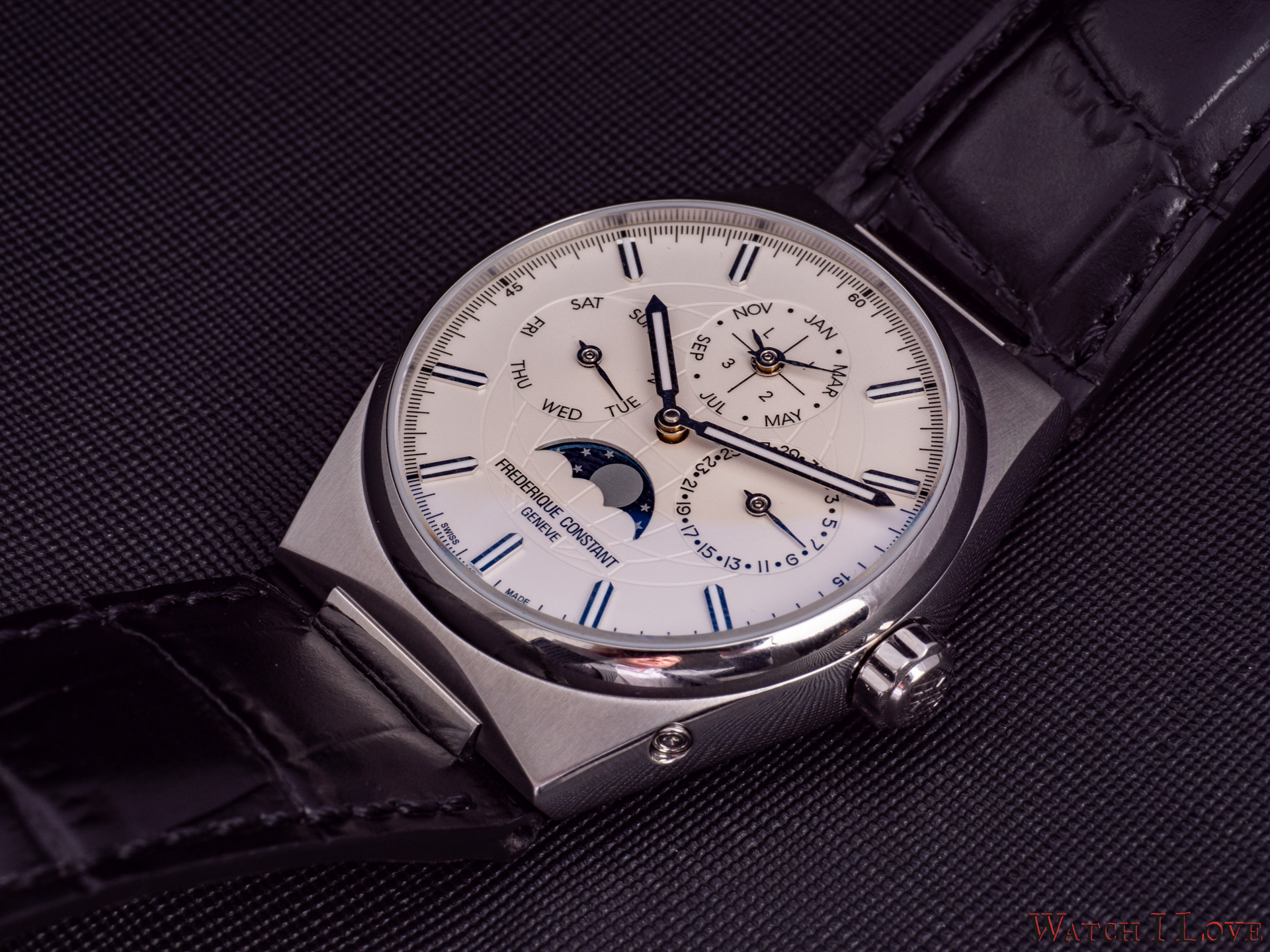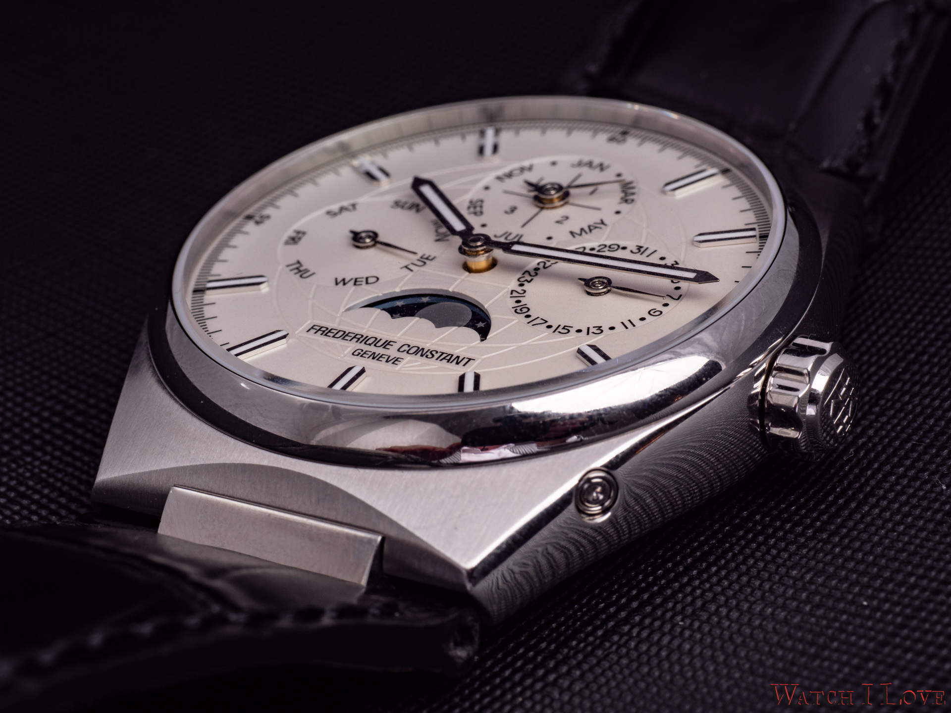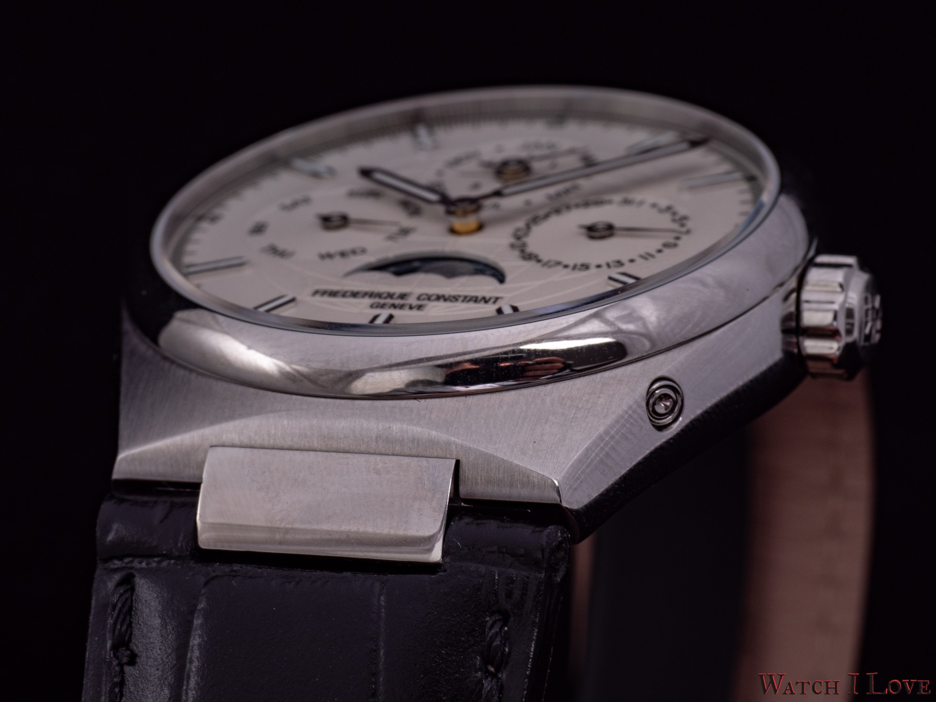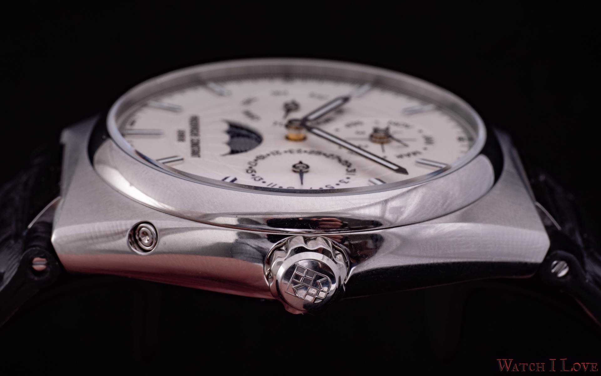 On the sides, we find the steel crown with the embossed logo and the pushers. I talked with Niels Eggerding, Managing Director at Frederique Constant, about the difficulties encountered by R&D with the integration of the pushers. Due to the curvature of the case and size of the movement, it was found the best compromise between appearance, manufacturing possibilities and costs.