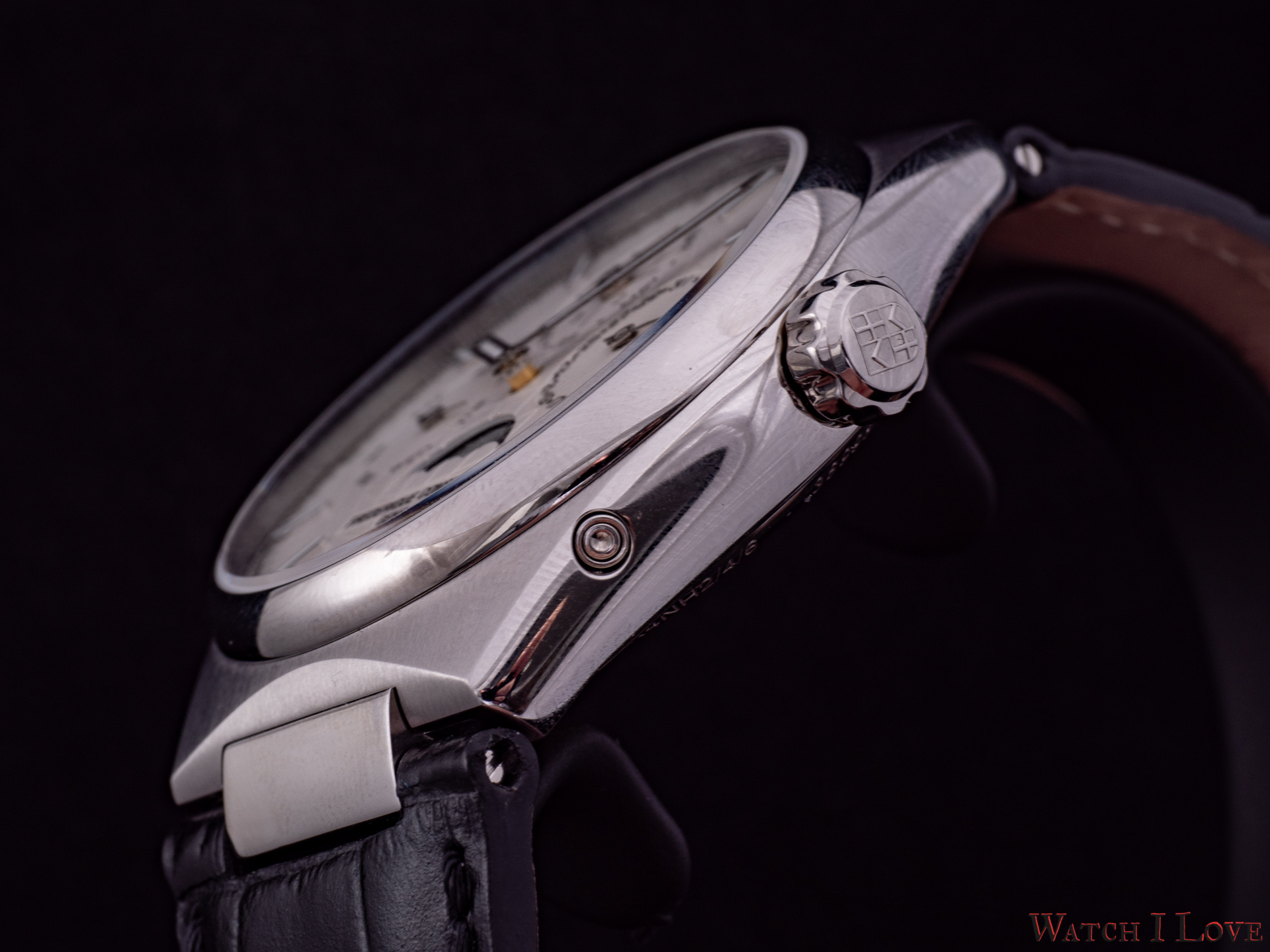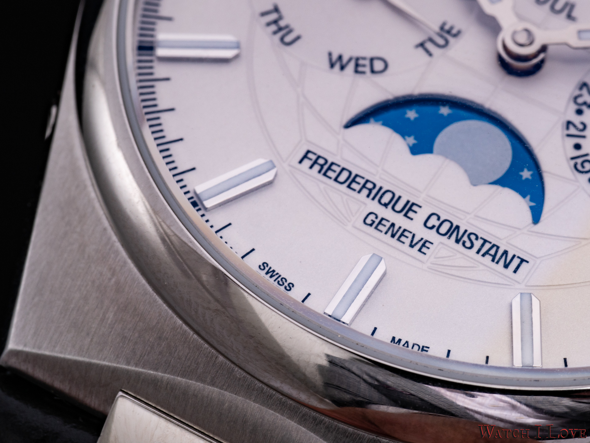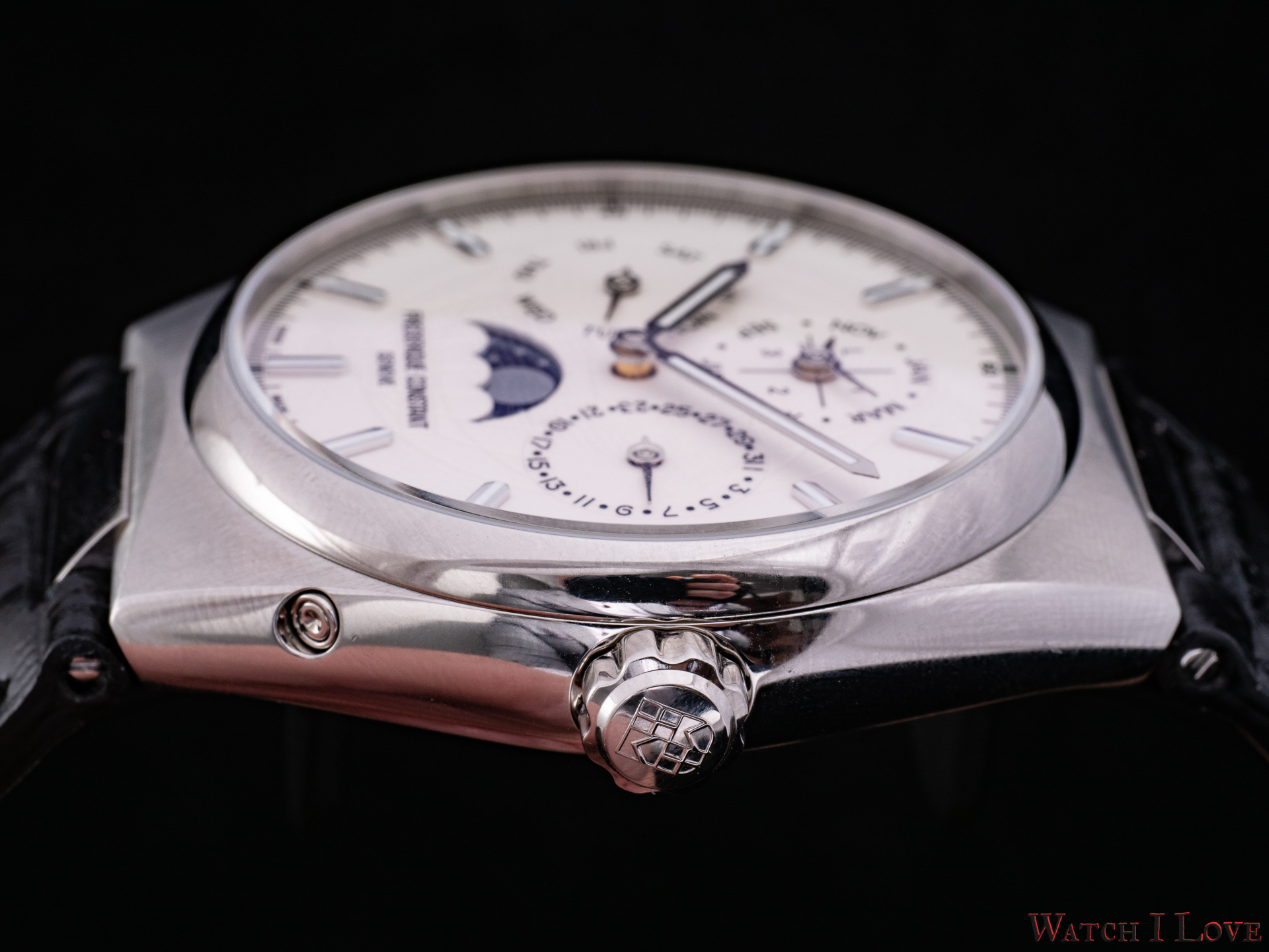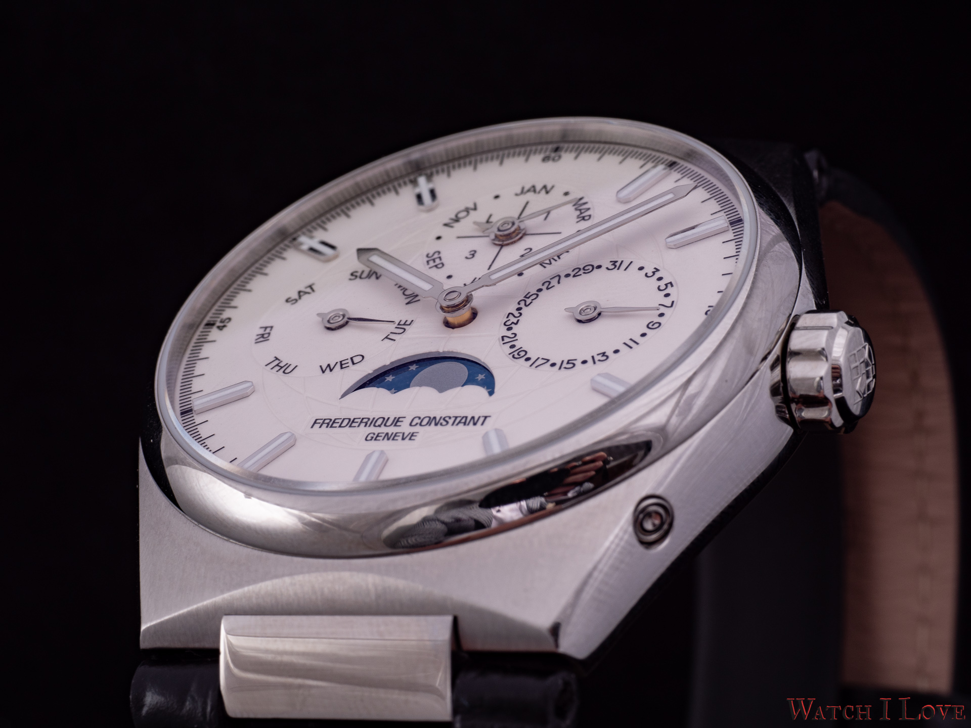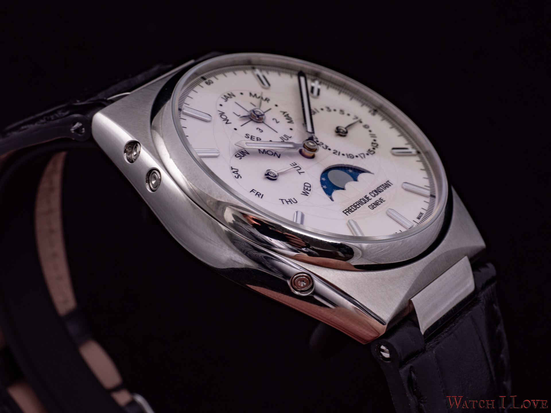 On the sides, we find the steel crown with the embossed logo and the pushers. I talked with Niels Eggerding, Managing Director at Frederique Constant, about the difficulties encountered by R&D with the integration of the pushers. Due to the curvature of the case and size of the movement, it was found the best compromise between appearance, manufacturing possibilities and costs.