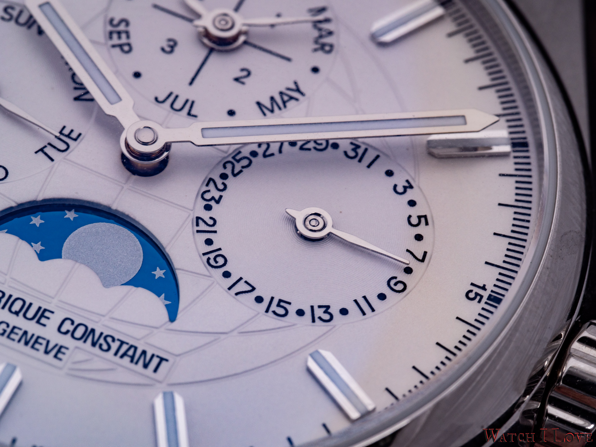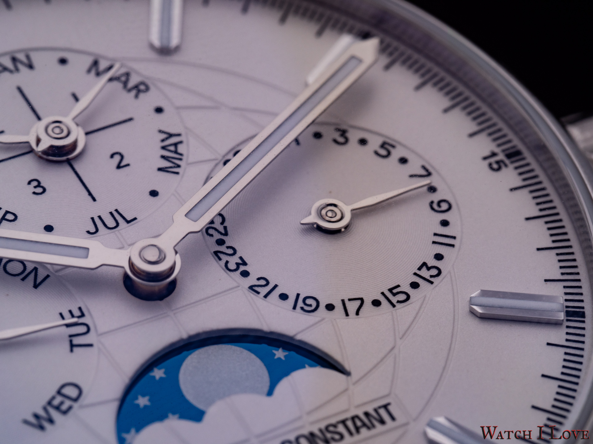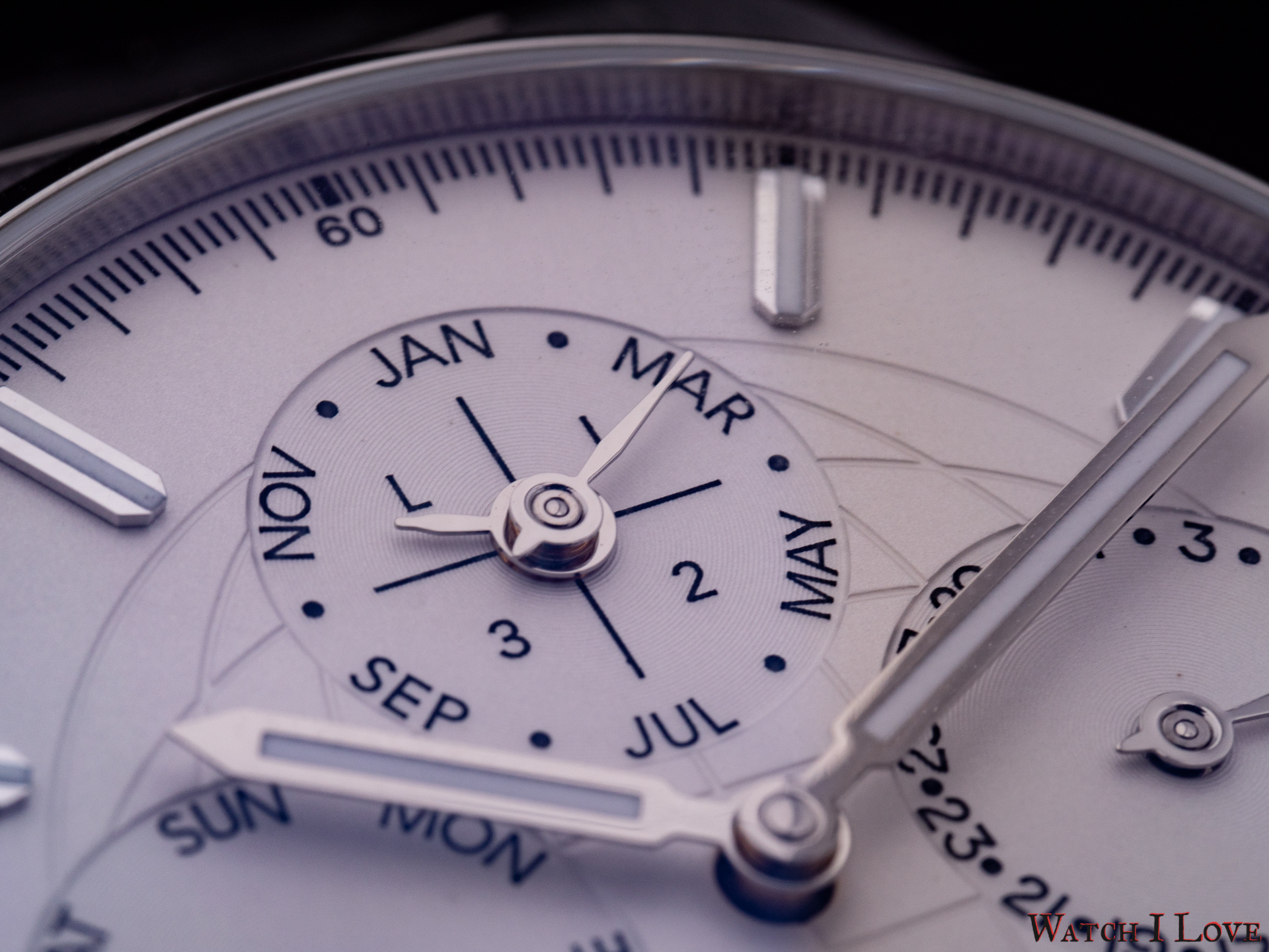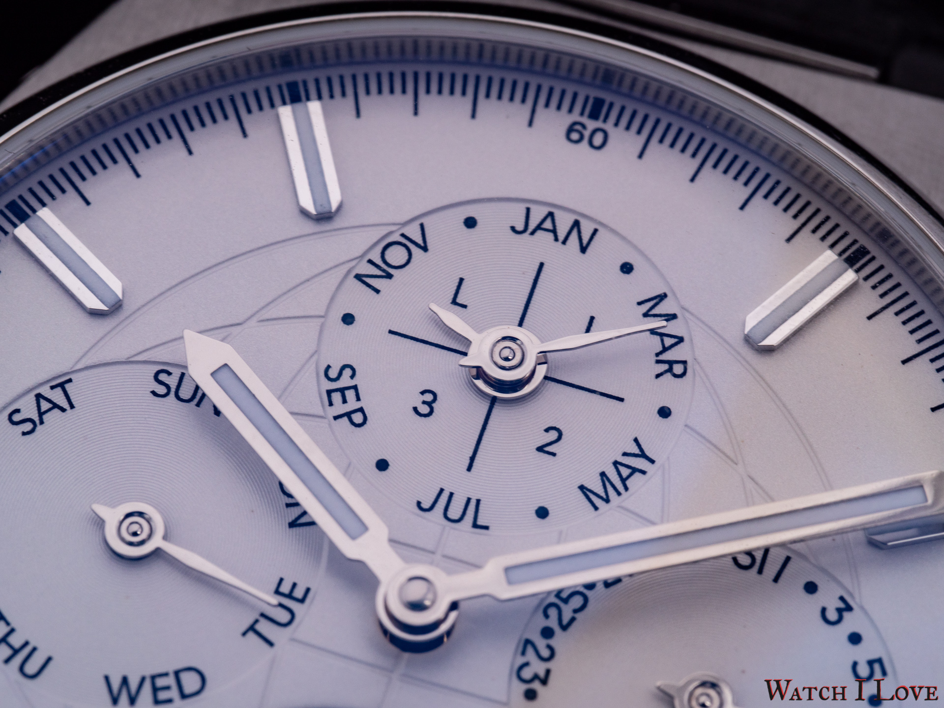 The 6 o’clock moonphase uses a “silver on blue” scheme and is identical on all dial colour variation. The name of the brand was moved from the traditional 12 o’clock position to the lower side of the dial, between the moonphase and the hour index.