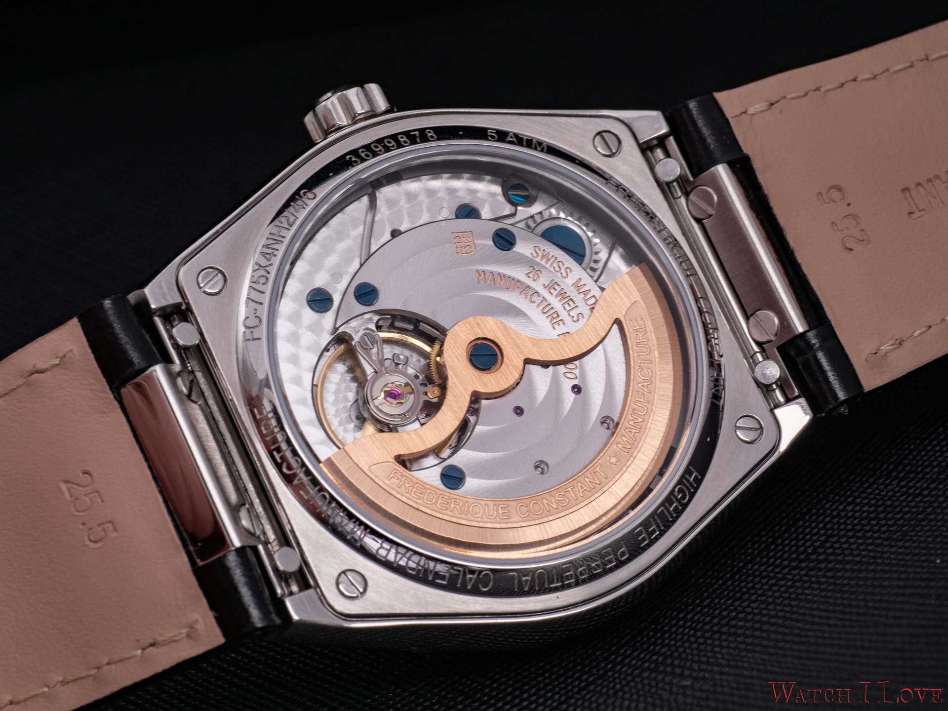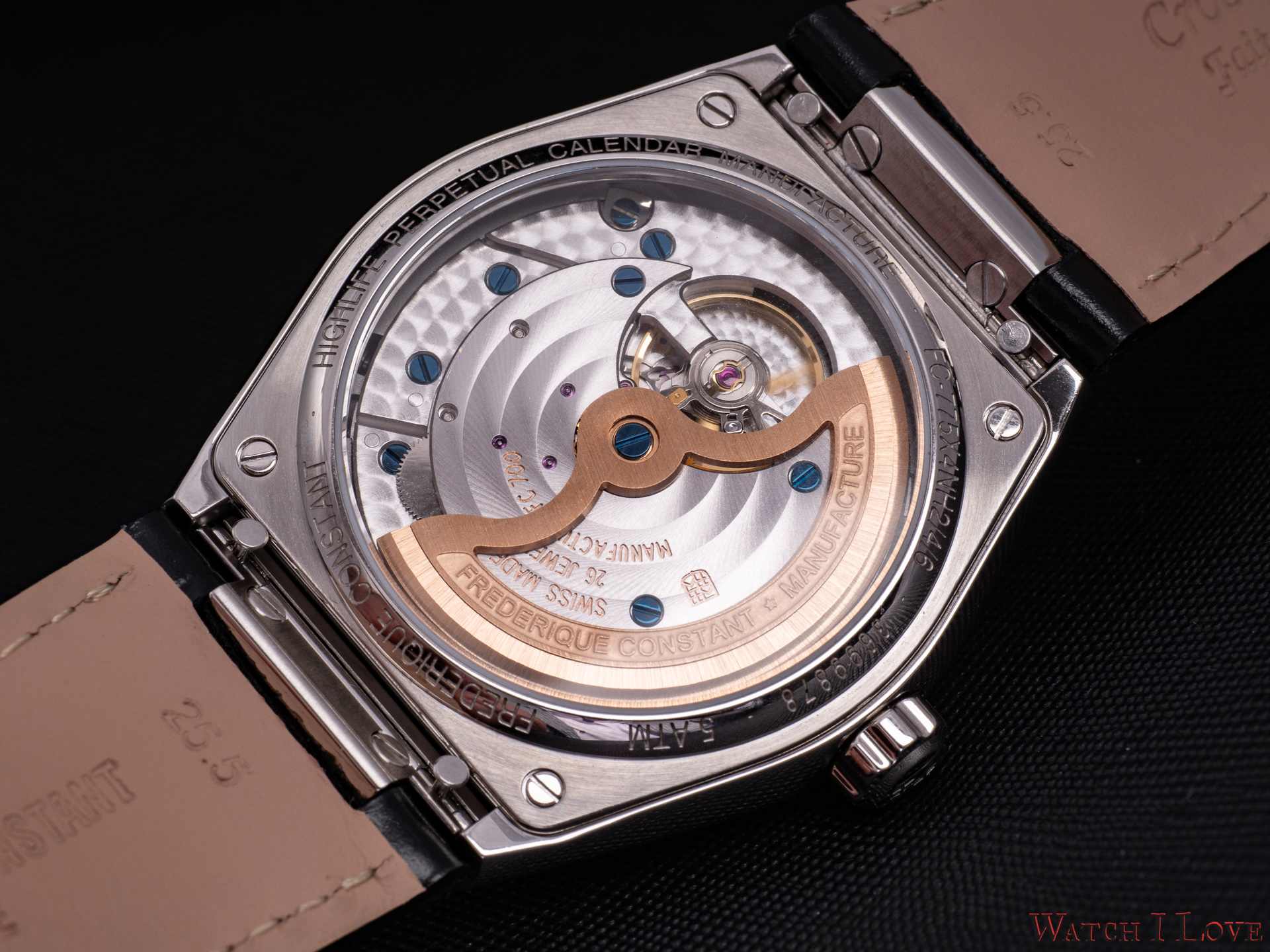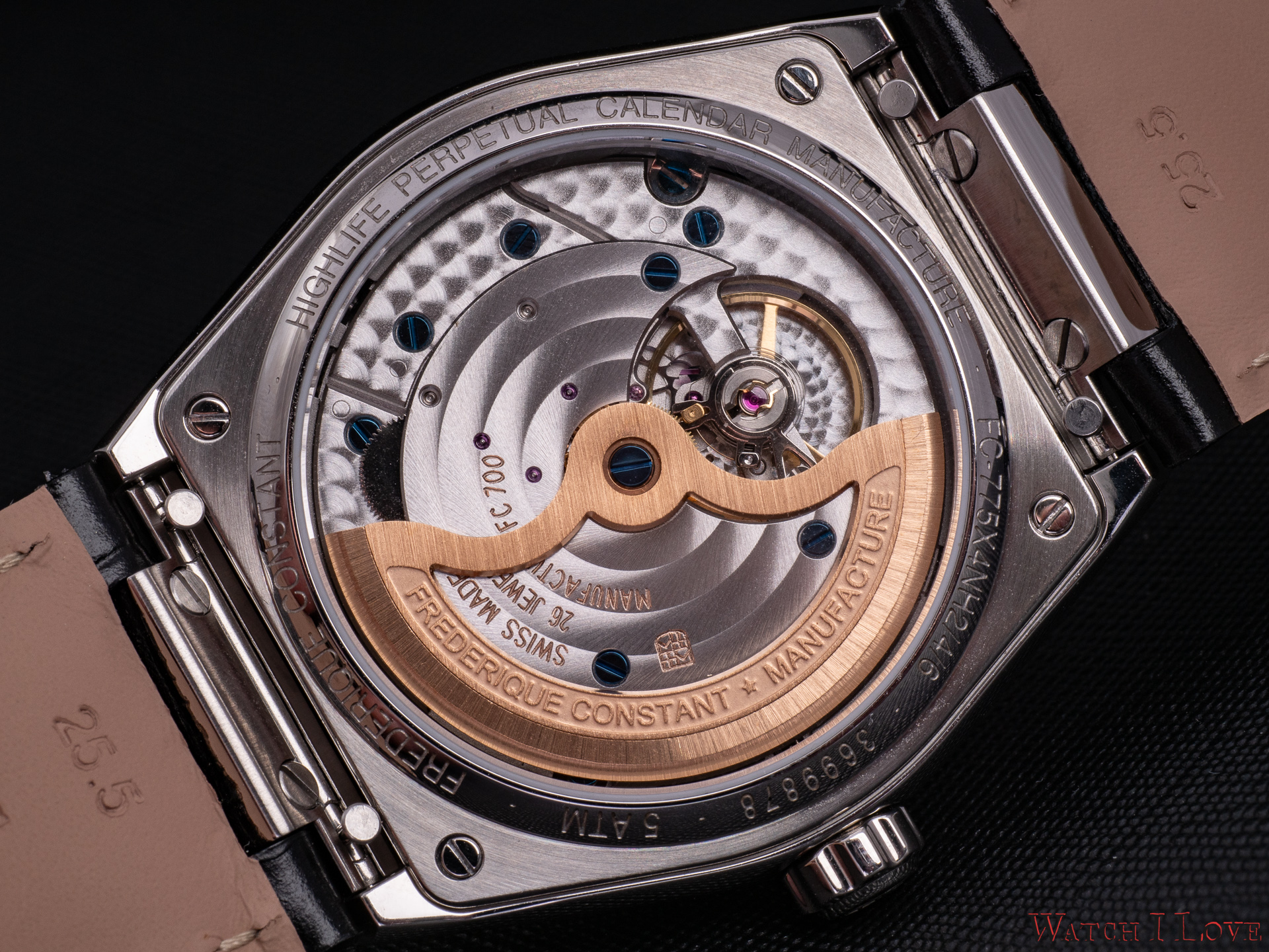 Since some years, Frederique Constant manages to fit in-house calibres to their watches. The movements bear similarities in construction and decoration, which is expected. The Highlife Perpetual Calendar Manufacture is powered by the Calibre FC-775, a movement familiar from their Slimline Perpetual Calendar Manufacture. We find similarities also with the tourbillon version of the perpetual calendar Calibre FC-975. So we can notice the platform used, one of the key features needed for sustainability and affordability.