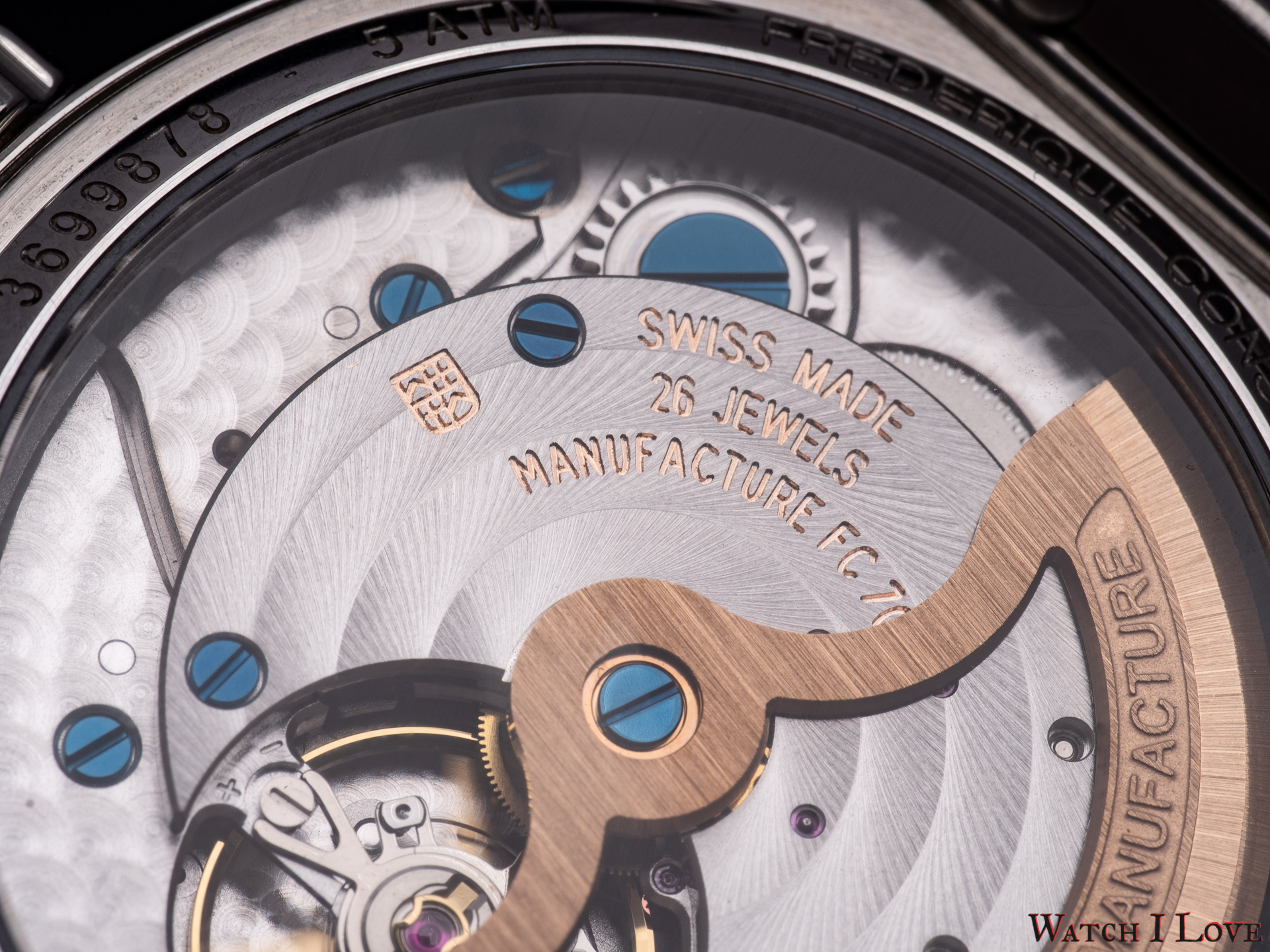 The Frederique Constant movements are part of the brands signature. The decorations feature circular Côtes de Genève on the bridges and a perlage background, blue screws and the skeletonised gold plated rotors weight. On the technical note, the FC-775 squeeze 38 hours of power reserve from a single barrel with the help of the 4 Hz regulator.