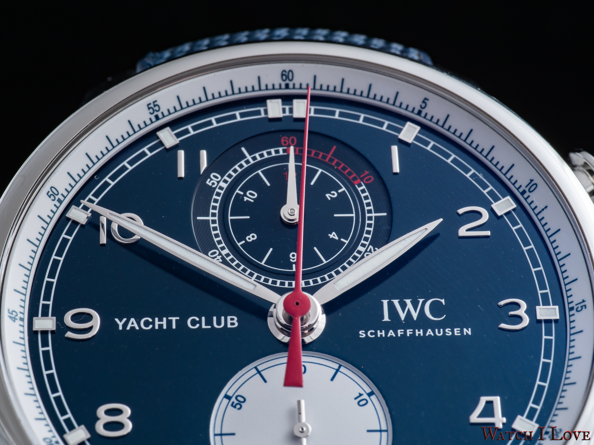 The IWC Yacht Club “Orlebar Brown” has a gorgeous dial combining bleu-marine, white and red. With a vertical layout, the watch has a handsome face. The 12 o’clock areal presents the 60 minutes and 12 hours chronograph totaliser. The stepped down sub-dial presents two registers: the minutes counter on a circular pattern with white and red printing; the hours’ counter is central with printing on a flat surface. The elements are well delimited and offer good legibility. The chronograph’s seconds indication is realised with a central red hand that runs against the white inner bezel with blue printing.