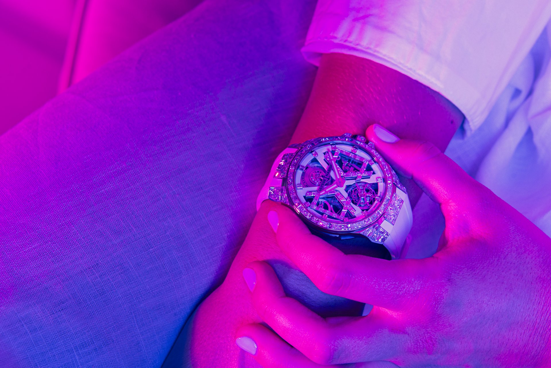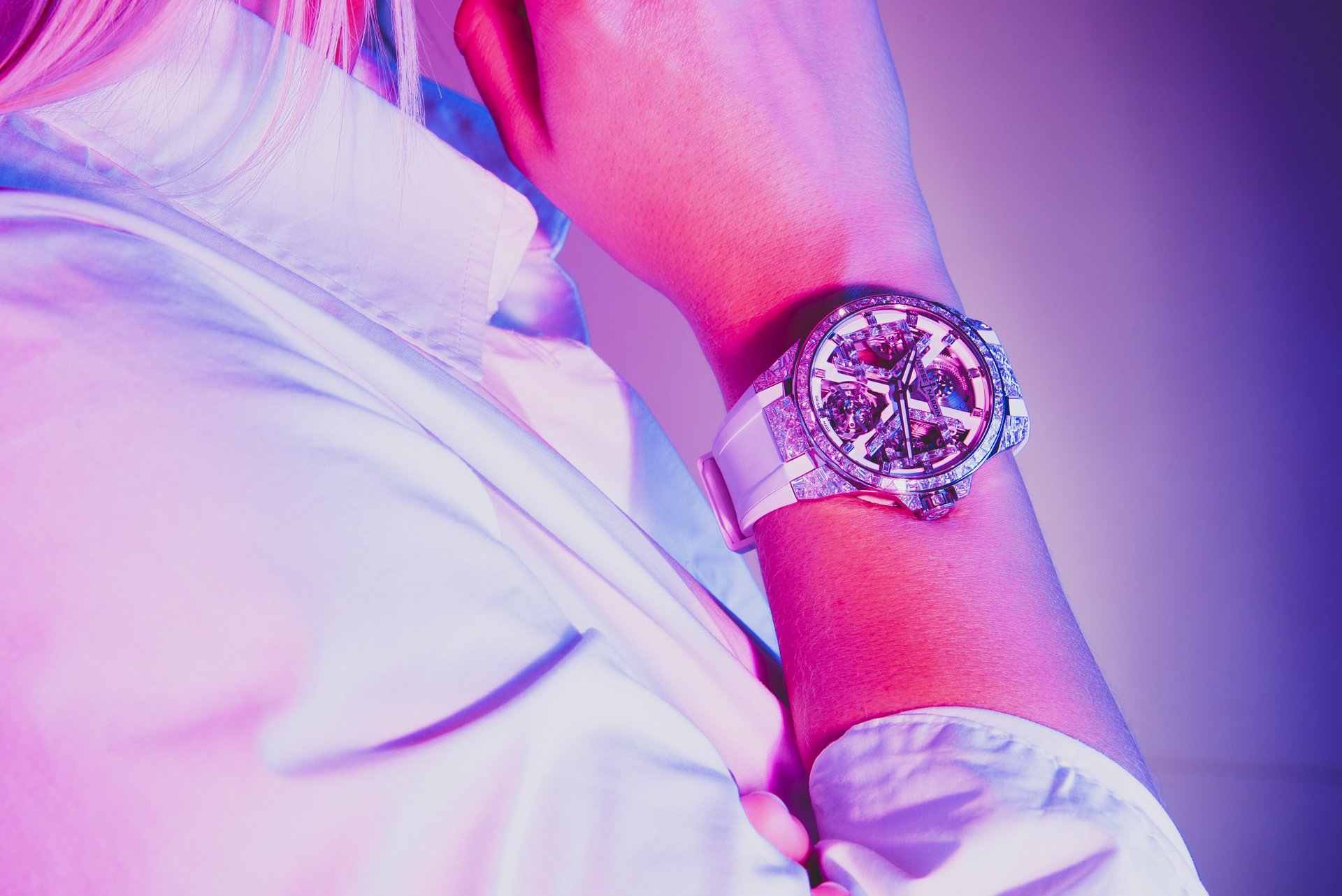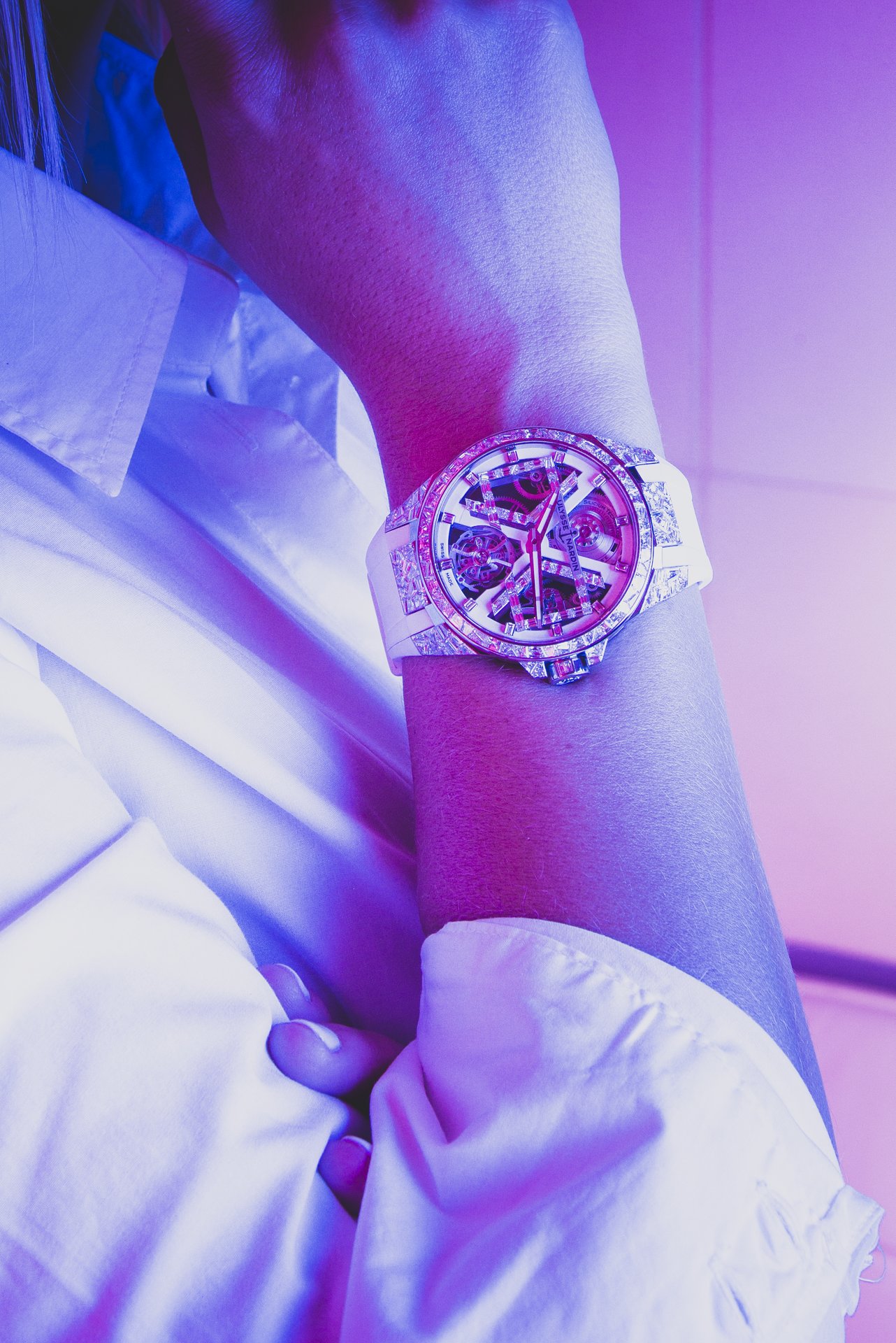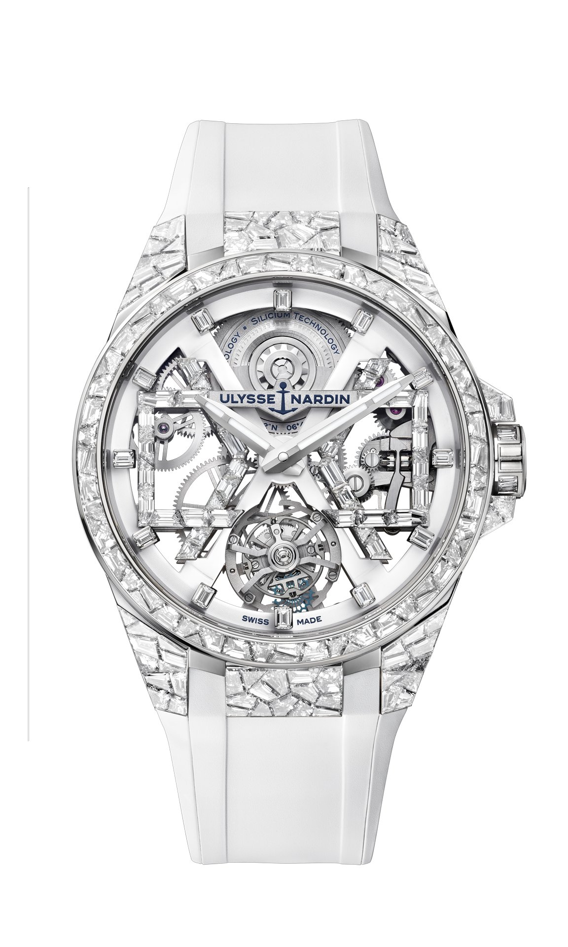 Imagine an eruption of light radiating from a sea of broken glass, the sun glinting in infinite rays emanating from the brilliance of the SPARKLING BLAST. The delicate movement of the watch is visible through the face, a tour de force of skeletonized handiwork perfected over a century and a half of master craftsmanship at Ulysse Nardin. A shot of light flowing from your wrist – this is the new Ulysse Nardin SPARKLING BLAST limited edition, created in an exclusive, exceptional and selective edition; three in white gold with a white rubber strap and three in white gold with a deep blue, alligator strap; each model is limited to three watches.