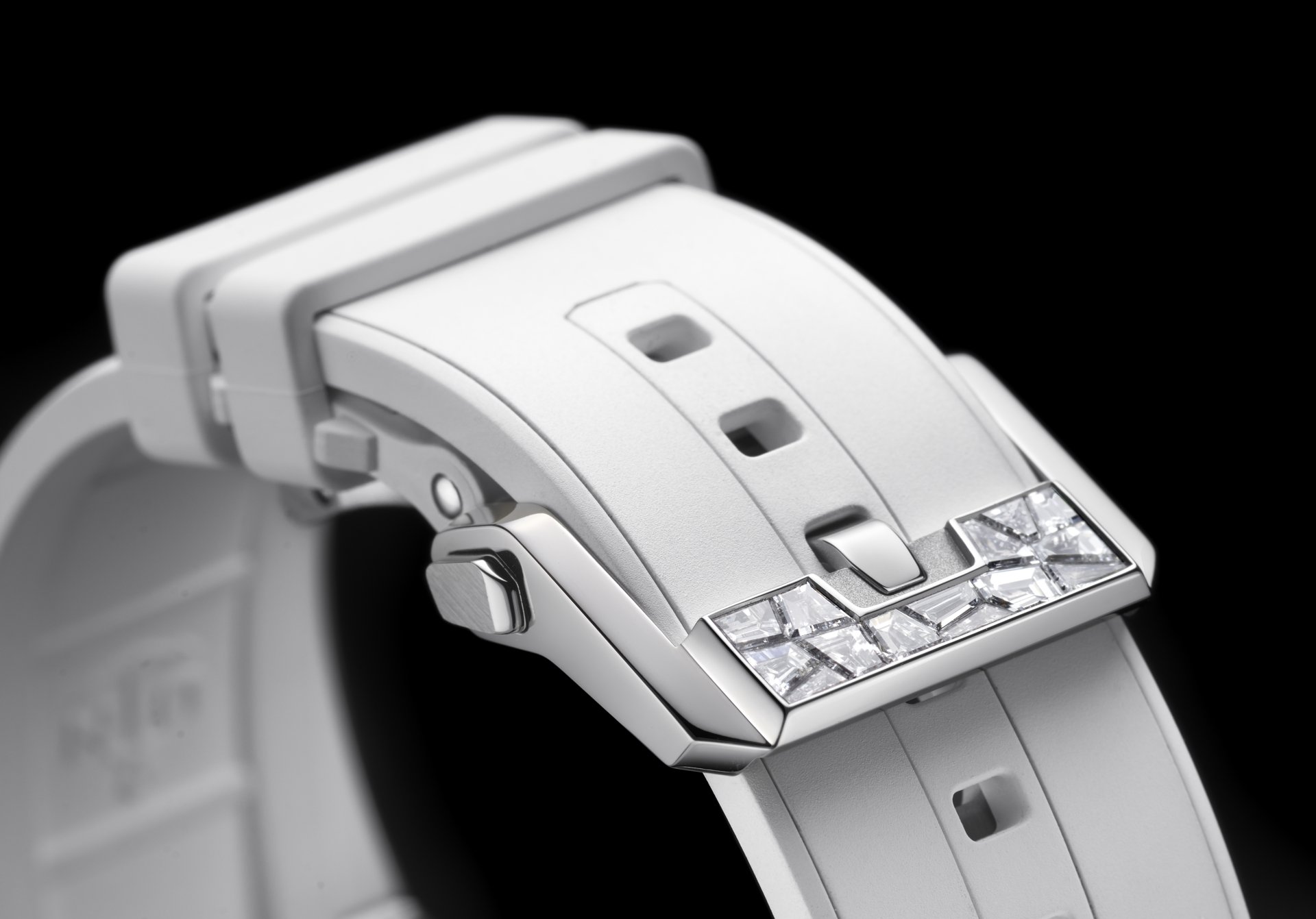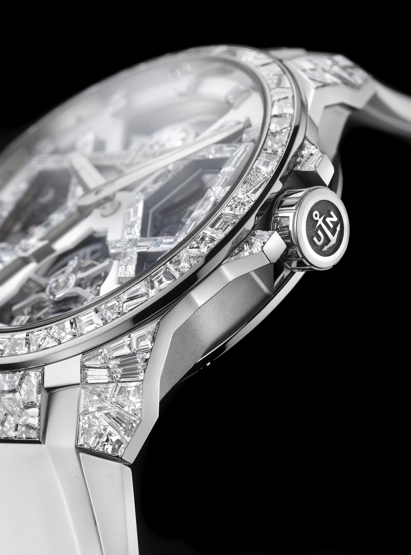 The architecture of the watch horns lends itself perfectly to the diamonds set within it. Like a geometrical mind game, they come together to form a breathtaking mosaic. The SPARKLING BLAST merits its place in the sun. The designers at Ulysse Nardin fashioned the horns after a stealth aircraft, which has a sleek design conceived with stealth technology to avoid detection. These shapes lend themselves expertly to the “broken mirror effect” generated when they are faceted with diamonds. Angular, sharp, triangular and risqué, the idea for this new style grew quickly in the Ulysse Nardin workshops. The idea was to create an exceptional watch that was also a piece of jewellery on the wrist. This is the King of BLASTS, a talking timepiece that lands into a conversation like an atomic bomb, creating shockwaves of cracked diamonds in its cosmic setting.