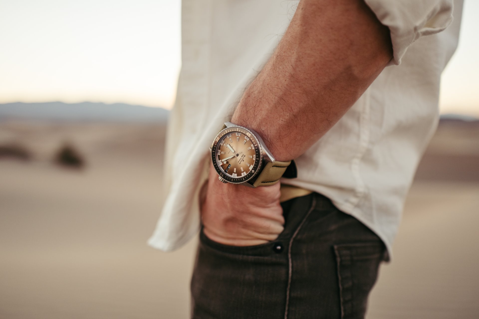 Blancpain presents a new version of the Fifty Fathoms Bathyscaphe Day Date watch – the Blancpain Fifty Fathoms Bathyscaphe Day Date Desert Edition. This 500-piece limited-edition model inspired by a Blancpain diver’s watch from the 1970s is characterised by a gradient-coloured sandy beige dial featuring a sunburst pattern. This nuance evokes the desert, and more specifically Death Valley in the United States, where Ernest H. Brooks II, a pioneer of underwater photography and contributor to the Edition Fifty Fathoms project, made a spectacular dive in 1962.