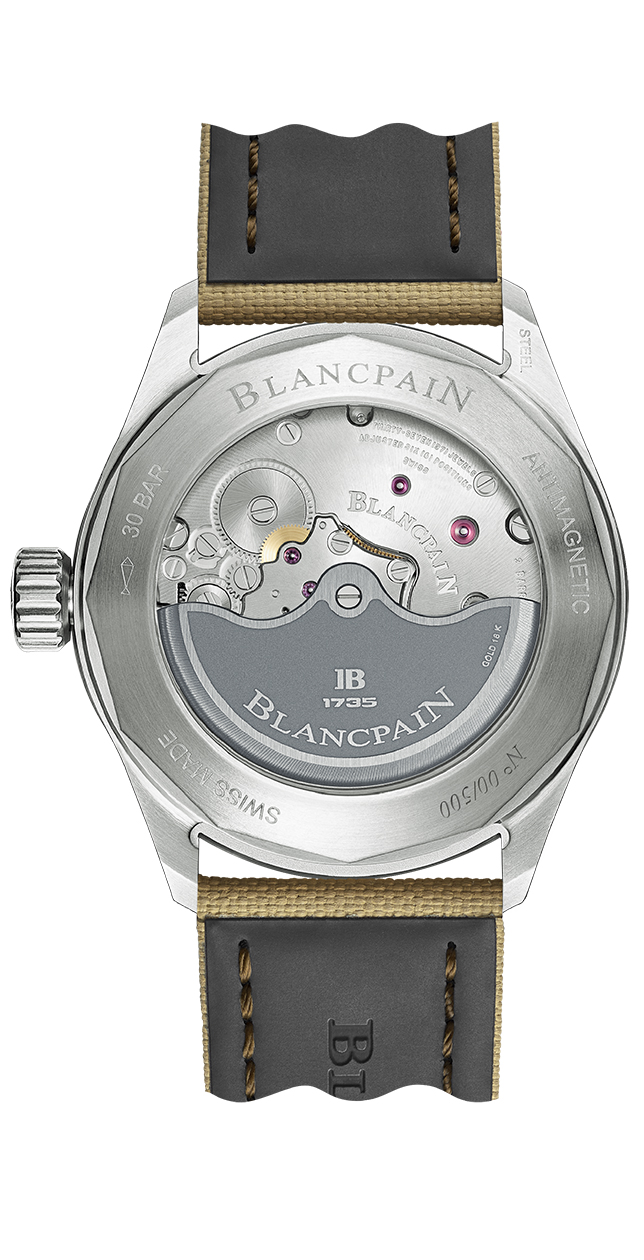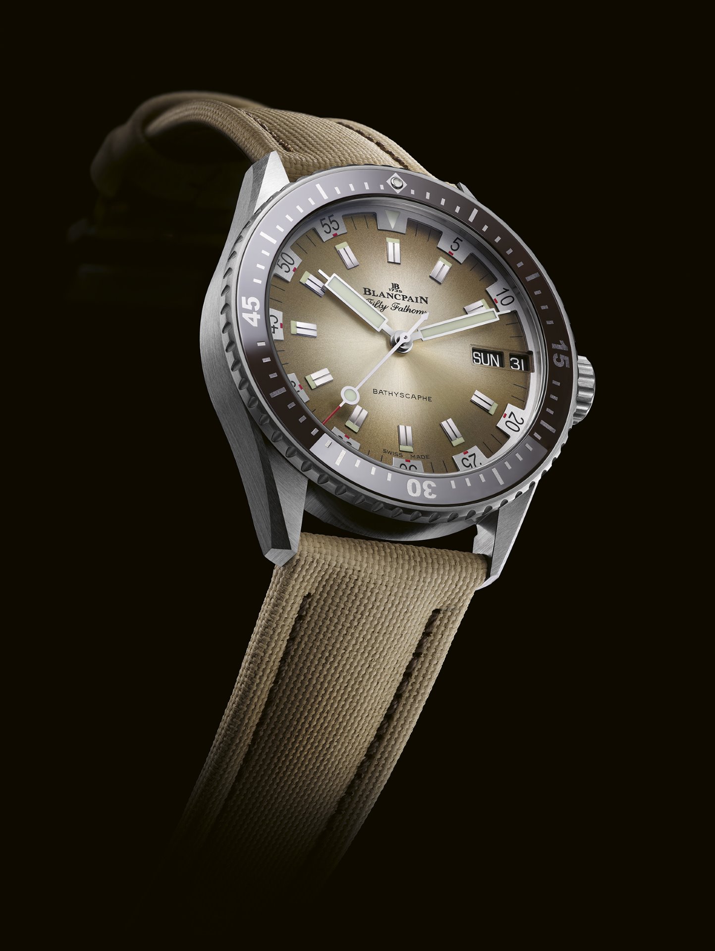 Issued in a 500-piece limited series, the Blancpain Fifty Fathoms Bathyscaphe Day Date Desert Edition model comes with a sandy-coloured sail canvas strap matching the warm tones of the dial.