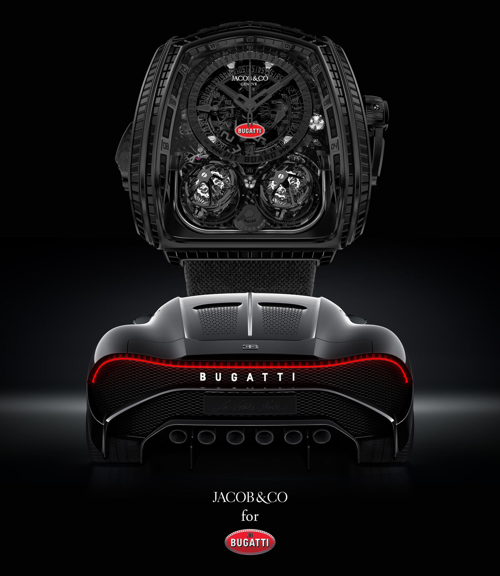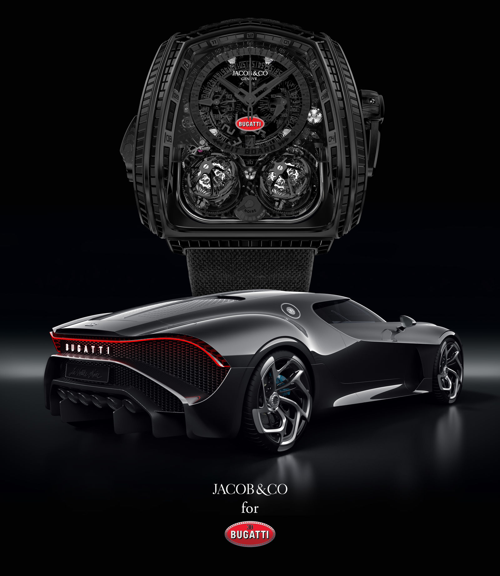 Unique and mystical. The famous Bugatti Type 57 SC Atlantic from the 1930s is considered amongst experts to be a masterpiece of automotive engineering. Only four vehicles were hand-built between 1936 and 1938. The fourth car built, Jean Bugatti’s private vehicle, disappeared without a trace around 1938. It is not clear whether Jean Bugatti sold the car to a racing driver friend or whether, as a more probable scenario, it was sent to a safe region when the German army invaded Alsace in 1940. To honour this new hyper sports car and the legend of the original, Jacob & Co. is introducing the one-off Bugatti x Jacob & Co. Twin Turbo Furious La Montre Noire Bugatti.